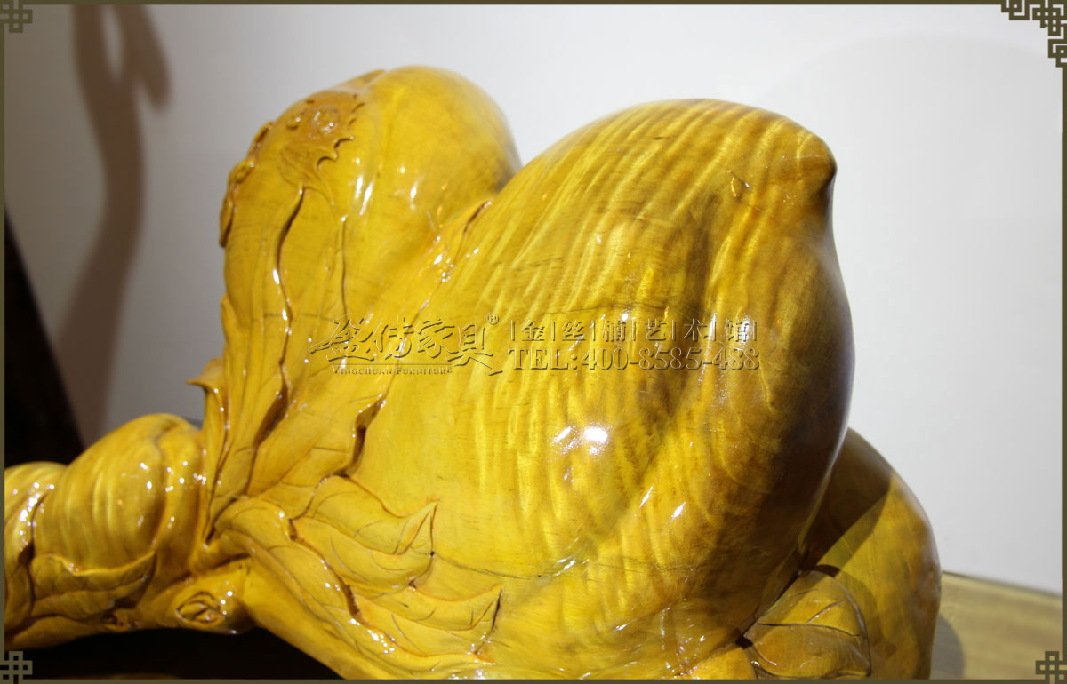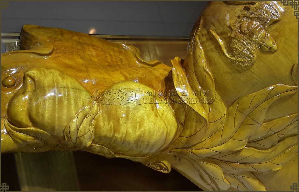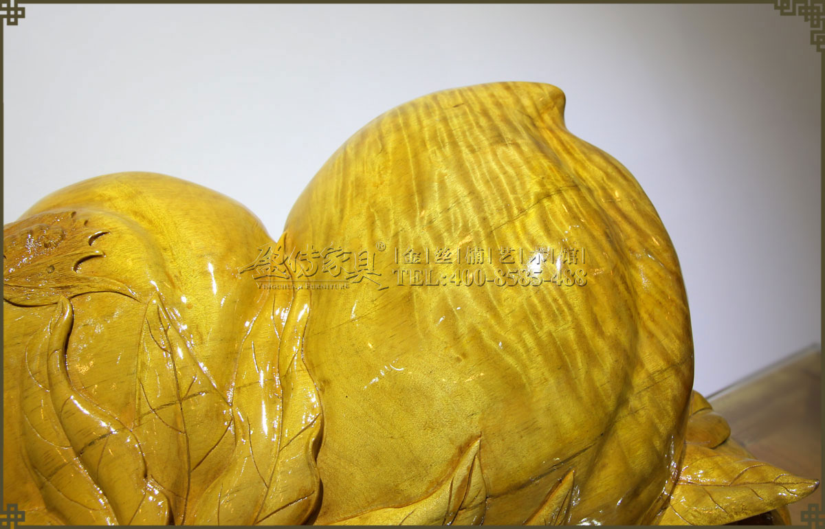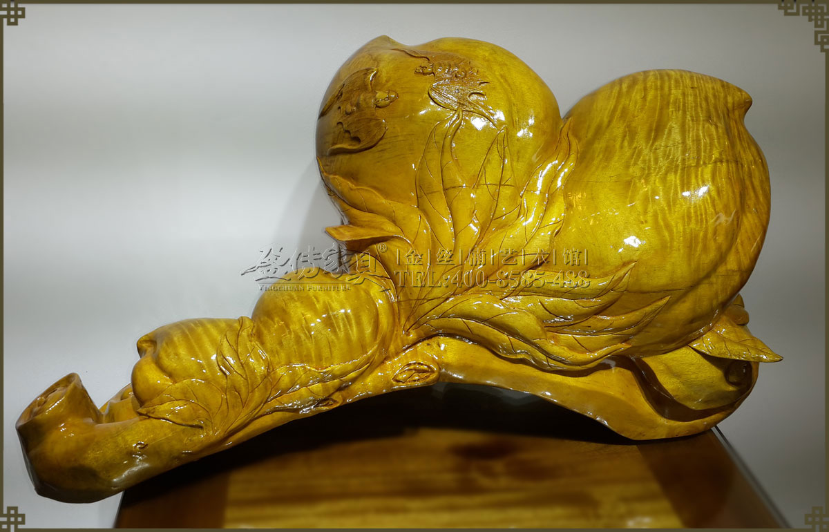 此金絲楠壽桃藝術擺件極為漂亮,枝葉、果實疏密鄉間、錯落有致,造型厚重結實,形態飽滿大氣,表現出旺盛的生命力。層次分明的水波紋有很強的立體感,清晰獨特,不同的光線下有著千變萬化的光影效果,魅力四射。光滑柔潤的手感,讓人愛不釋手。