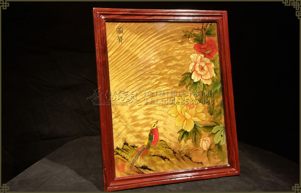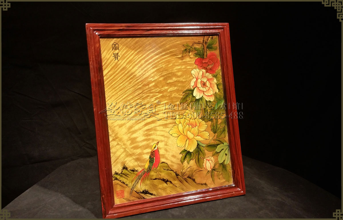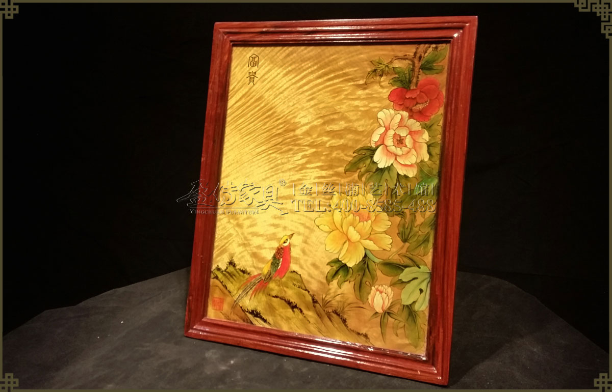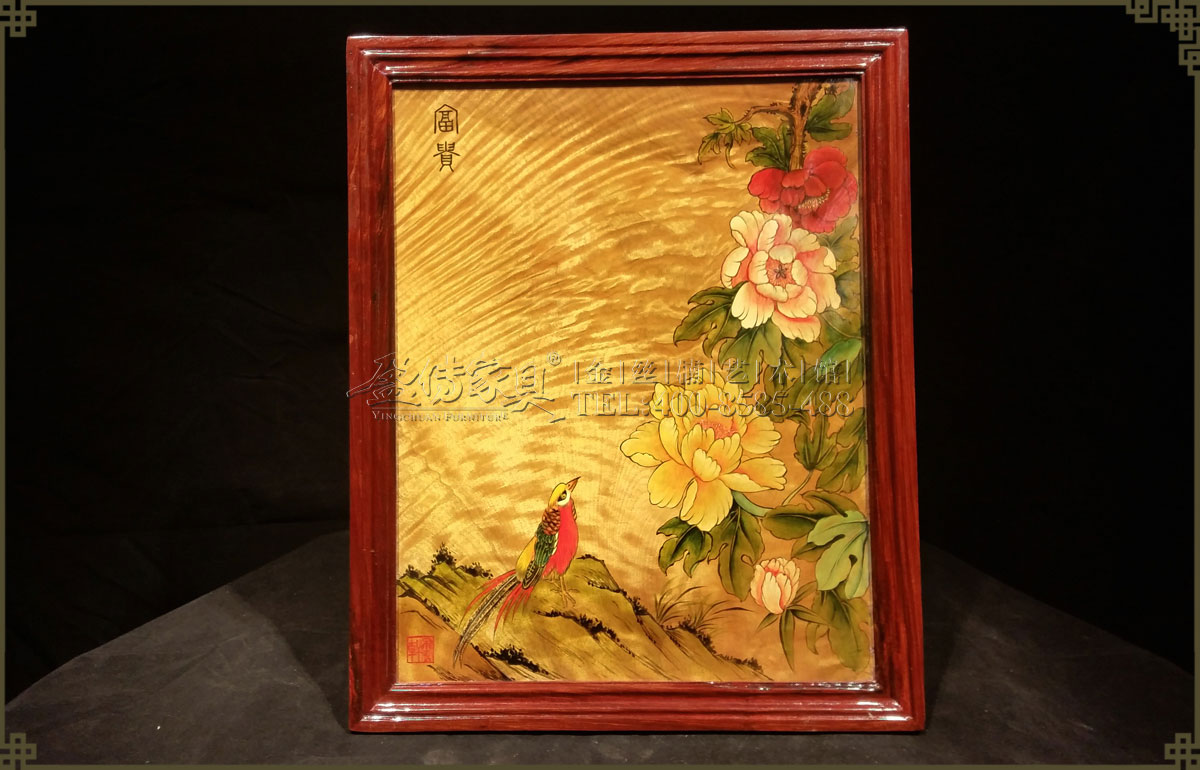 畫(huà)中盛開(kāi)的朵朵牡丹色彩艷麗,繁花似錦,傾國(guó)傾城,高貴大方。錦雞精細(xì)逼真,鉤線(xiàn)細(xì)柔流暢。金絲楠天然的水波紋眩美漂亮,在畫(huà)中充當(dāng)天然的天空、霞光,整個(gè)畫(huà)面營(yíng)造出喜慶歡快、吉祥富貴的氣息,令人賞心悅目,滿(mǎn)足了皇室的審美需求,突顯大氣尊貴品位。