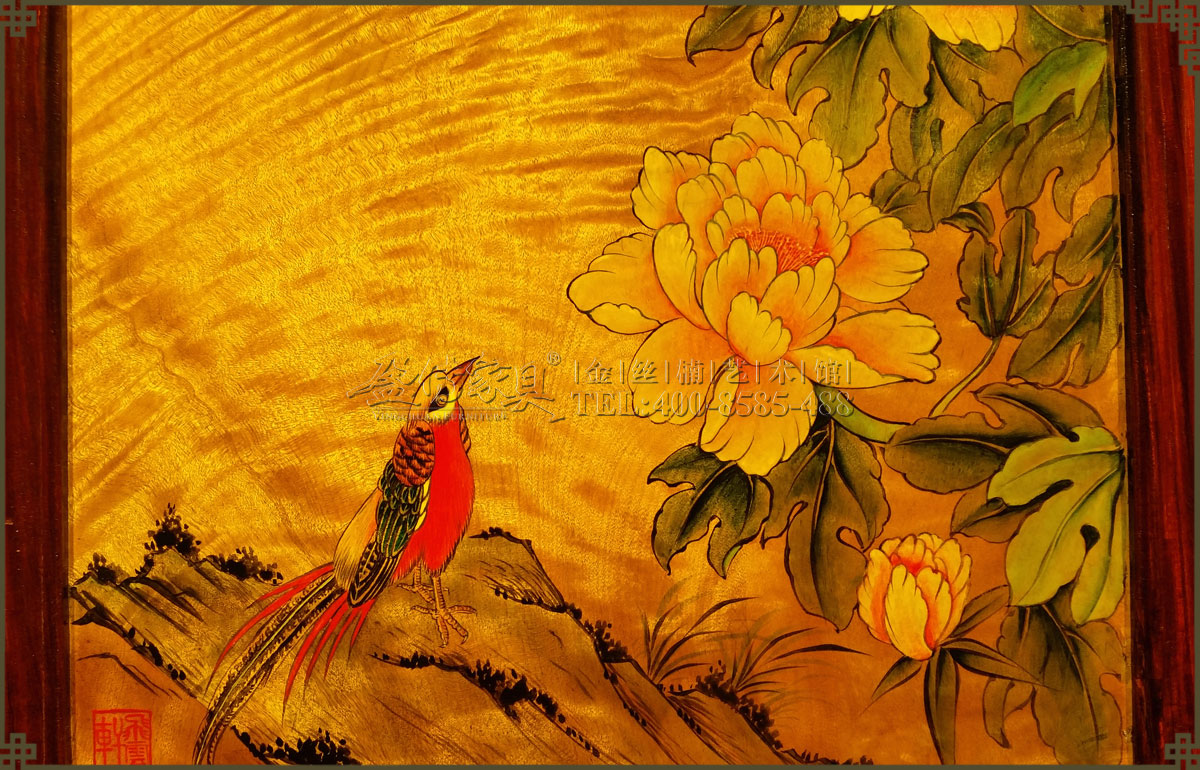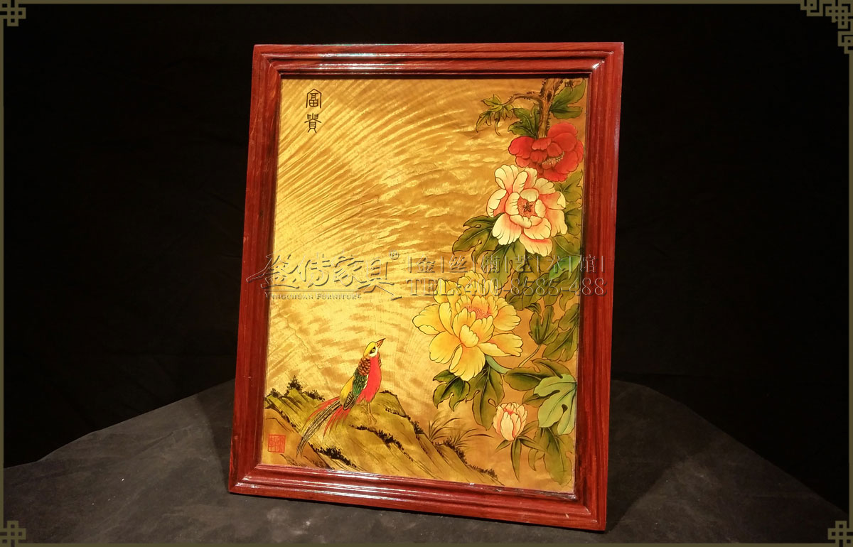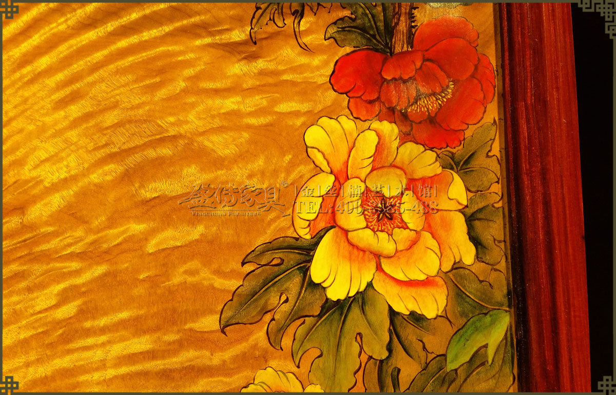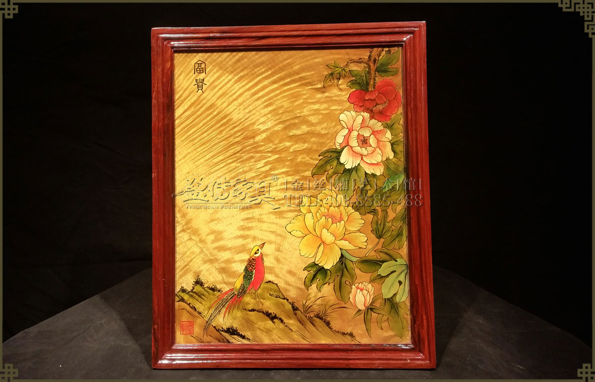 畫(huà)中盛開(kāi)的朵朵牡丹色彩艷麗,繁花似錦,傾國(guó)傾城,高貴大方。錦雞精細(xì)逼真,鉤線(xiàn)細(xì)柔流暢。金絲楠天然的水波紋眩美漂亮,在畫(huà)中充當(dāng)天然的天空、霞光,整個(gè)畫(huà)面營(yíng)造出喜慶歡快、吉祥富貴的氣息,令人賞心悅目,滿(mǎn)足了皇室的審美需求,突顯大氣尊貴品位。