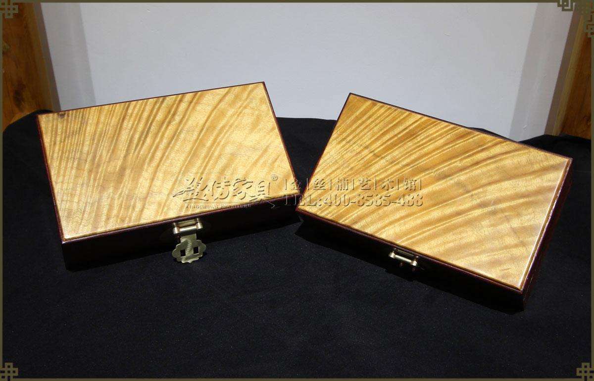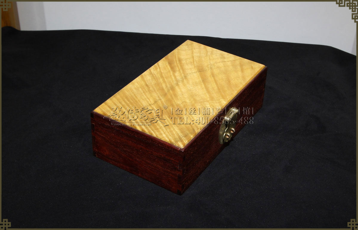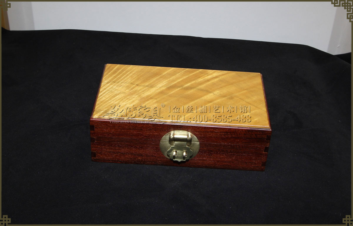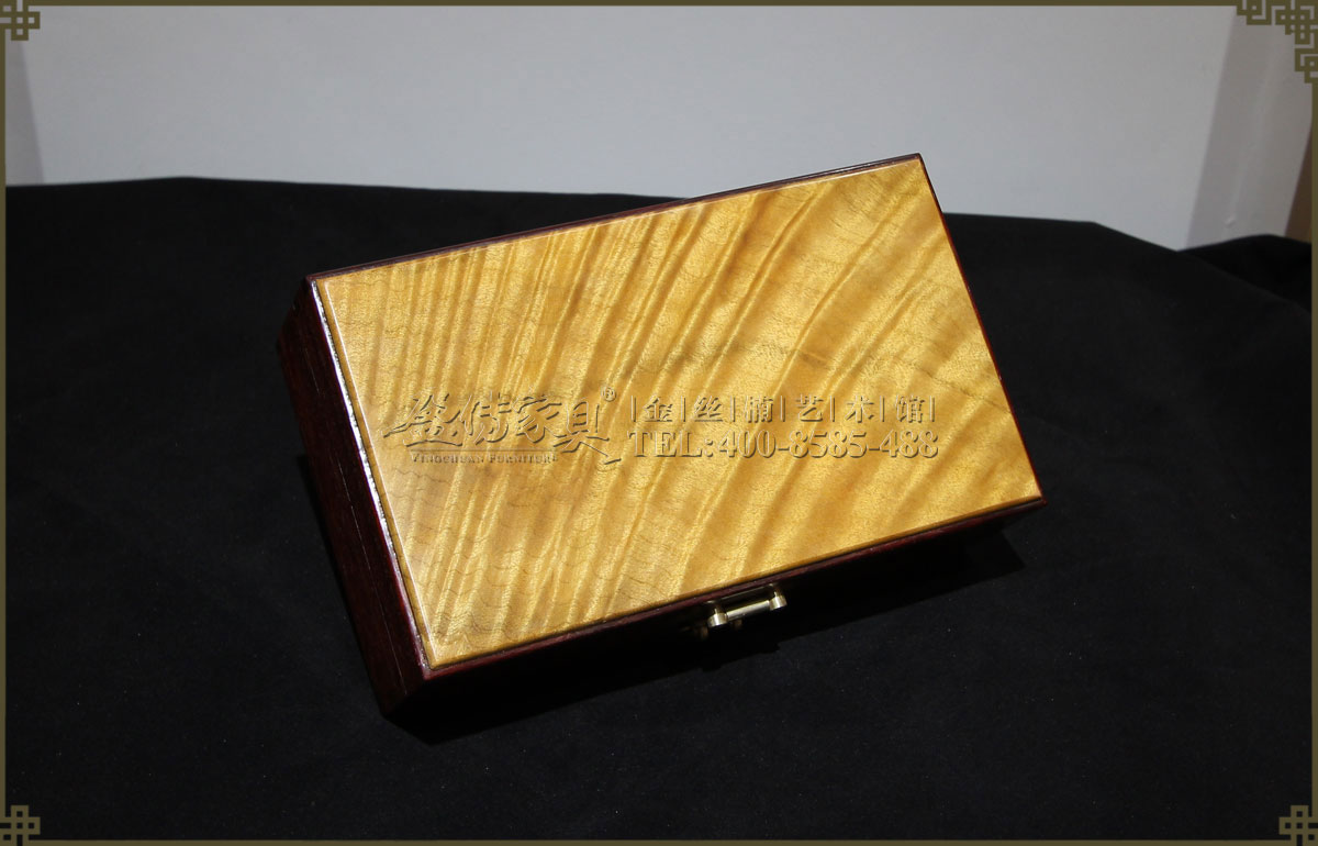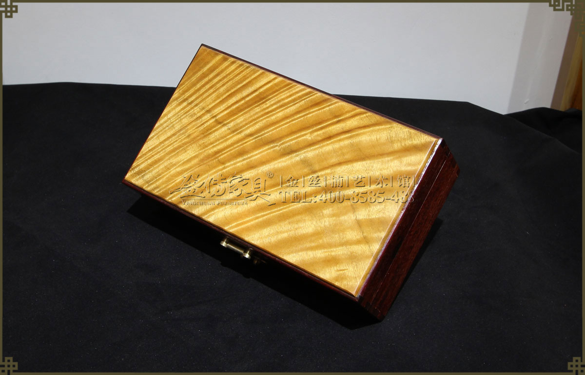 兩種名貴木材的組合,金絲楠面板,其余是小葉紫檀。小葉紫檀為紅木之首,堅(jiān)實(shí)厚重,木質(zhì)細(xì)膩,穩(wěn)定性優(yōu),紋理漂亮,出材率極低,資源奇缺,又有“寸檀寸金”之說。鑲嵌的金絲楠面板是點(diǎn)睛之筆,使首飾盒褶褶生輝,光芒四射,清晰有層次感的水波紋飄逸美麗,美不勝收。