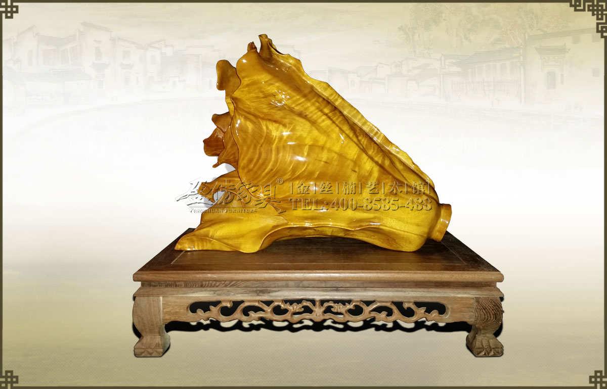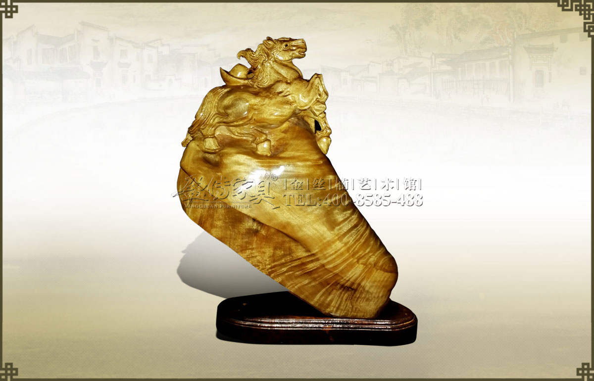 寶馬神韻生動,健碩強(qiáng)壯、揚(yáng)鬃奮蹄,象征勇往直前、奮斗不止、自強(qiáng)不息和鴻運(yùn)。 此金絲楠藝術(shù)擺件造型大氣、做工大氣,雕刻十分精細(xì),線條流暢,一氣呵成,獨(dú)具匠心。紋路精...