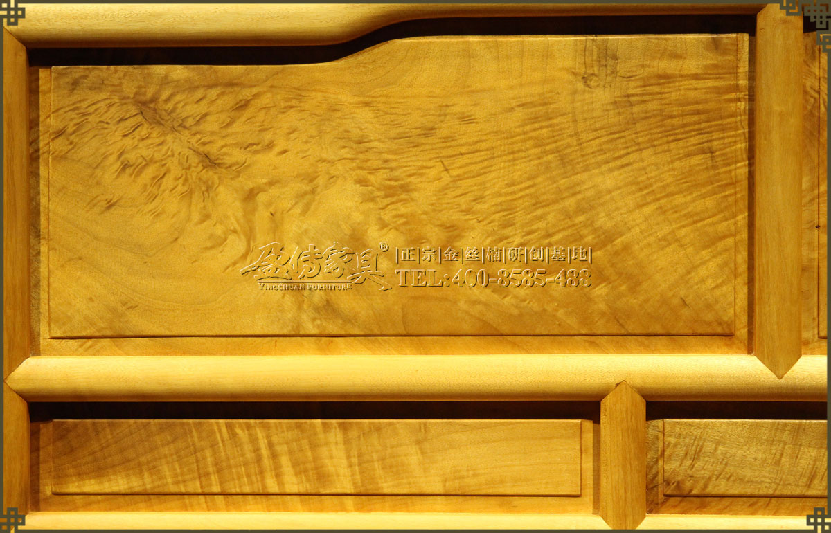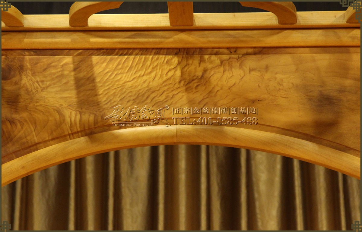 此明式金絲楠月洞床,門罩以三扇拼成,上半為一扇,下半左右各一扇;連同床上兩面的矮圍子及掛檐總共十扇,均以上等金絲楠作為面板,紋路魁麗,用料厚實。