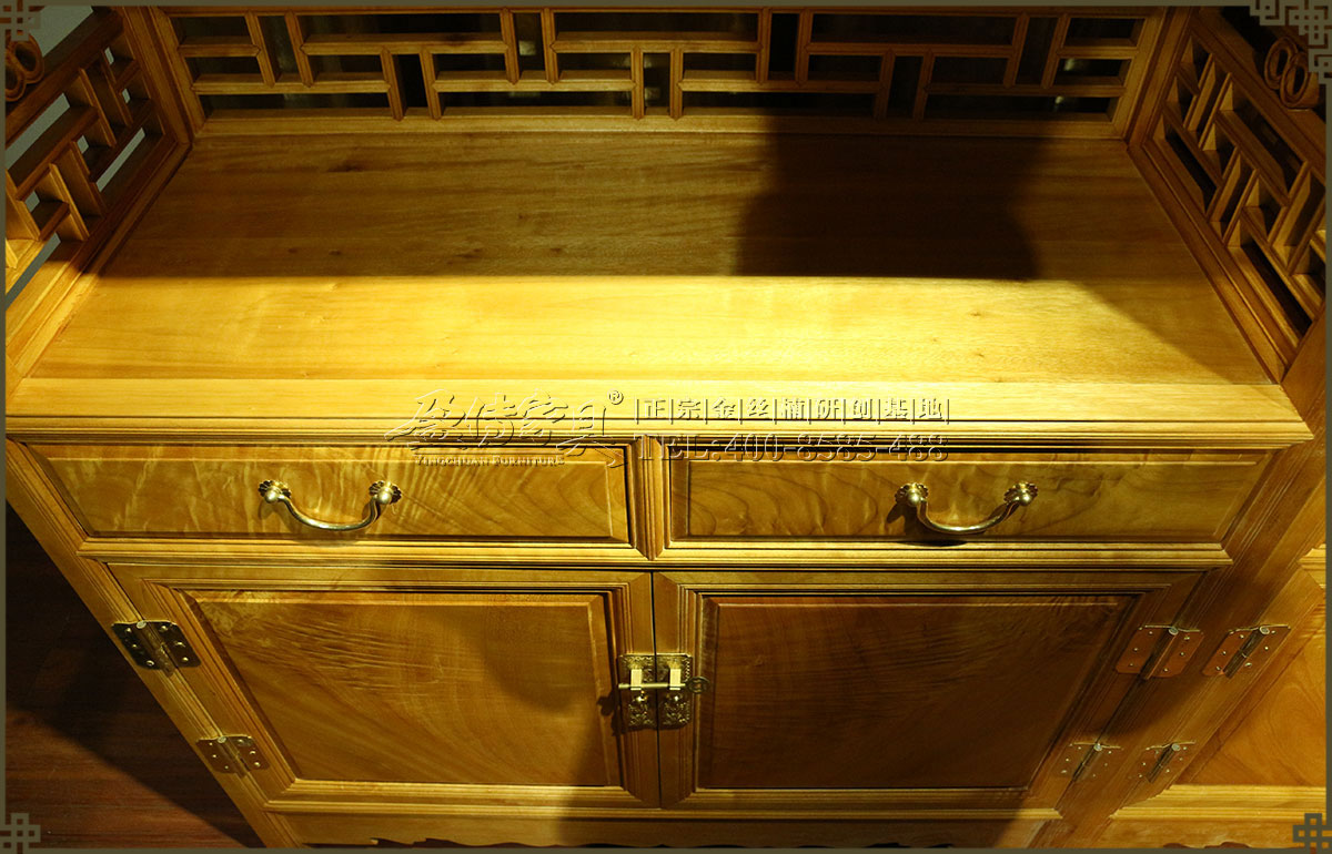 此金絲楠格架專為書房所制。上部分分三層,正面開敞,兩側及背面攢接幾何紋欞格,內置文物,可通風保燥,又可方便觀察,乃明清大家書房必制之器。中間有抽斗,下部分帶柜門,美觀又實用性強。