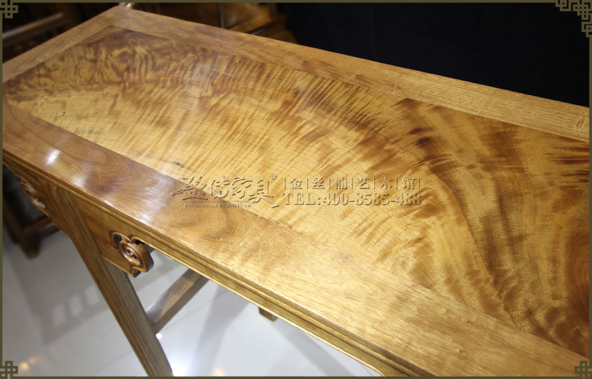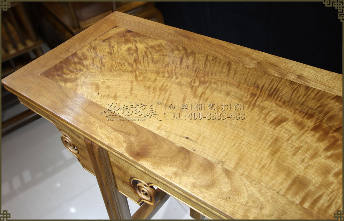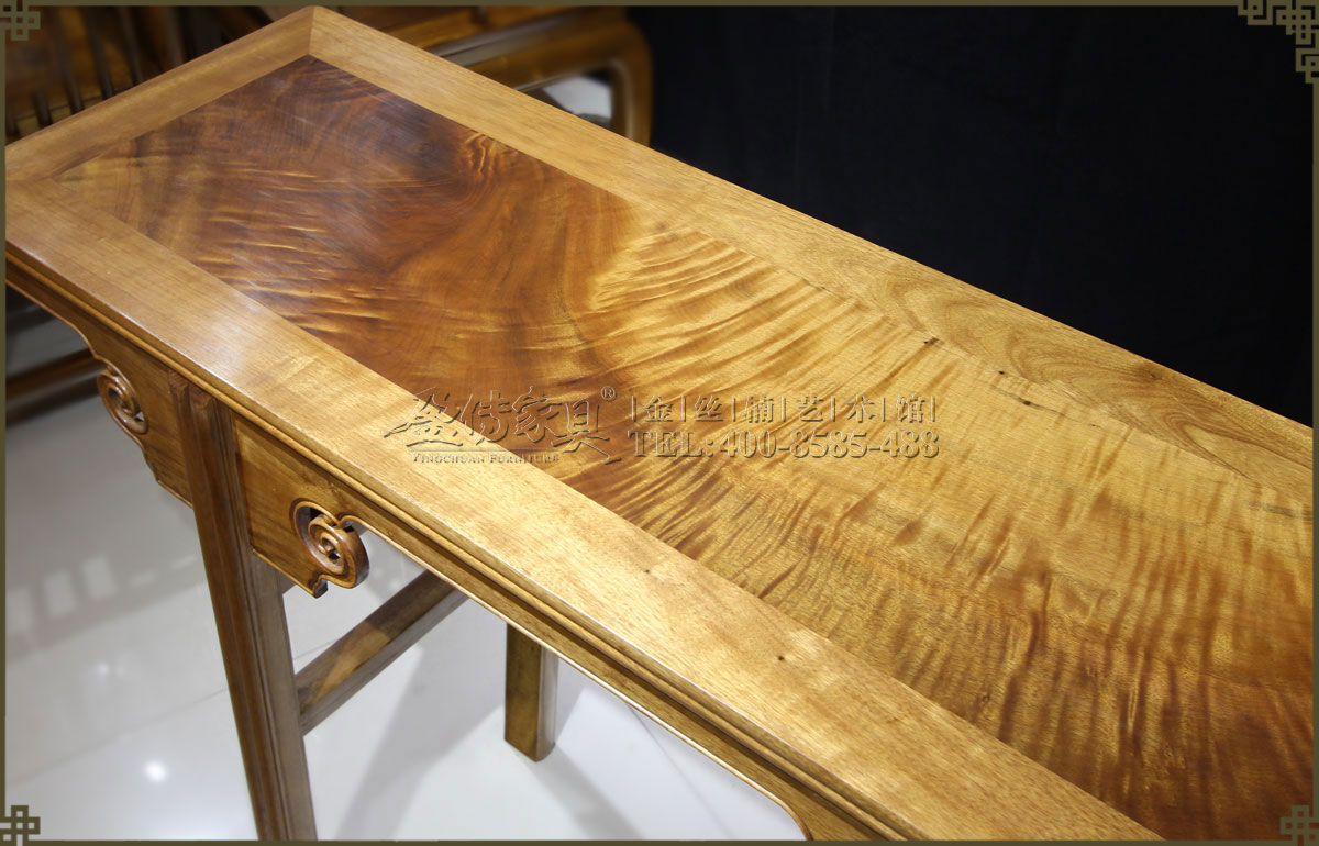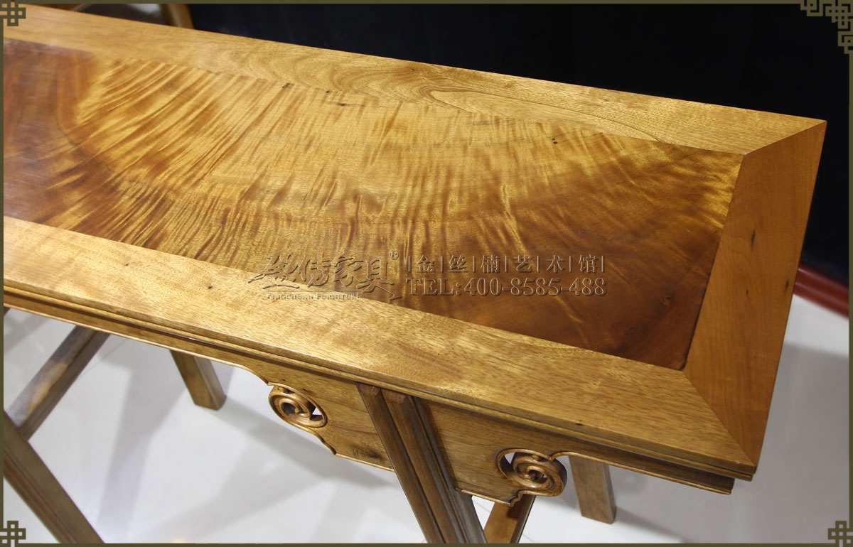 此金絲楠平頭案繼承了明式家具的風格,造型明快,線條流暢,簡練大方,典雅優美。制作精細,夾頭榫結構堅固耐用,卷云紋牙頭。金絲楠獨板面板,紋路優美,褶褶生輝,光線的變化會導致千變萬化的光影效果,這也是金絲楠的魅力所在。