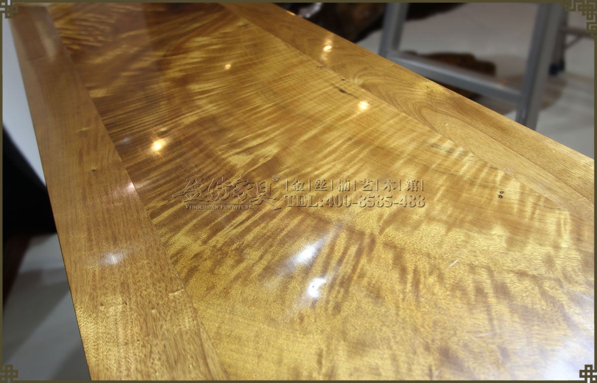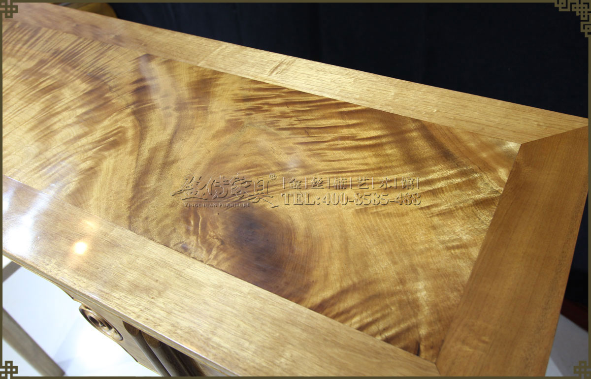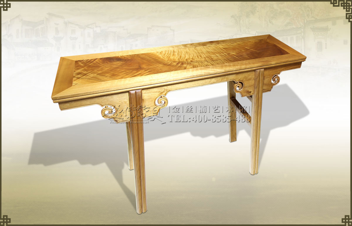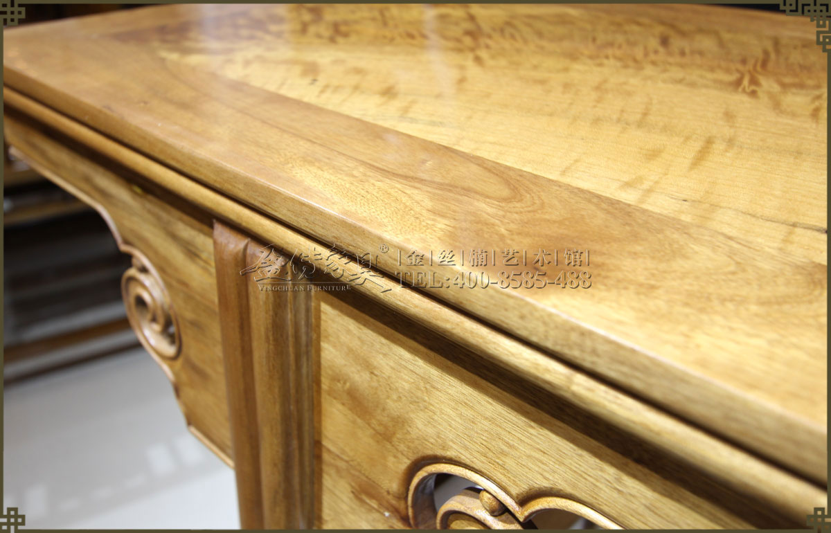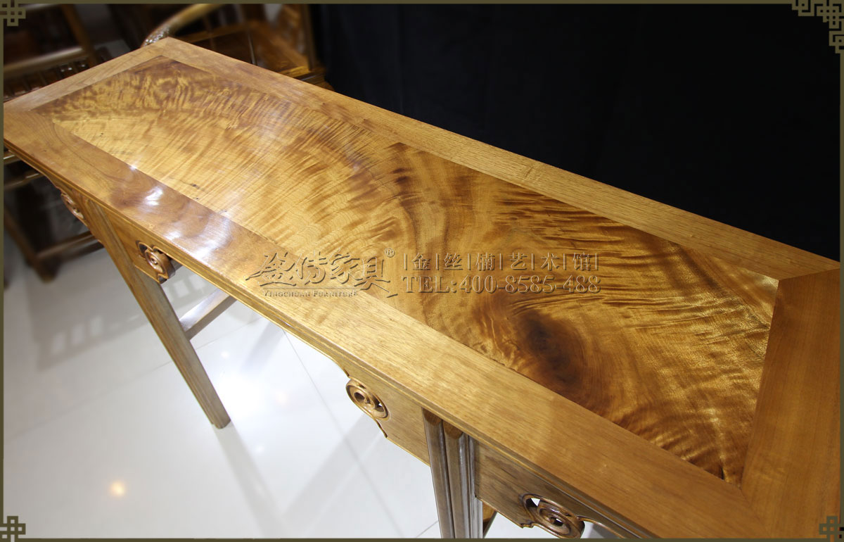 此金絲楠平頭案繼承了明式家具的風格,造型明快,線條流暢,簡練大方,典雅優美。制作精細,夾頭榫結構堅固耐用,卷云紋牙頭。金絲楠獨板面板,紋路優美,褶褶生輝,光線的變化會導致千變萬化的光影效果,這也是金絲楠的魅力所在。