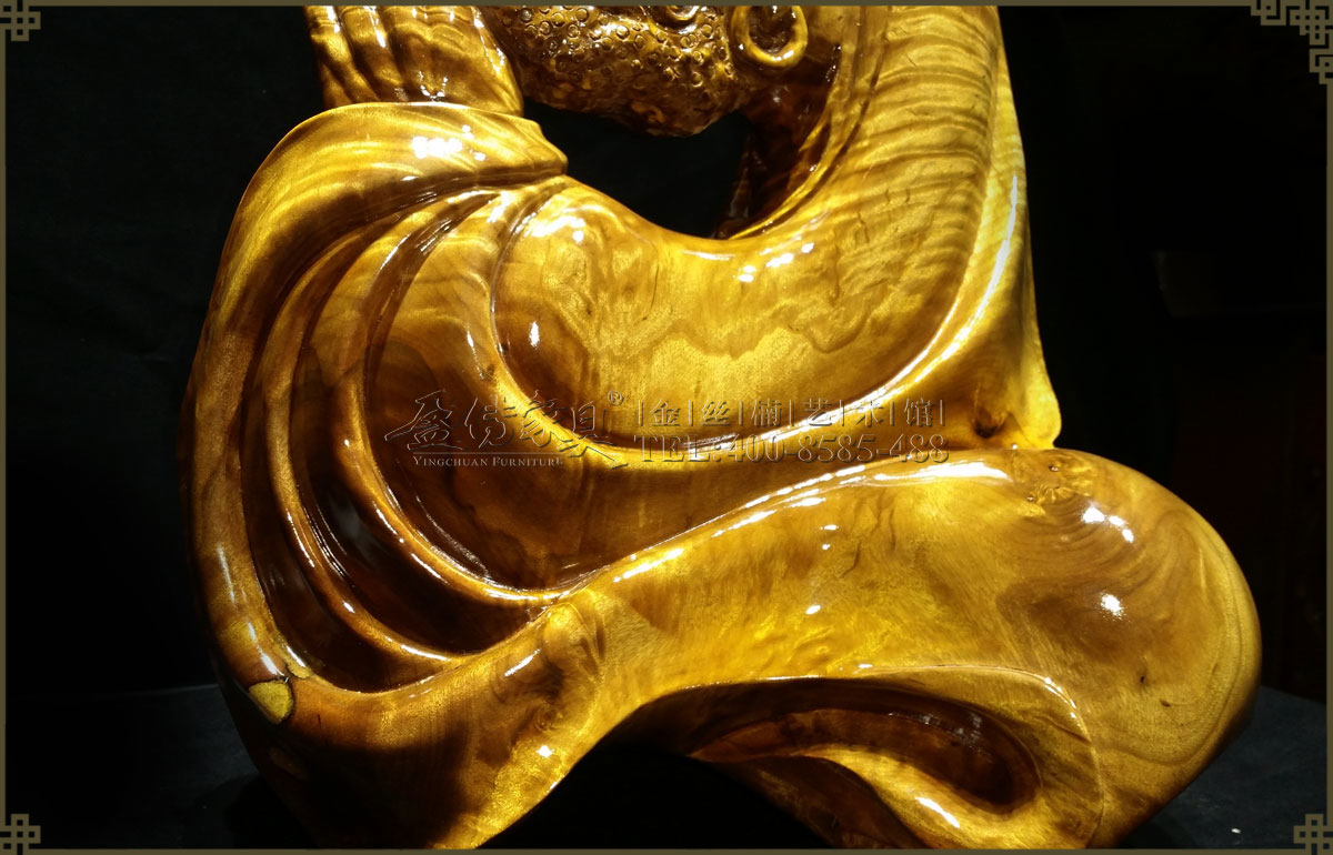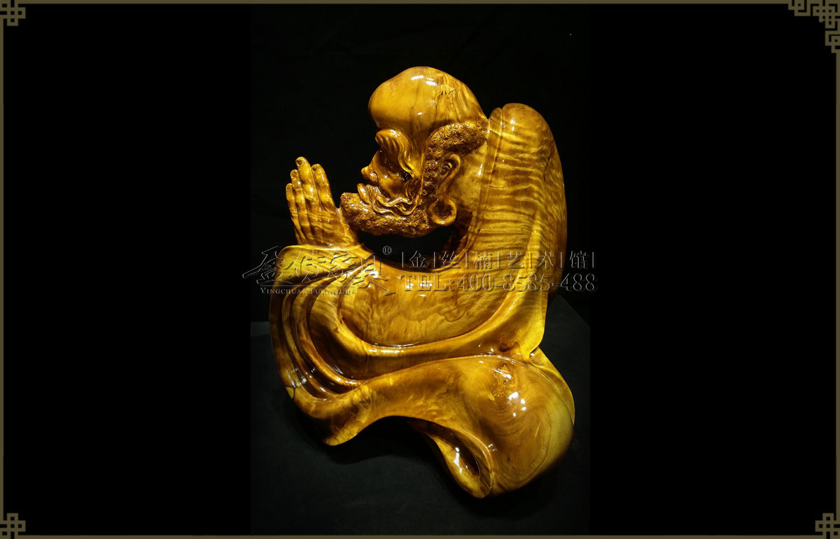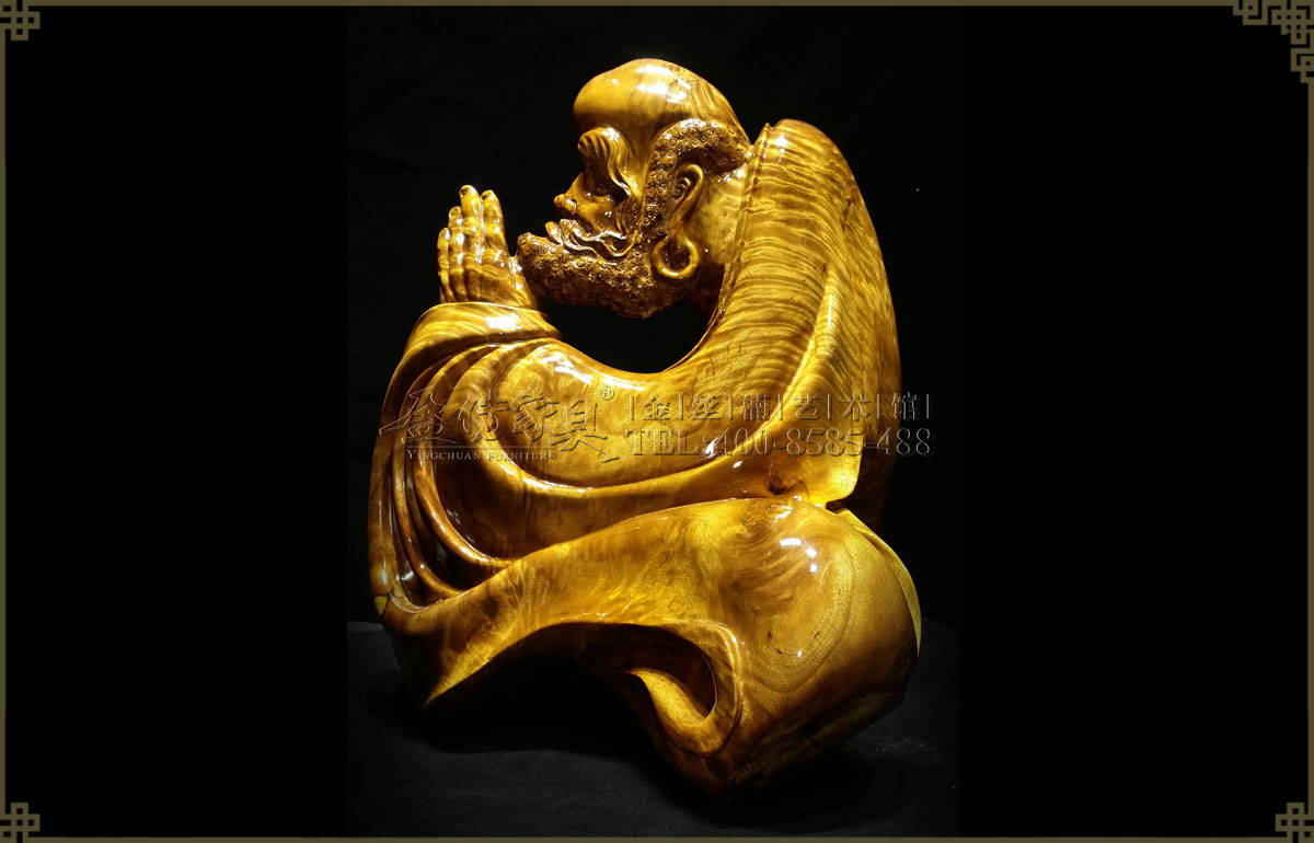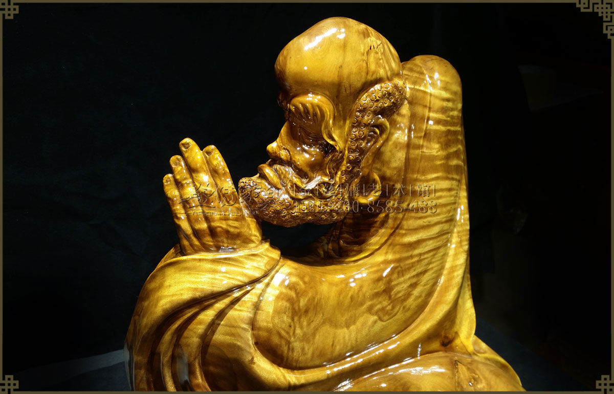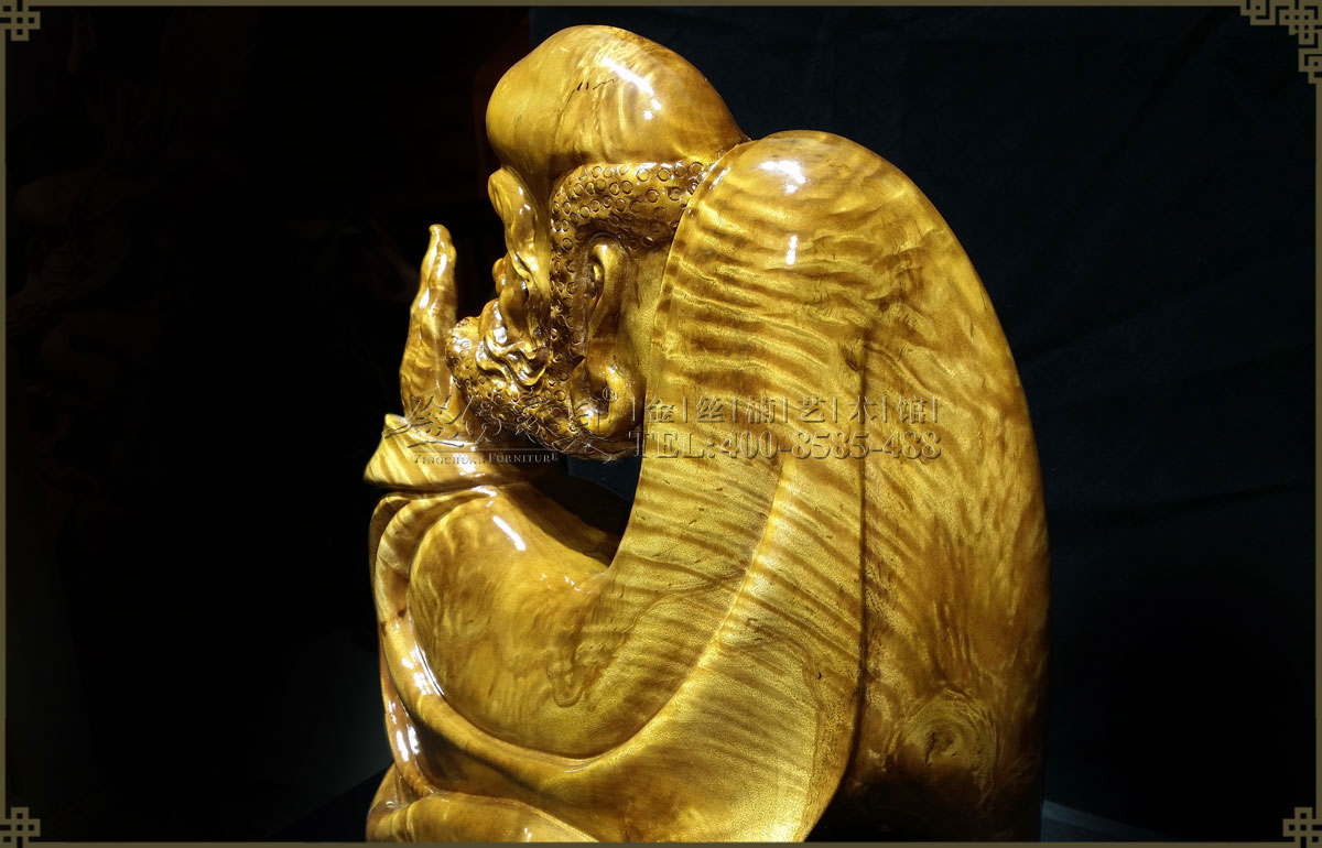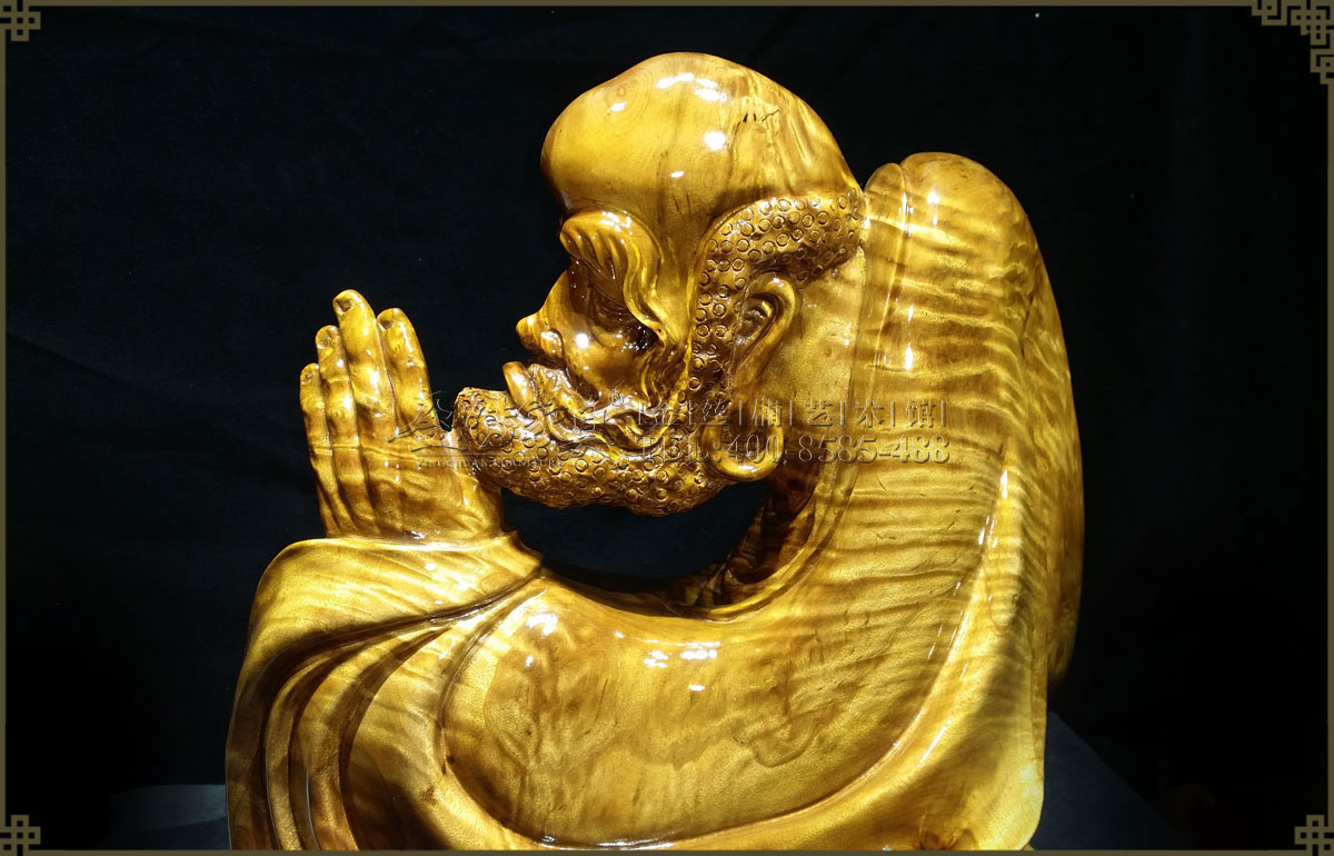 此金絲楠達(dá)摩雕刻十分精細(xì),面部表情入木三分,惟妙惟肖,工藝家將其面壁枯坐九年的精神形象完美展示出來。且水波紋非常豐富清晰,整體十分華麗尊貴,具有很高的藝術(shù)價值和欣賞價值。