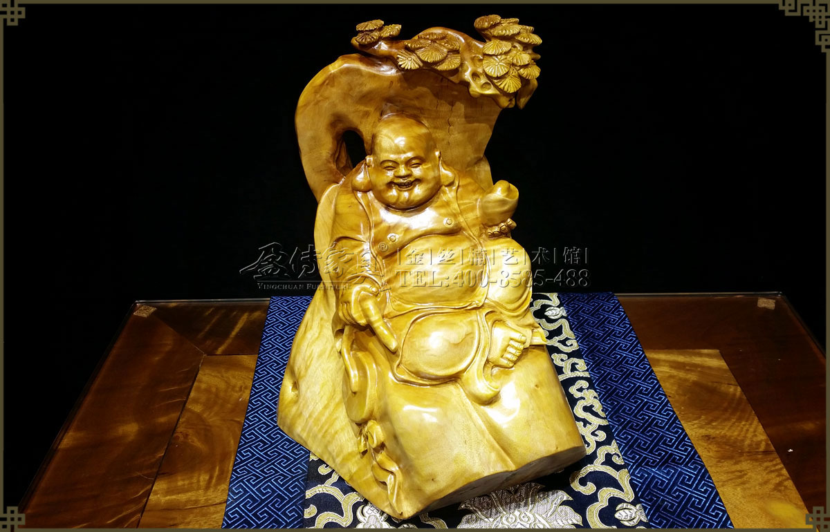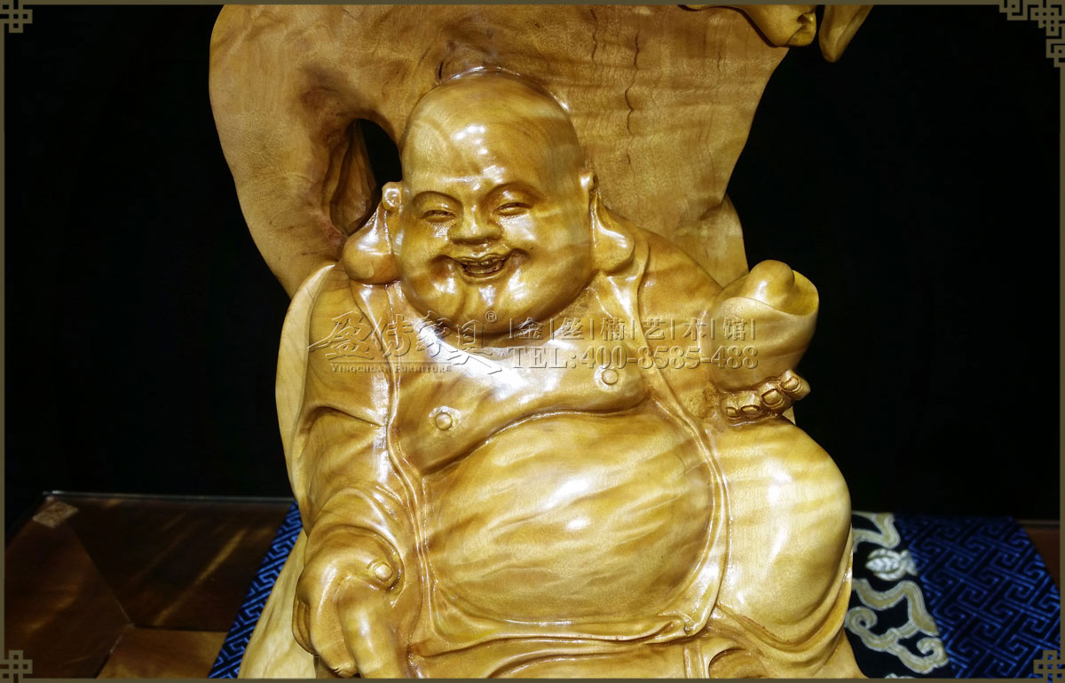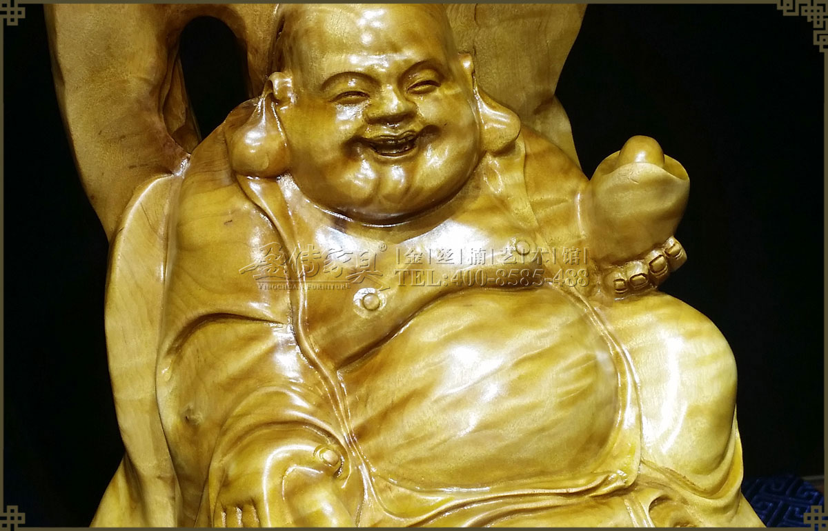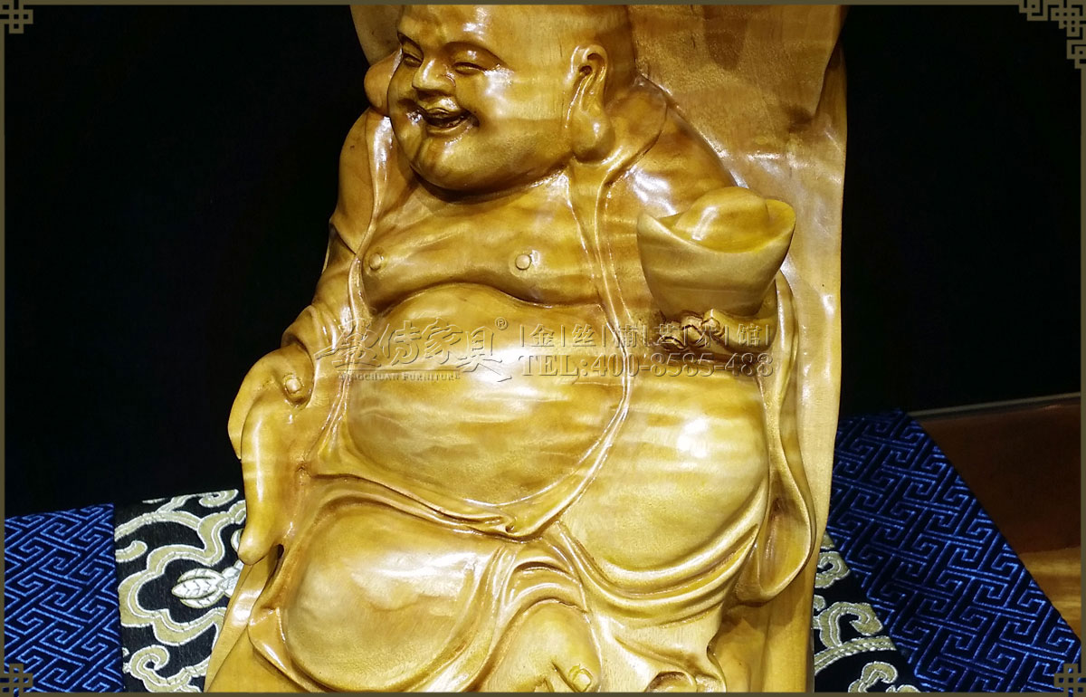 彌勒佛也叫笑佛。此金絲楠笑佛袒胸露腹,喜笑顏開,悠閑自在地在樹下乘涼讓人一看就有忘卻煩惱、皆大歡喜的感覺,手拿大金元寶寓意財運滾滾。而且金絲閃耀奪目,水波紋密集豐富,清晰而有層次,手感溫潤細膩,線條流暢完美,精雕細刻,是藝術擺件中的佳品,集實用、欣賞、收藏價值于一身。