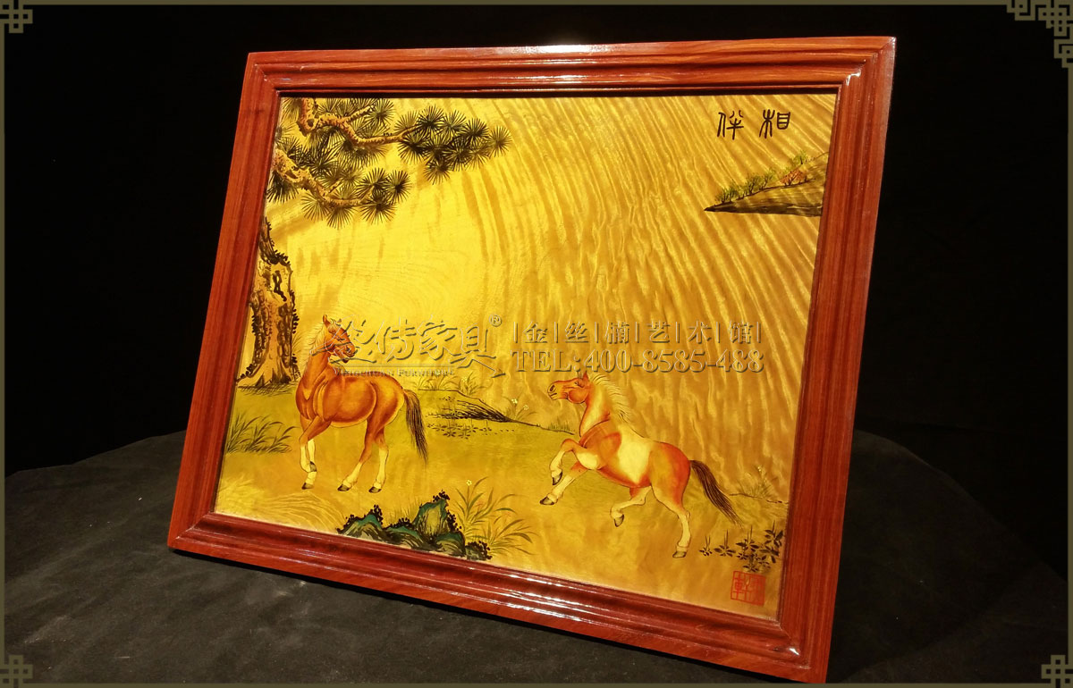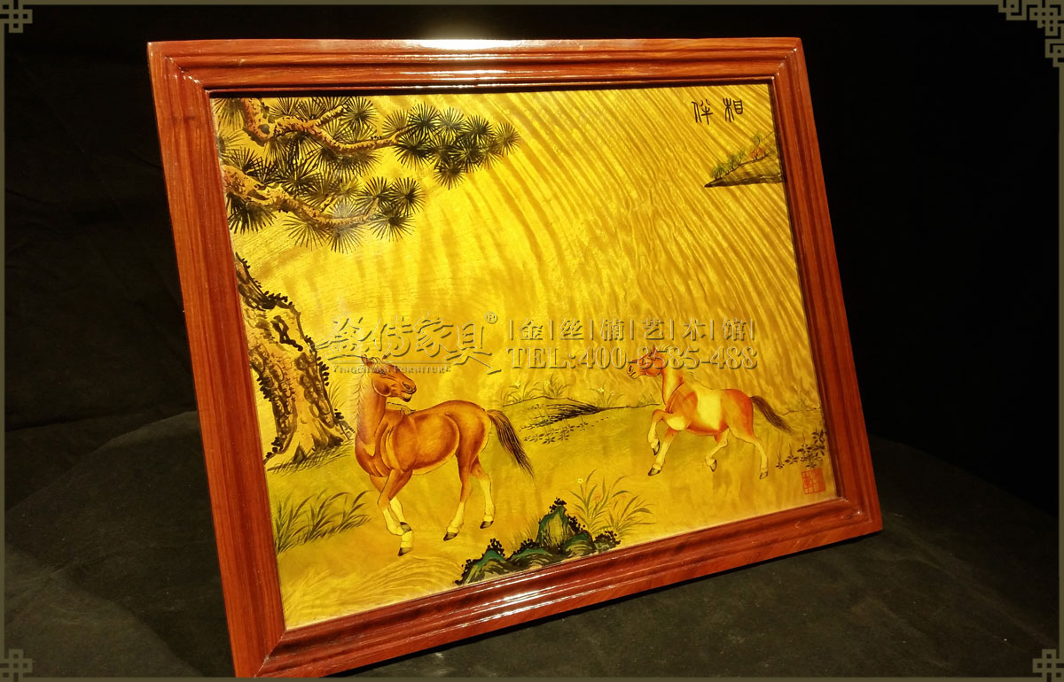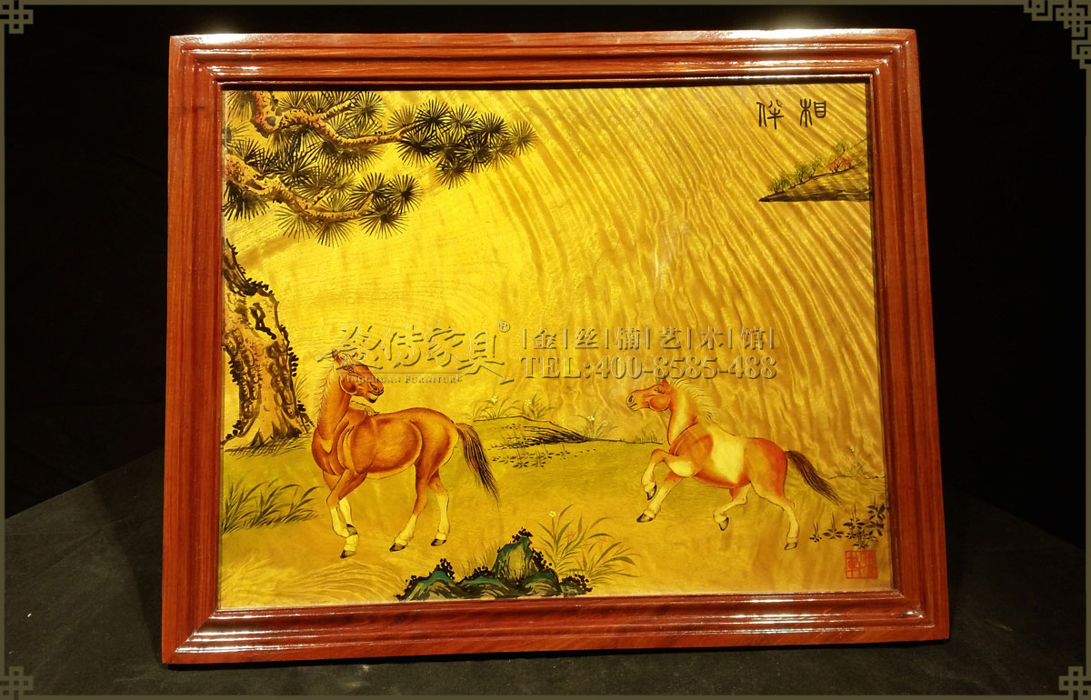 此掛屏意境深遠(yuǎn):“從此,春花為盟,松鼠為鑒,你走進(jìn)我的紅塵,我步入你的畫(huà)卷,兩情相悅,相惜相伴“。馬兒栩栩如生、憨態(tài)可掬,表情溫和,使整幅畫(huà)充滿(mǎn)祥和的氣氛。