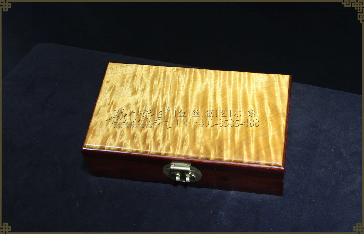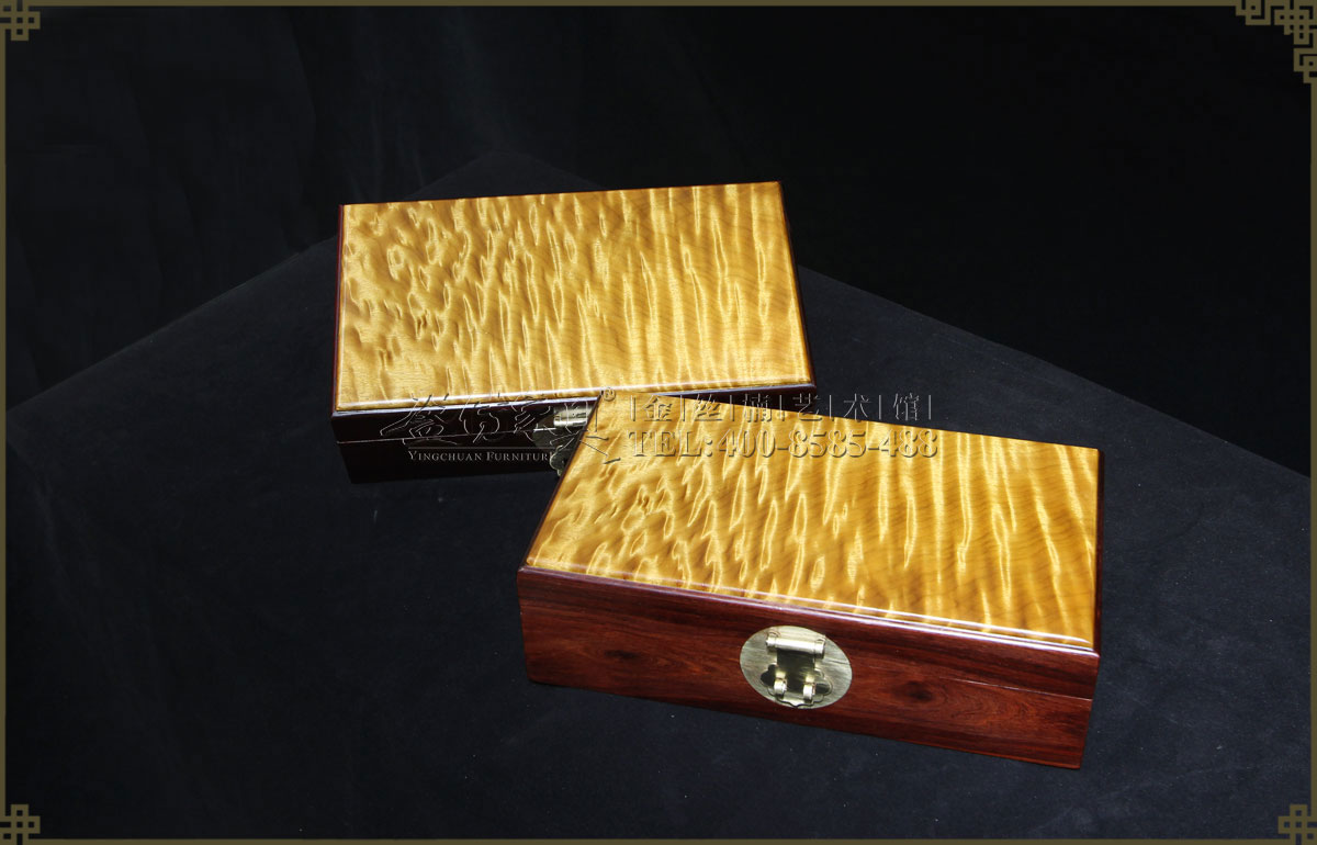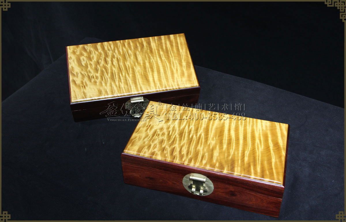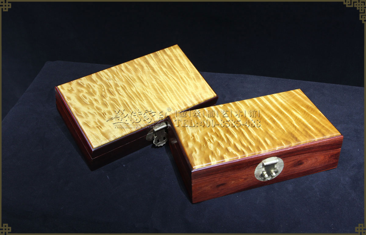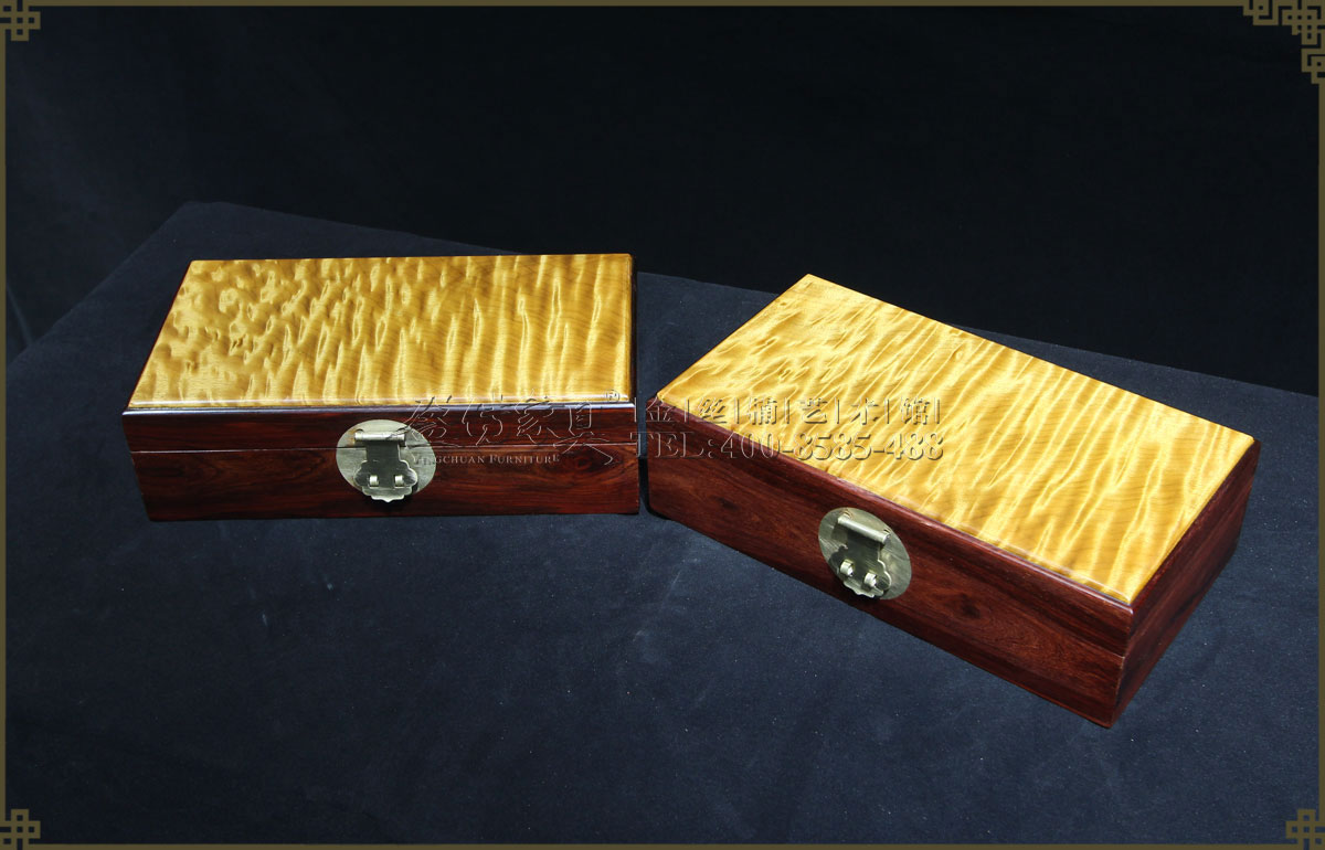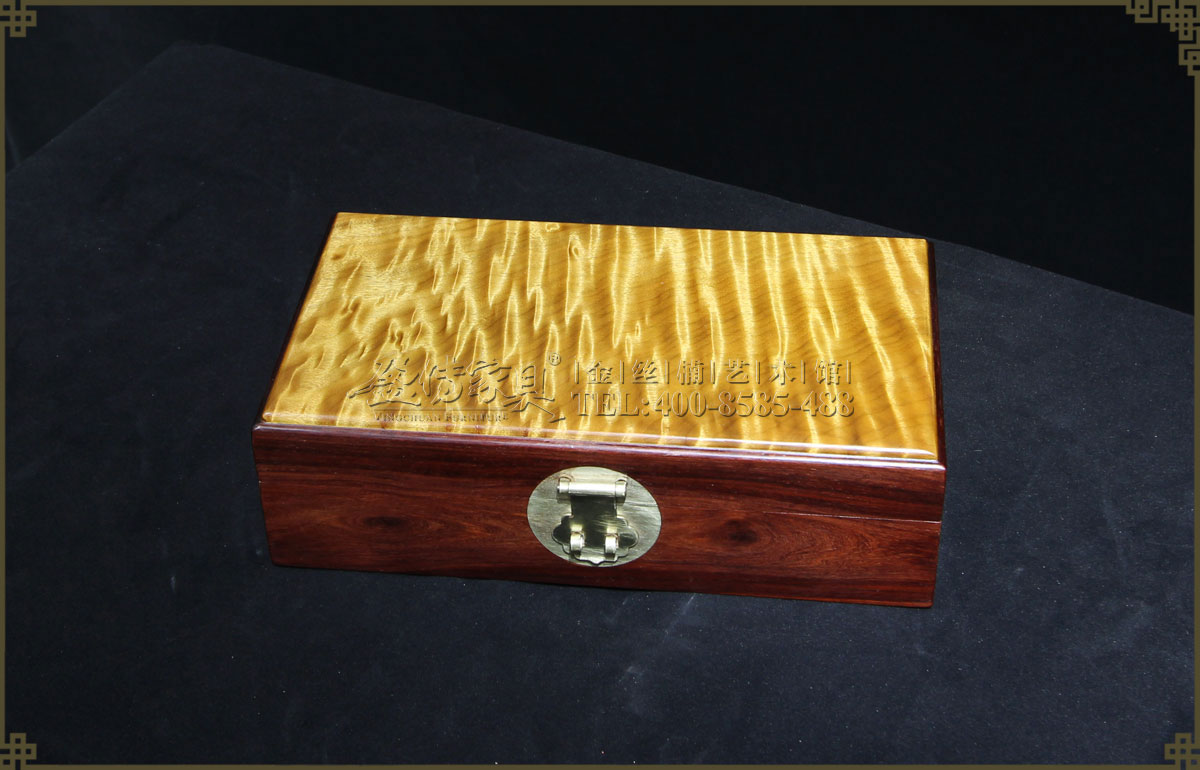 金絲楠和小葉紫檀都是珍貴上等木料,金絲楠金絲閃爍、水波紋華美絢麗,小葉紫檀經典雋永、淳厚含蓄,兩者結合相得益彰,形成低調而奢華,穩重又高貴的獨特風格。此首飾盒做工精細,精致漂亮,展示出溫婉而高貴的氣質,是女人心愛的首飾的最佳歸宿地。