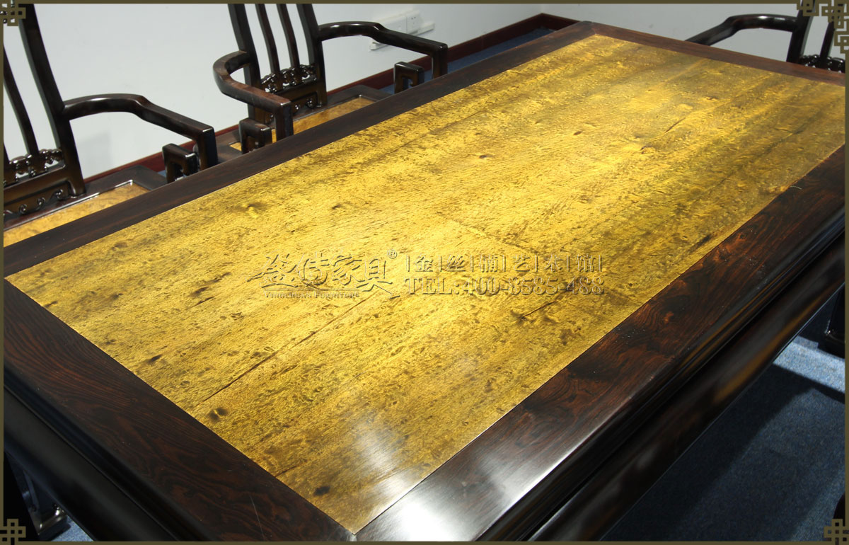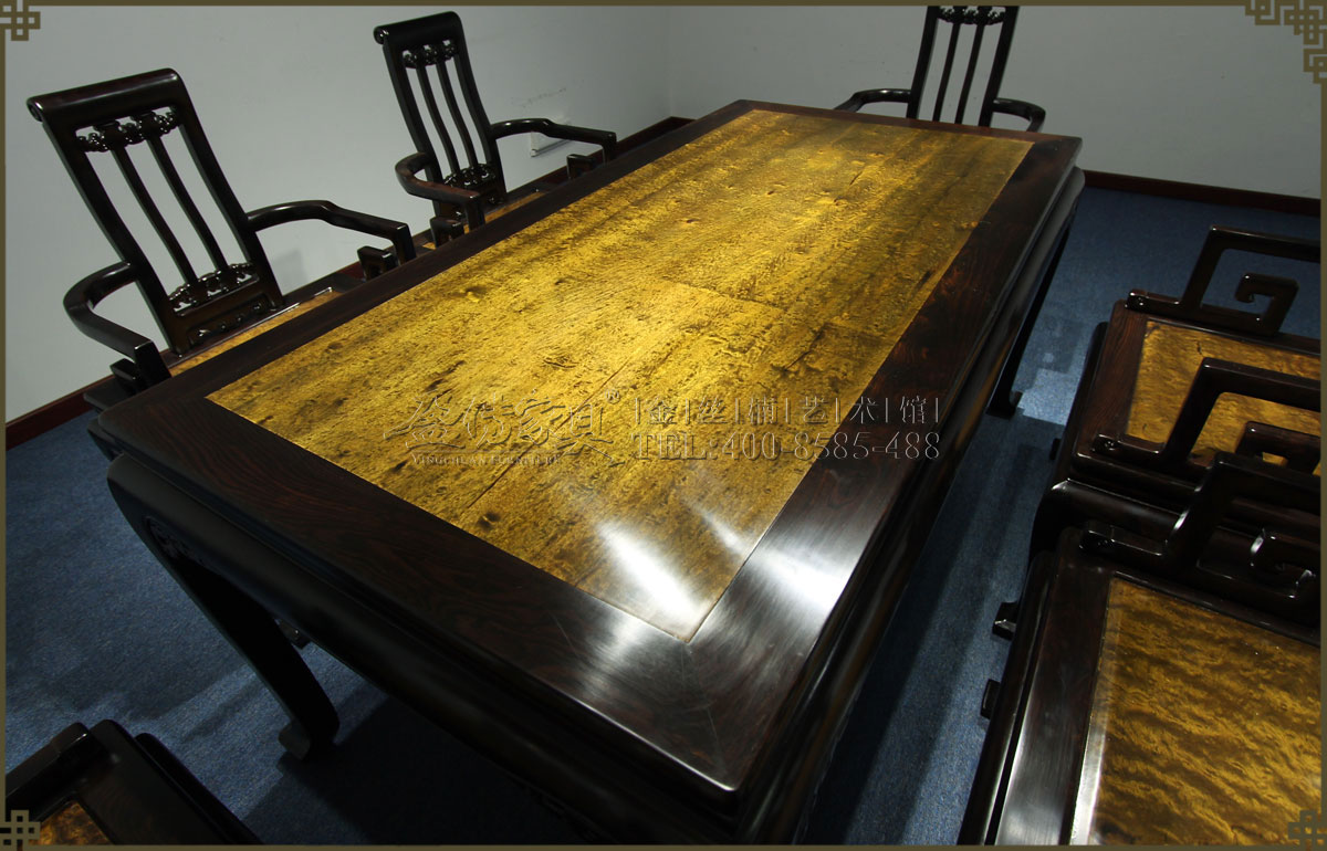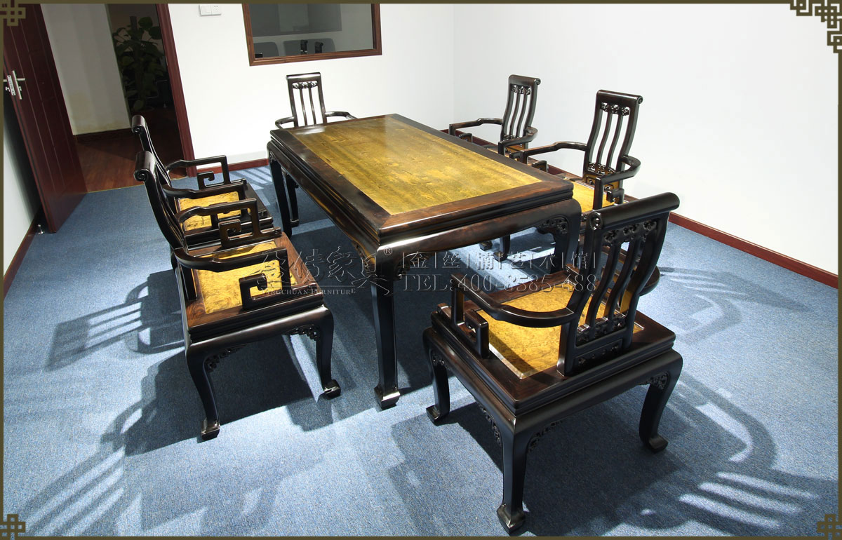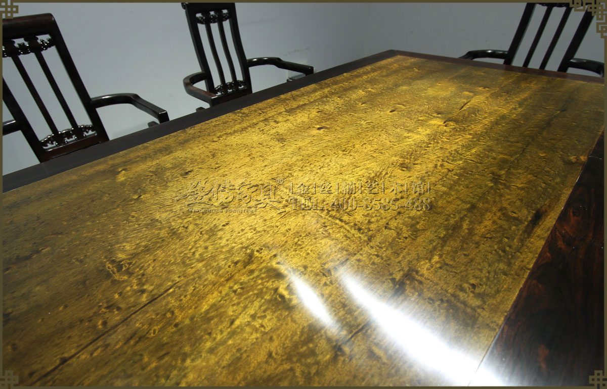 黑檀鑲金絲楠陰沉木水滴紋長方桌7件套,大亮點是餐桌和椅子的面板均是金絲楠陰沉木(烏木)獨板大料,這樣大的陰沉面板已經稀有,而面板上居然還是滿水滴紋,奇特美麗,實在罕見,可謂千金難求的極品、上品。