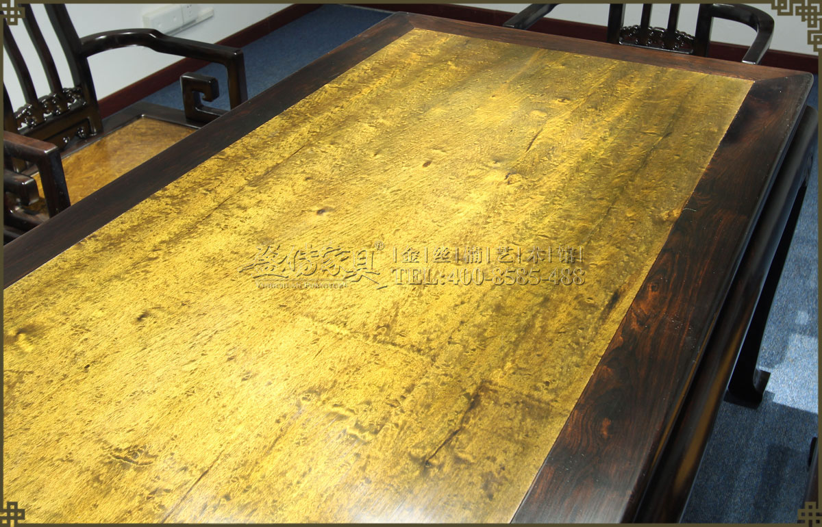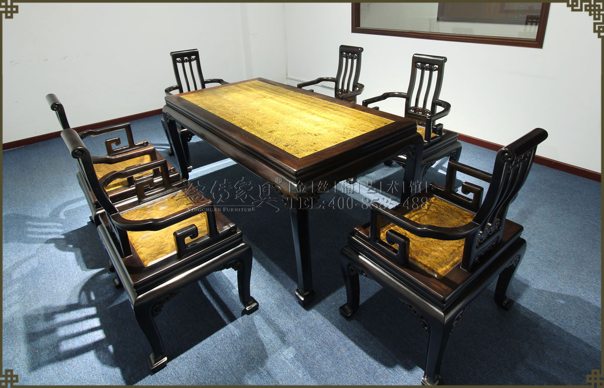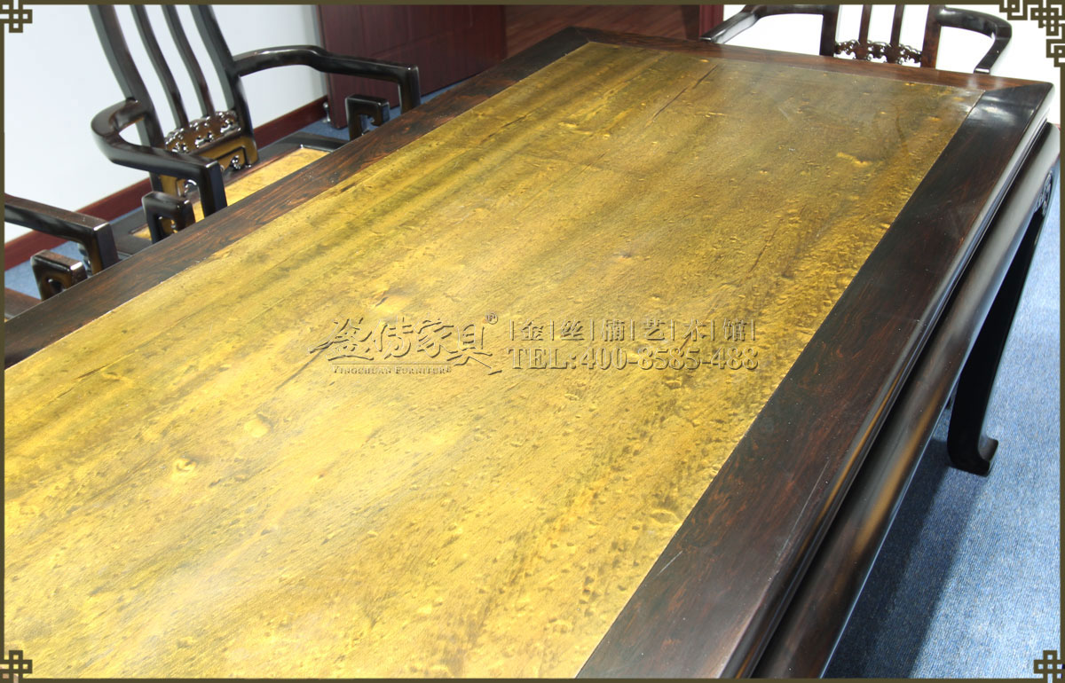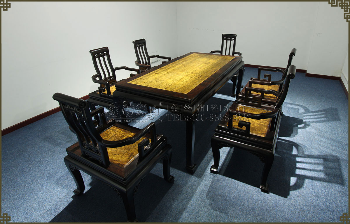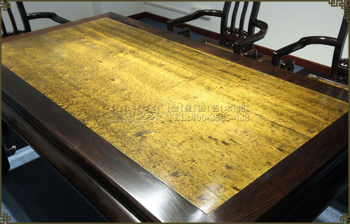 黑檀鑲金絲楠陰沉木水滴紋長方桌7件套,大亮點是餐桌和椅子的面板均是金絲楠陰沉木(烏木)獨板大料,這樣大的陰沉面板已經稀有,而面板上居然還是滿水滴紋,奇特美麗,實在罕見,可謂千金難求的極品、上品。