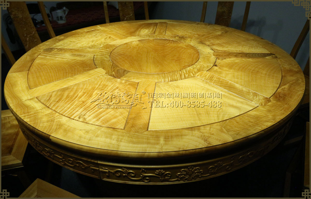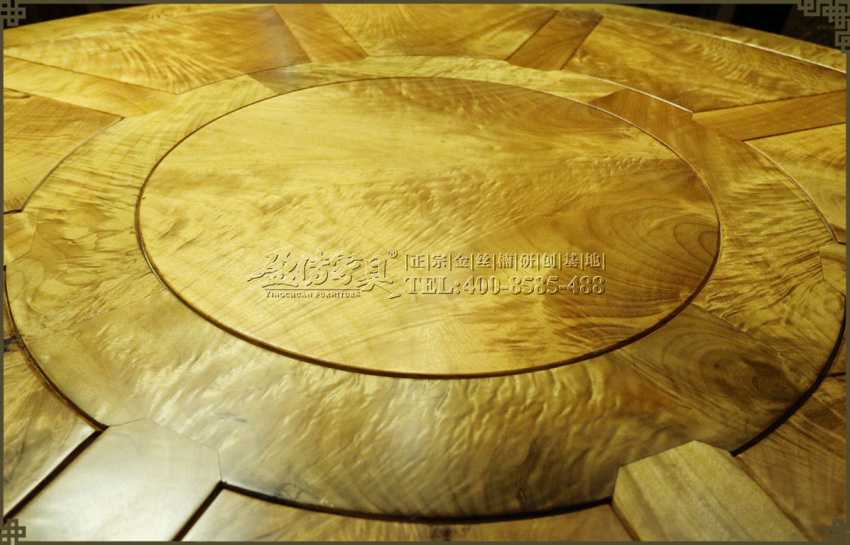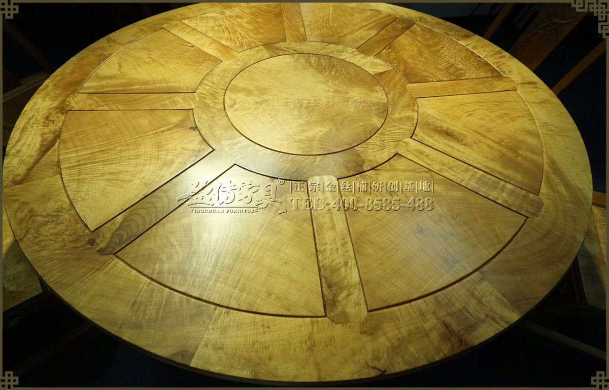 氣派、豪華的滿波紋路金絲楠大圓餐臺9件套。整個桌面和所有的椅面都布滿密集、立體、清晰的水波紋,熠熠生輝,金碧輝煌,讓你用餐前先享受視覺盛宴,美得驚人,具有極高的收藏價值和藝術欣賞價值!放于家中、會所、酒店招待客人,尤其體面,必定令人驚訝務必,一見難忘,嘖嘖稱贊。