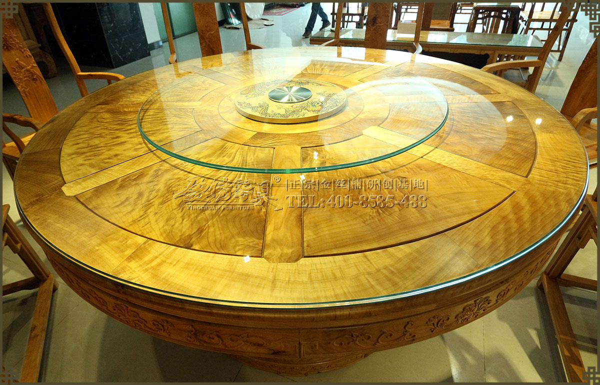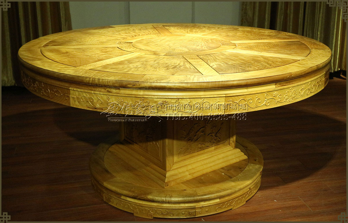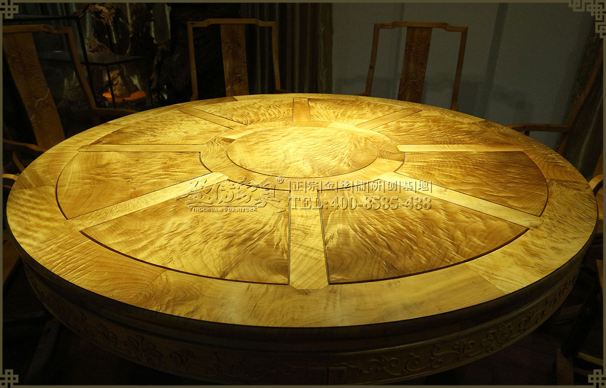 此金絲楠木大圓餐桌桌面紋理絢麗、波光粼粼,牙條寬厚、面板統一,其整體外形展示出莊重、大氣、富貴、祥和的大家風范。