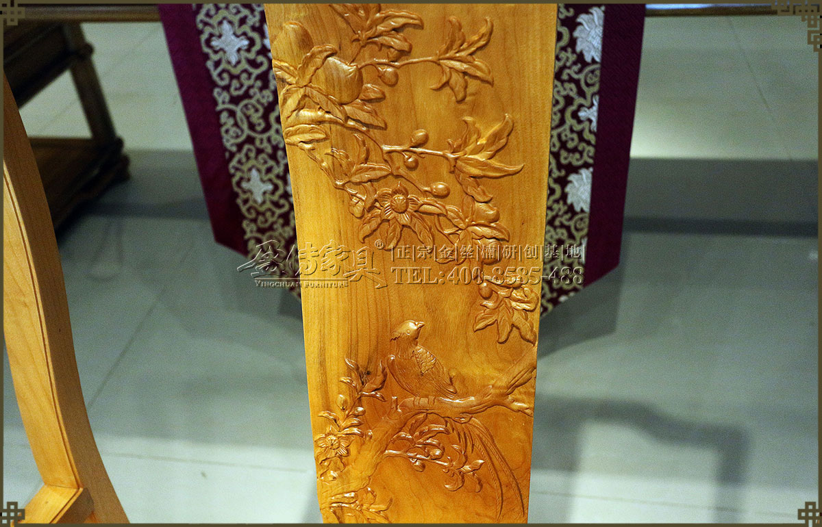 桌面中央嵌圓形金絲楠木面心,桌面側沿下起陽線,有束腰,腰下周身浮雕卷草紋,簡約大方;圓臺底座外圍簡易,底面圖案與裙邊圖案相映成趣,在視覺上避免了“頭重腳輕”,足見穩重而美觀;配以金絲楠餐椅,背板輔以的雕花,兩者擺放在一起,相得益彰,融為一體。
