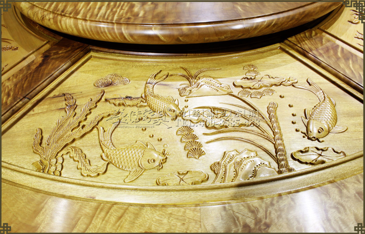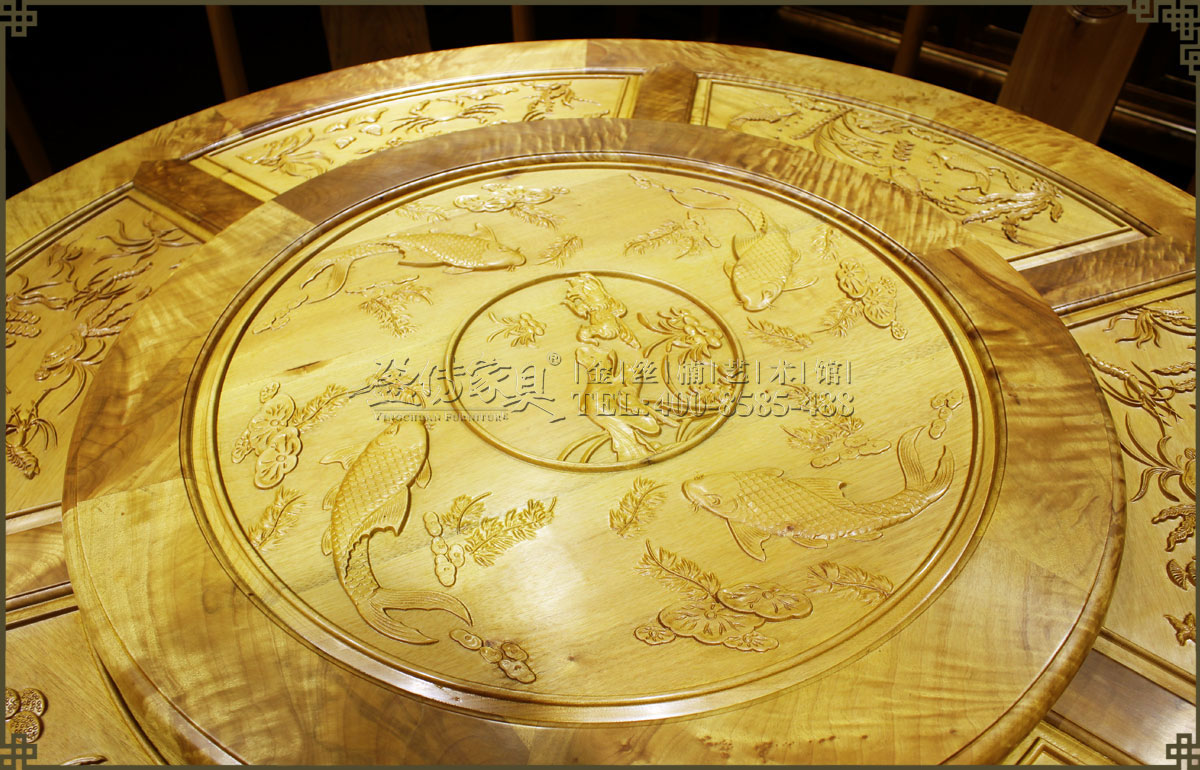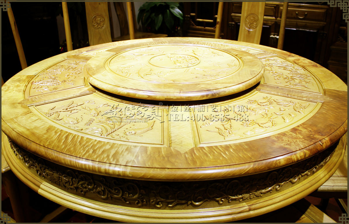 一大圓餐臺(tái),配八張椅子。此圓餐臺(tái)乃豪華餐廳的高雅之物,極具中國(guó)古典特色,線條優(yōu)美,做工精細(xì),整個(gè)臺(tái)面、束腰都精雕細(xì)刻了美麗的吉祥花紋,高貴、氣派、細(xì)膩,雍容絢麗,魅力四射。運(yùn)用流傳千年的榫卯工藝,環(huán)環(huán)相扣,是古典家具中的精品之作,有非常高的藝術(shù)價(jià)值、欣賞價(jià)值和收藏價(jià)值。