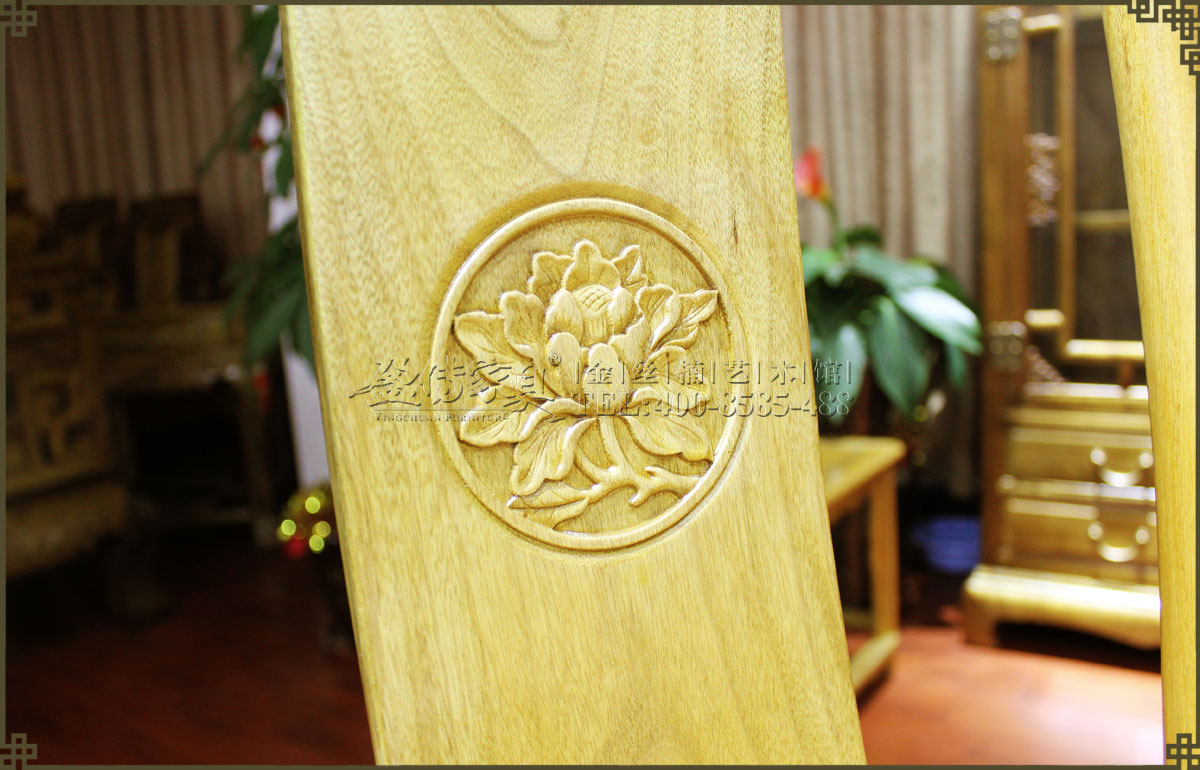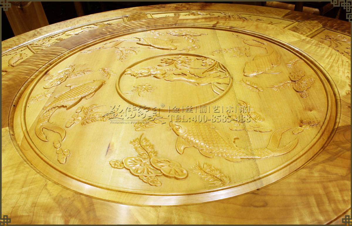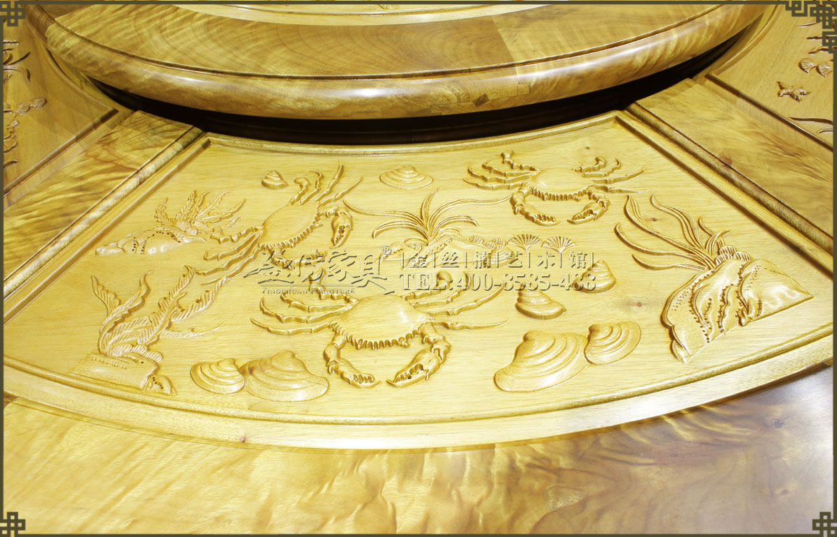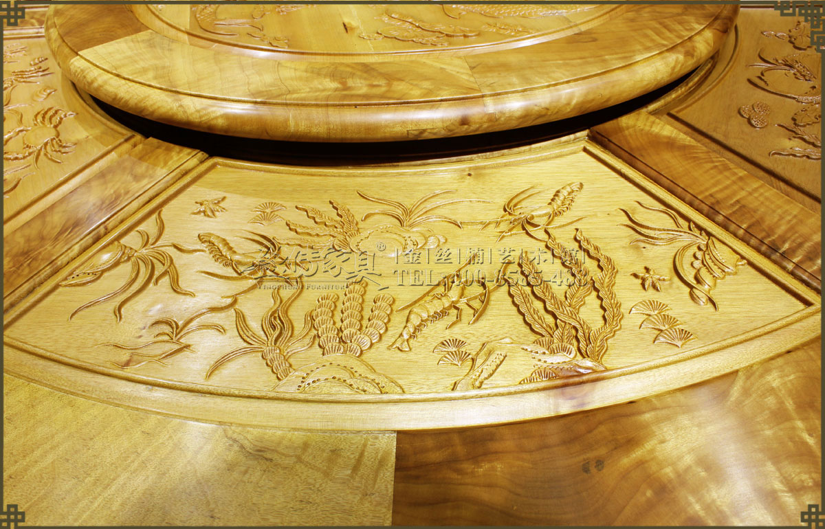 一大圓餐臺(tái),配八張椅子。此圓餐臺(tái)乃豪華餐廳的高雅之物,極具中國(guó)古典特色,線條優(yōu)美,做工精細(xì),整個(gè)臺(tái)面、束腰都精雕細(xì)刻了美麗的吉祥花紋,高貴、氣派、細(xì)膩,雍容絢麗,魅力四射。運(yùn)用流傳千年的榫卯工藝,環(huán)環(huán)相扣,是古典家具中的精品之作,有非常高的藝術(shù)價(jià)值、欣賞價(jià)值和收藏價(jià)值。