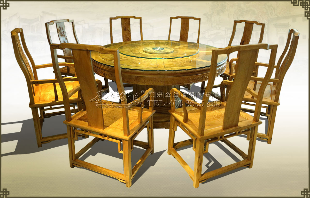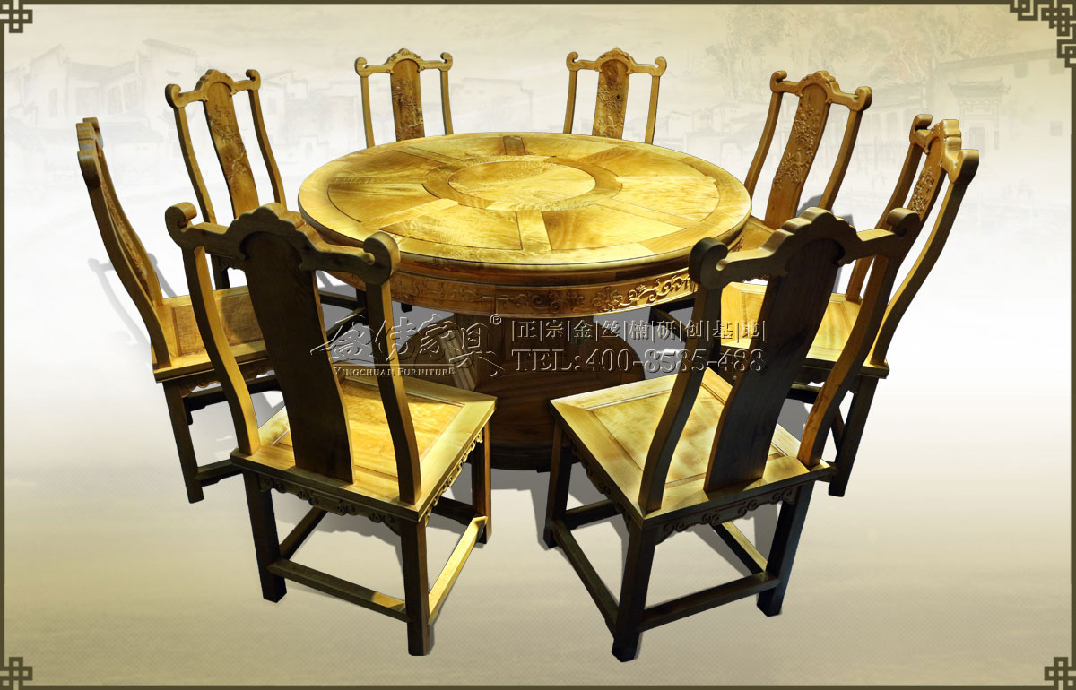 氣派、豪華的滿波紋路金絲楠大圓餐臺9件套。整個桌面和所有的椅面都布滿密集、立體、清晰的水波紋,熠熠生輝,金碧輝煌,讓你用餐前先享受視覺盛宴,美得驚人,具有極高的收藏價值...