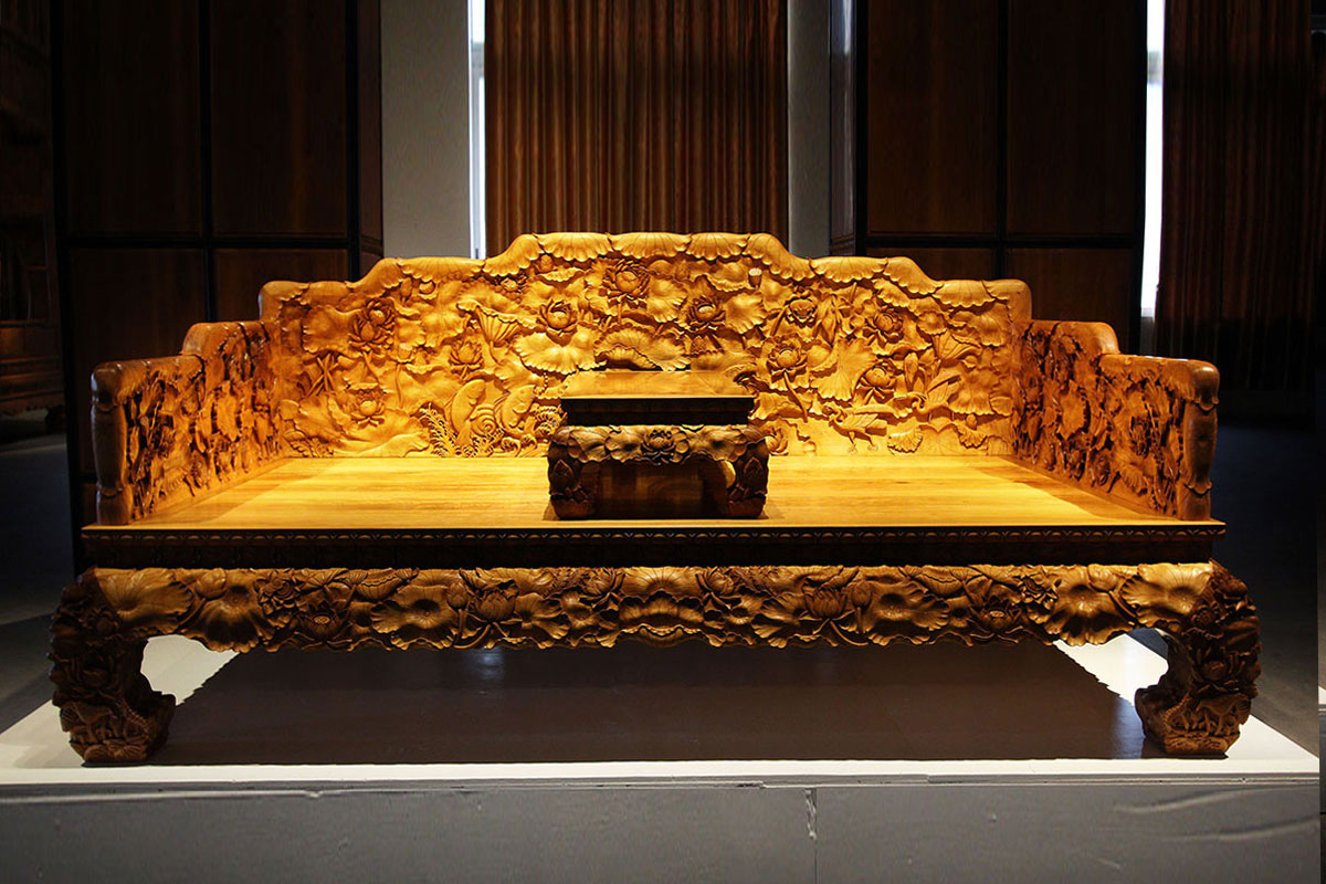 此款金絲楠荷花羅漢床器型碩大,用料厚重,采用純手工雕刻工藝,雕花繁而不亂,舒展有度,具有清新自然的藝術效果,實乃收藏臻品