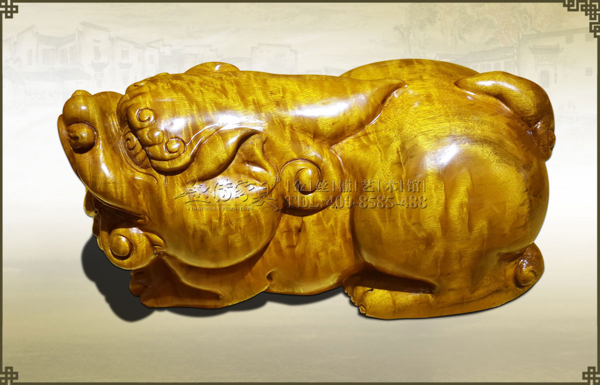 貔貅是中國(guó)古代神話(huà)傳說(shuō)中的一種神獸,龍頭、馬身、麟腳,形似獅,喜歡金錢(qián)之味,能吞金錢(qián)而從不泄,故有納食四方之財(cái)?shù)脑⒁狻? 此金絲楠貔貅伏在錢(qián)袋上,強(qiáng)壯健碩,神態(tài)威風(fēng)凜凜...