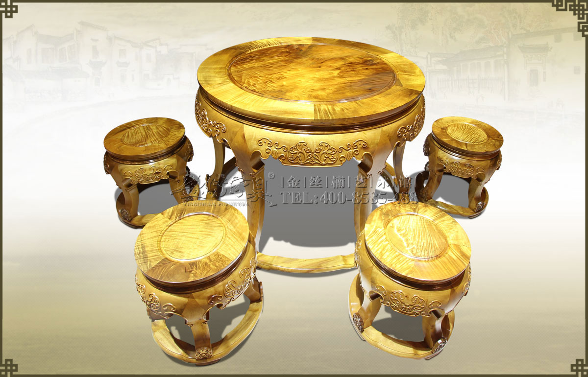 圓桌的面板由兩大塊金絲楠根料獨板制作而成,最長處分別為53cm和48cm,如此大的根料獨板極其少見。上面布滿天然水波紋,眩美獨特,猶如一幅藝術(shù)畫,震撼人心。5張鼓凳也是使用金...