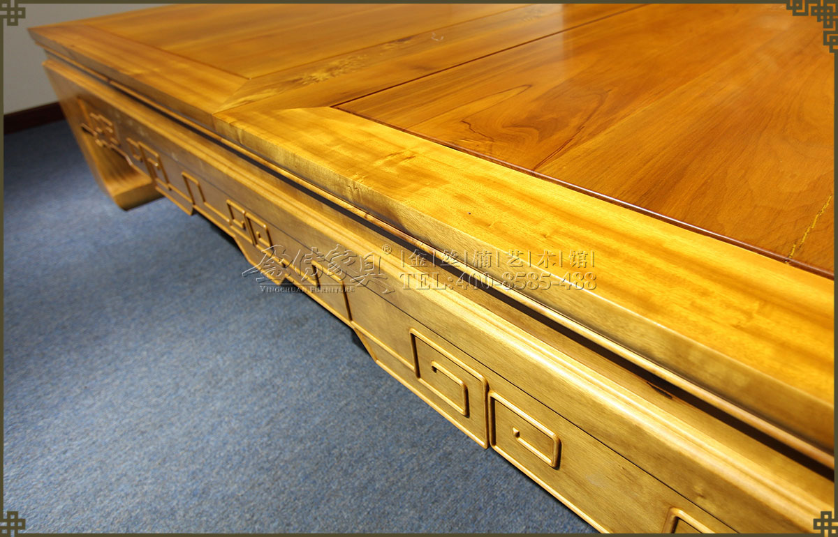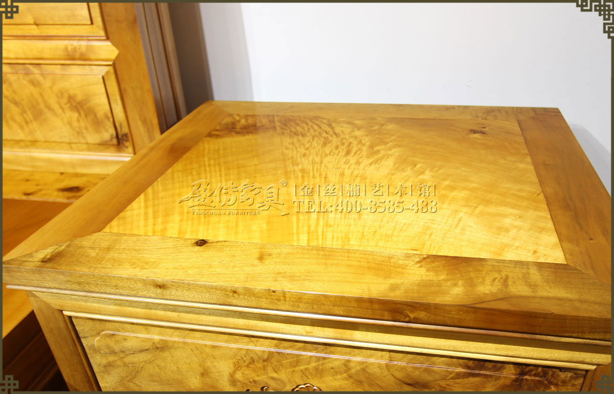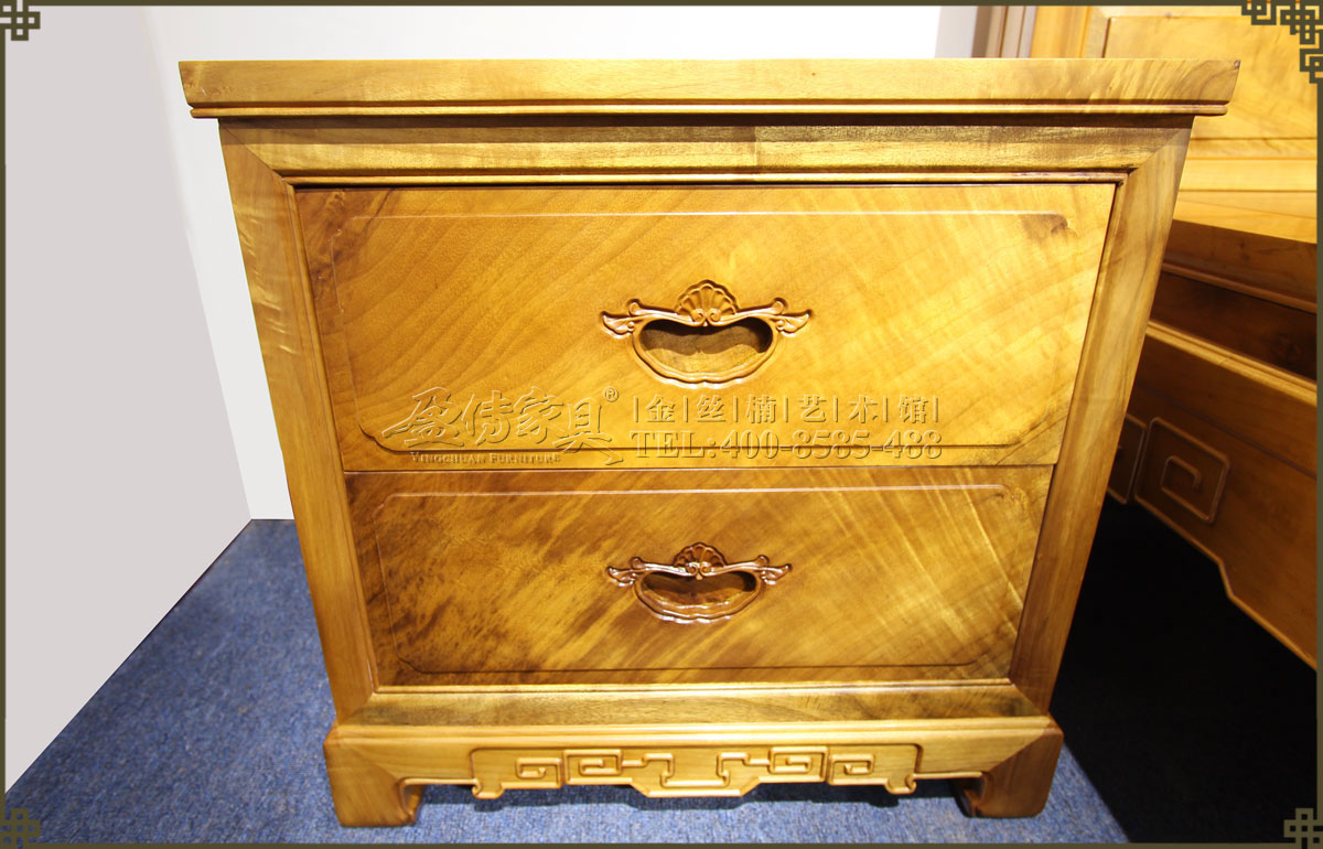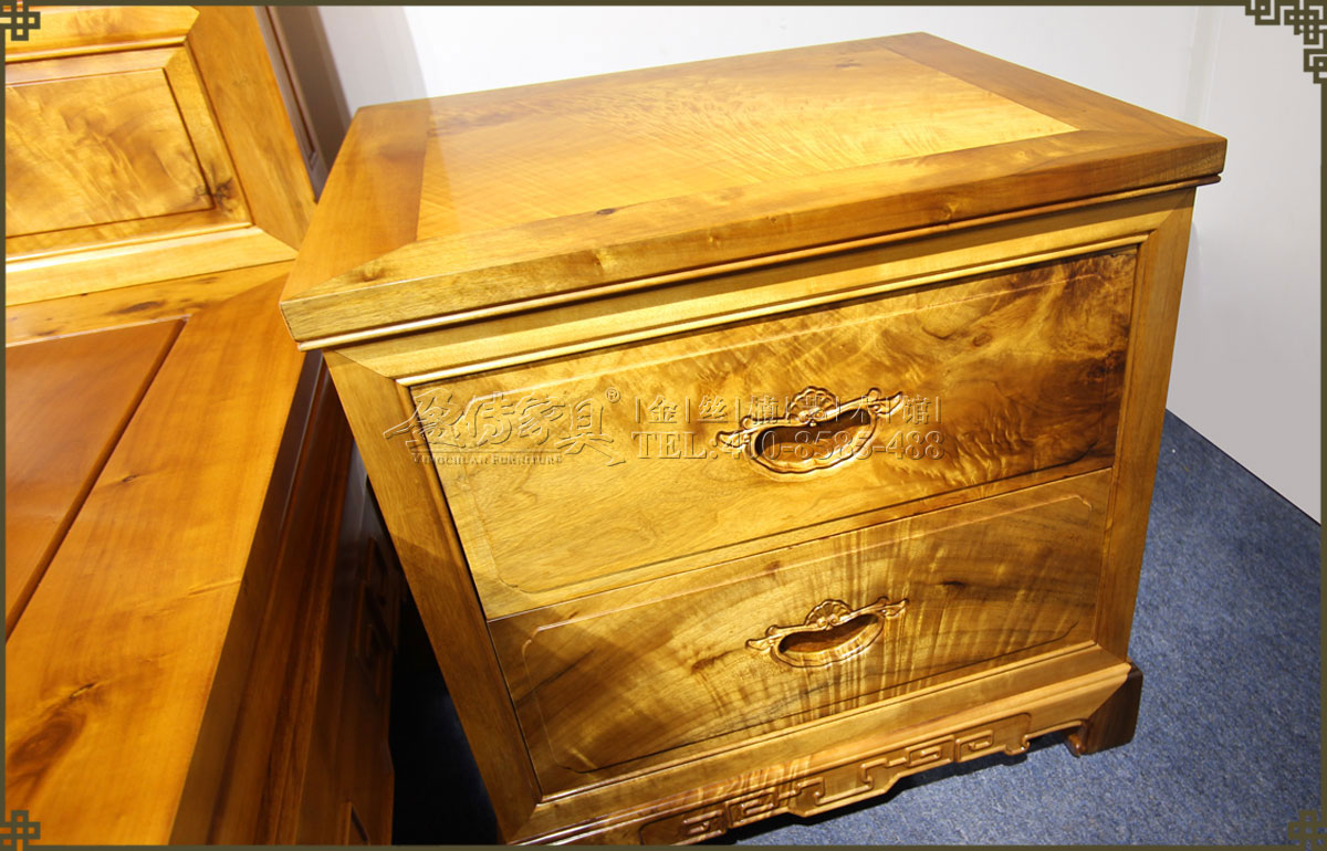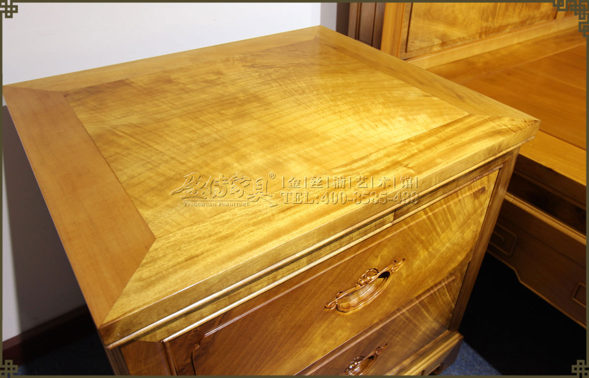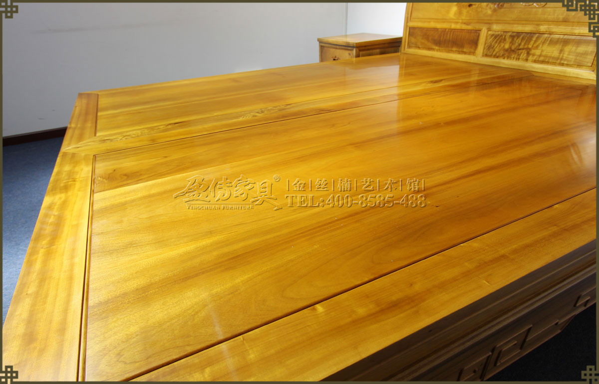 床頭正面板心雕飾荷花圖案,寓意百年好合,床配有兩個床頭柜,拉手處雕飾蝙蝠圖案,象征福壽雙全,床面整潔平整,表面在燈光的照射下金光閃閃,金絲浮現,有一種至尊至貴的高雅氣息,床體下帶束腰,洼堂肚牙板與腿相連,直腿內翻馬蹄,做工十分講究。