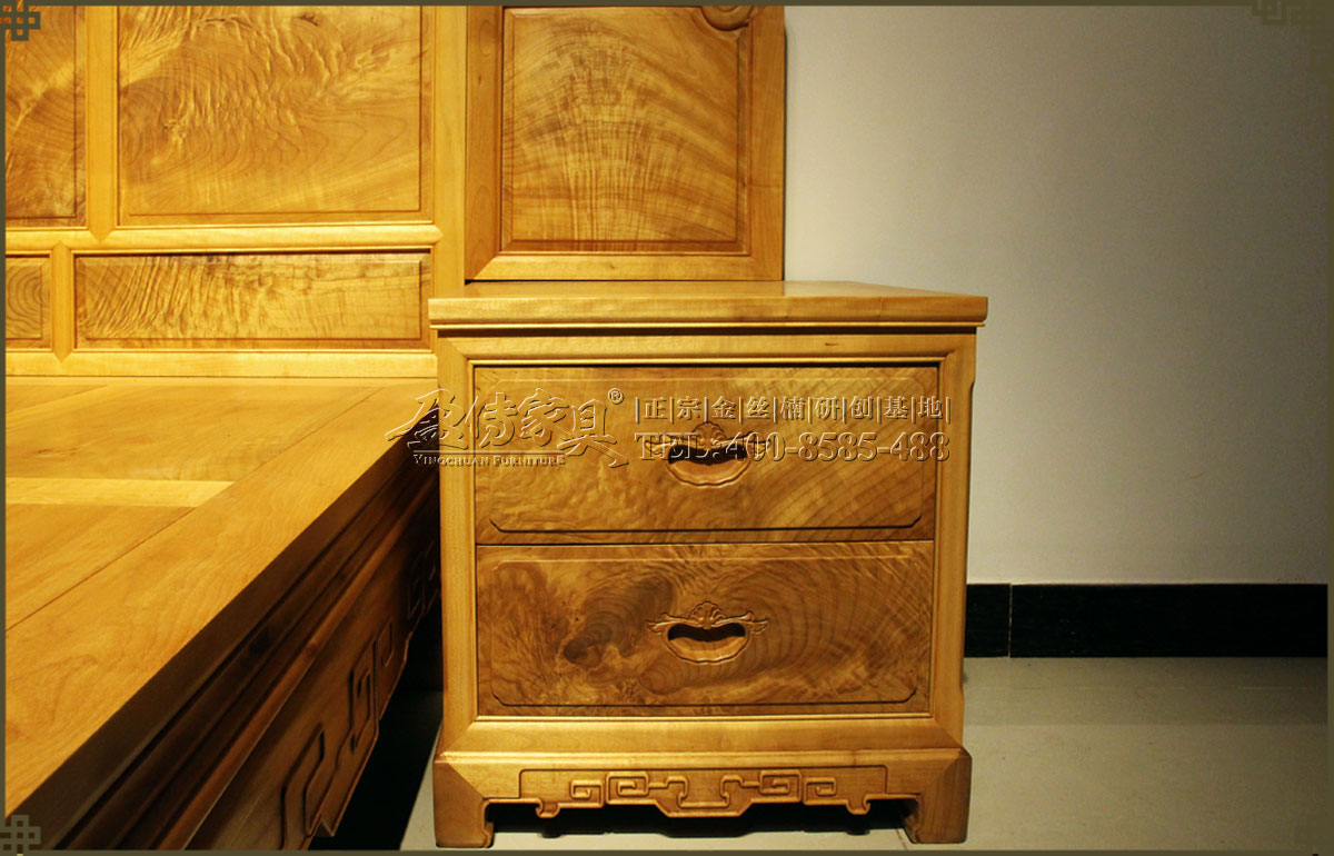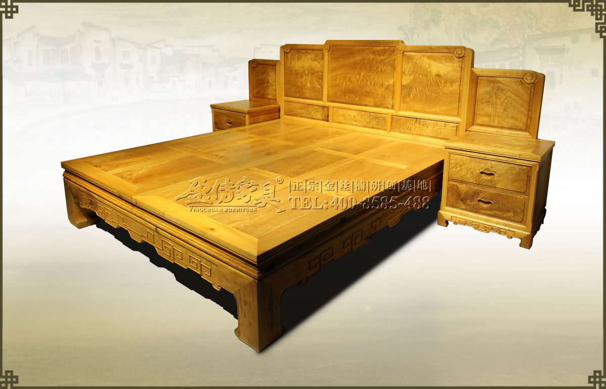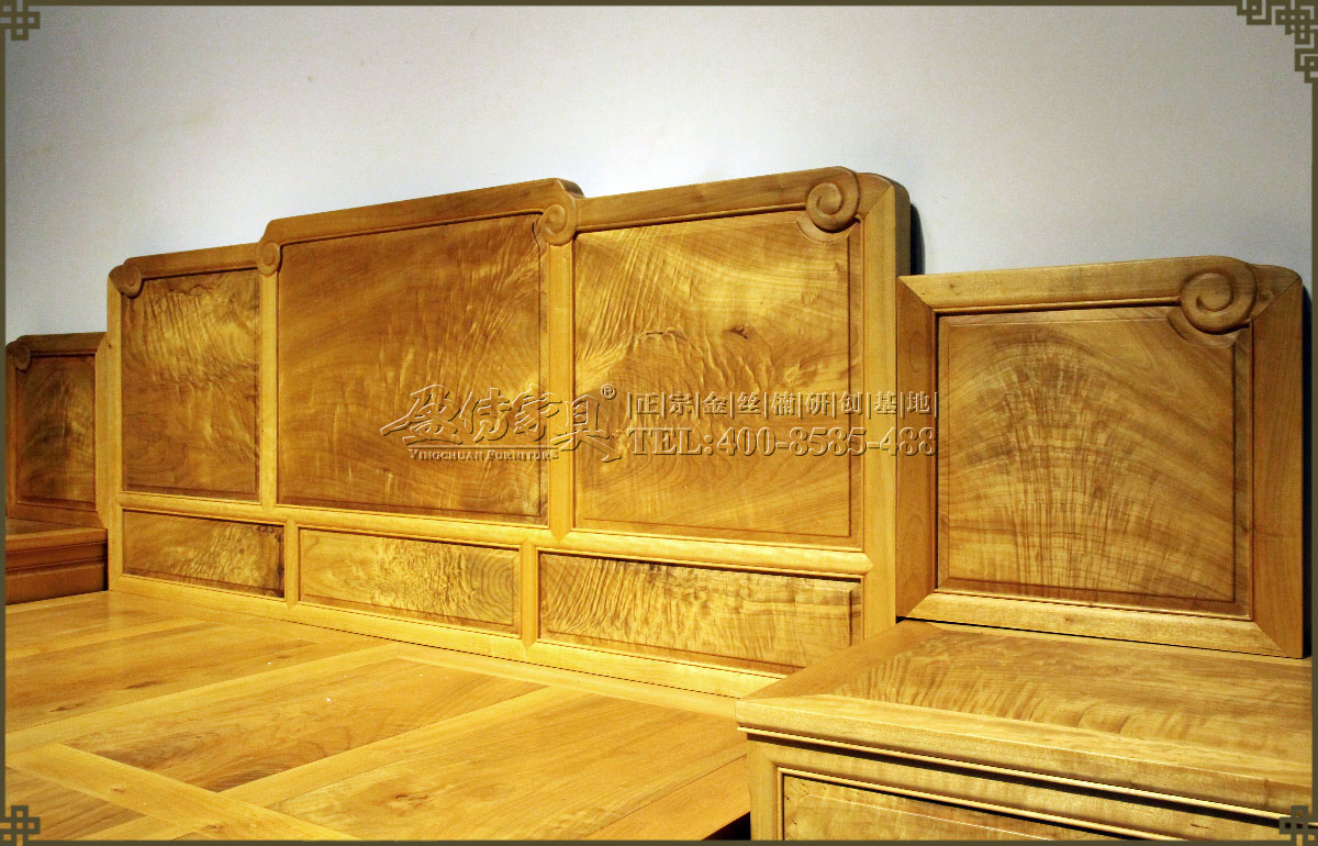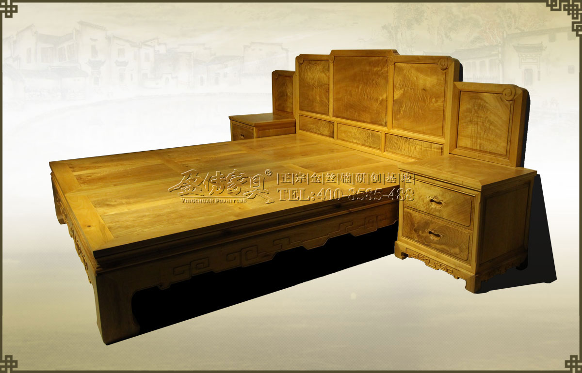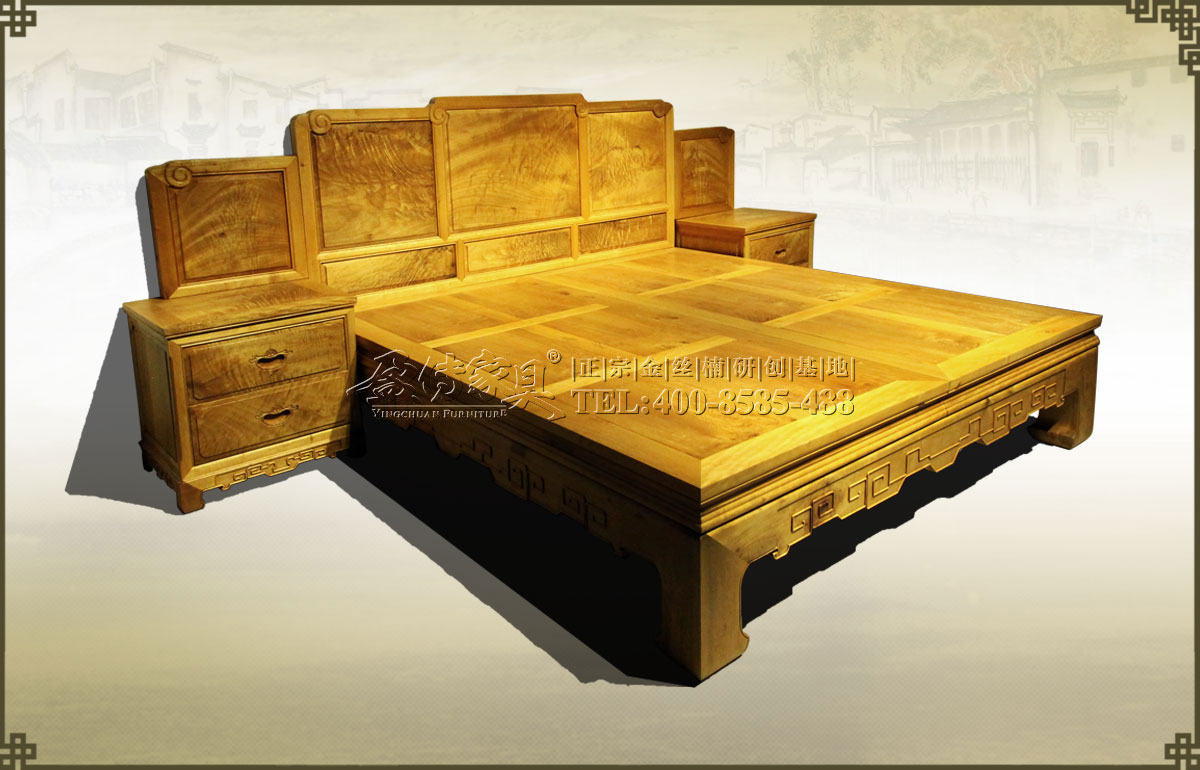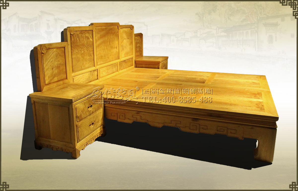 床頭面板呈階梯上升,寓意步步高升,床配有兩個床頭柜,拉手處雕飾蝙蝠圖案,象征福壽雙全,床面整潔平整,表面在燈光的照射下金光閃閃,金絲浮現,有一種至尊至貴的高雅氣息,床體下帶束腰,洼堂肚牙板與腿相連,直腿內翻馬蹄,做工十分講究。