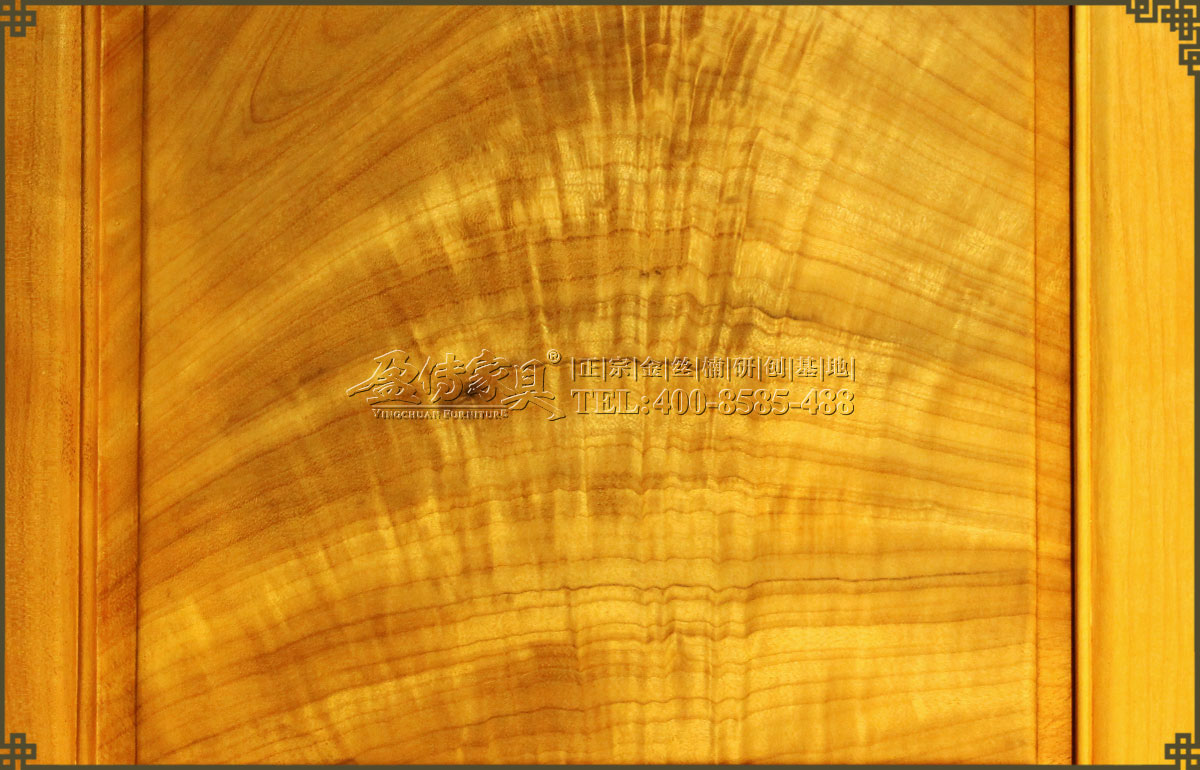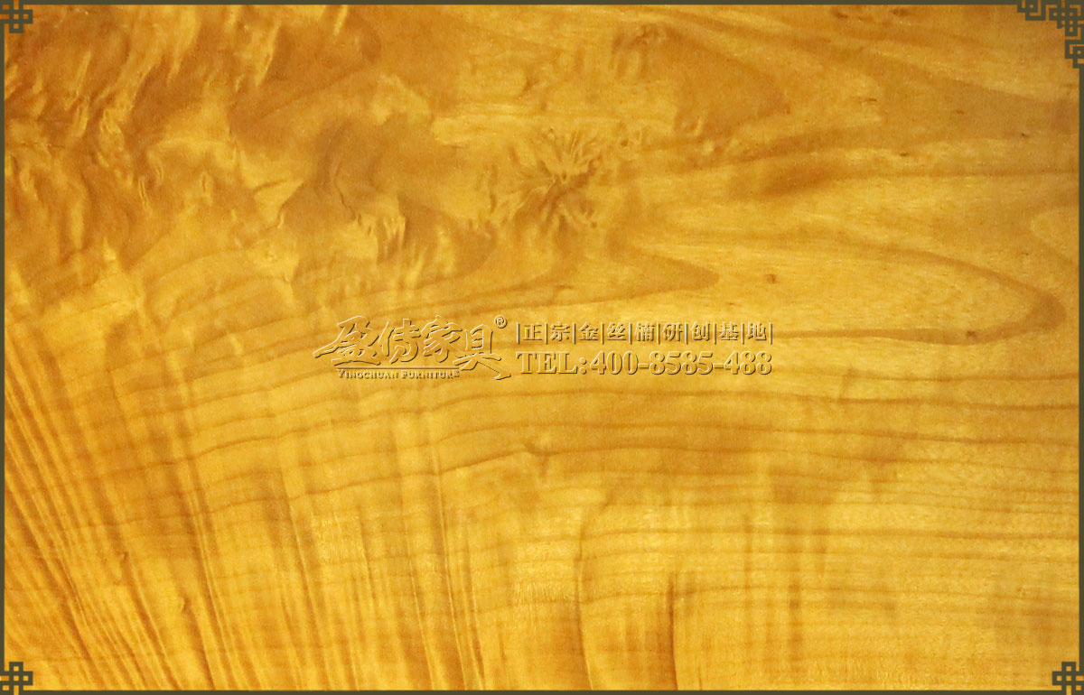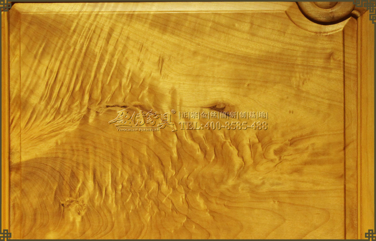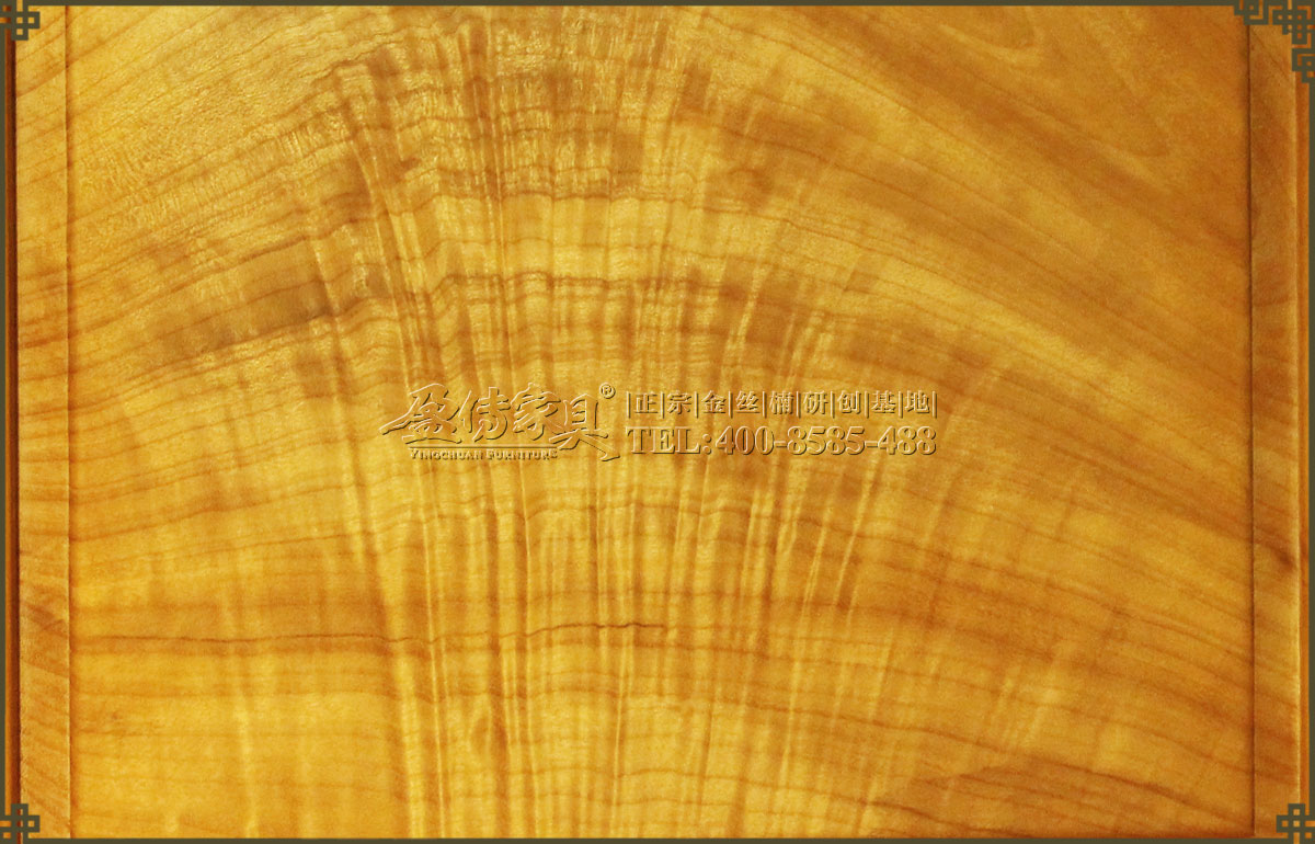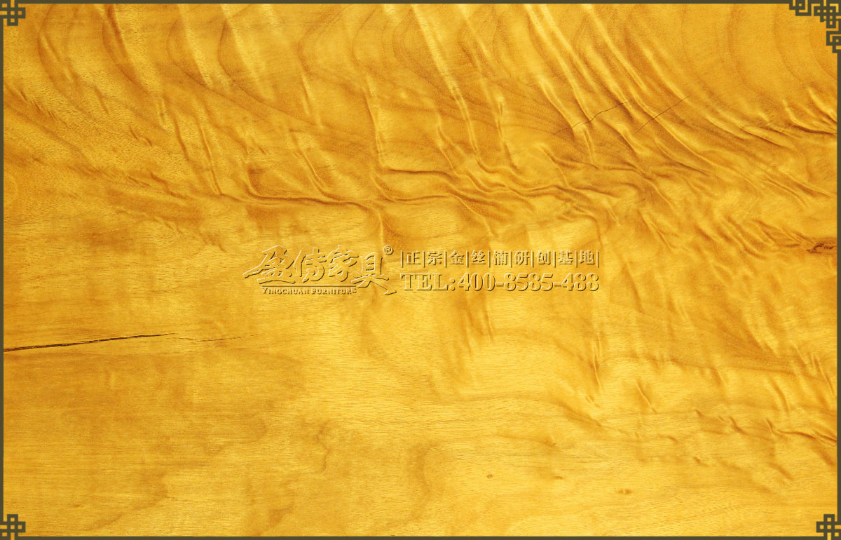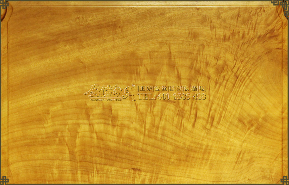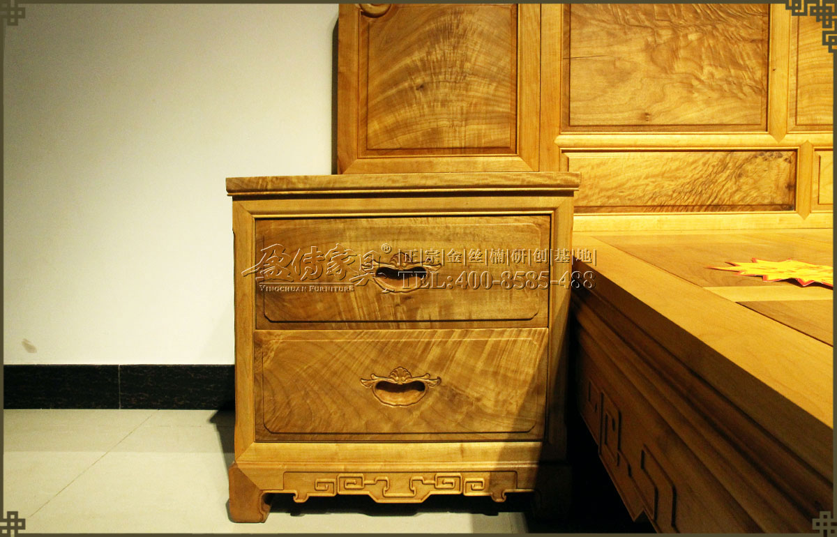 床頭面板呈階梯上升,寓意步步高升,床配有兩個床頭柜,拉手處雕飾蝙蝠圖案,象征福壽雙全,床面整潔平整,表面在燈光的照射下金光閃閃,金絲浮現,有一種至尊至貴的高雅氣息,床體下帶束腰,洼堂肚牙板與腿相連,直腿內翻馬蹄,做工十分講究。