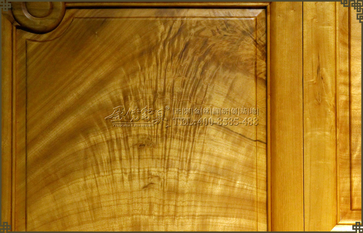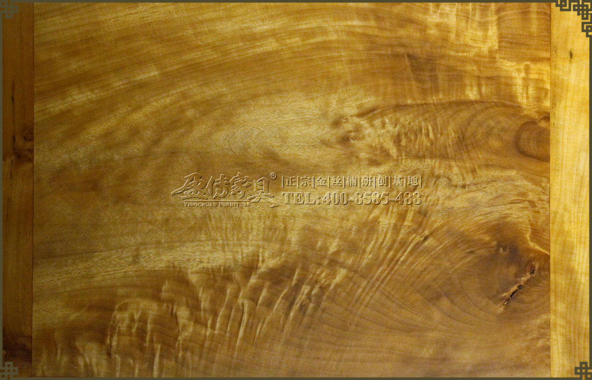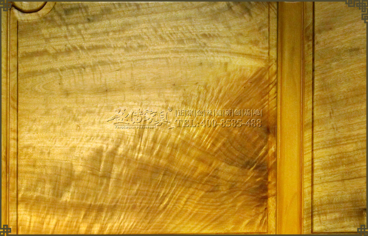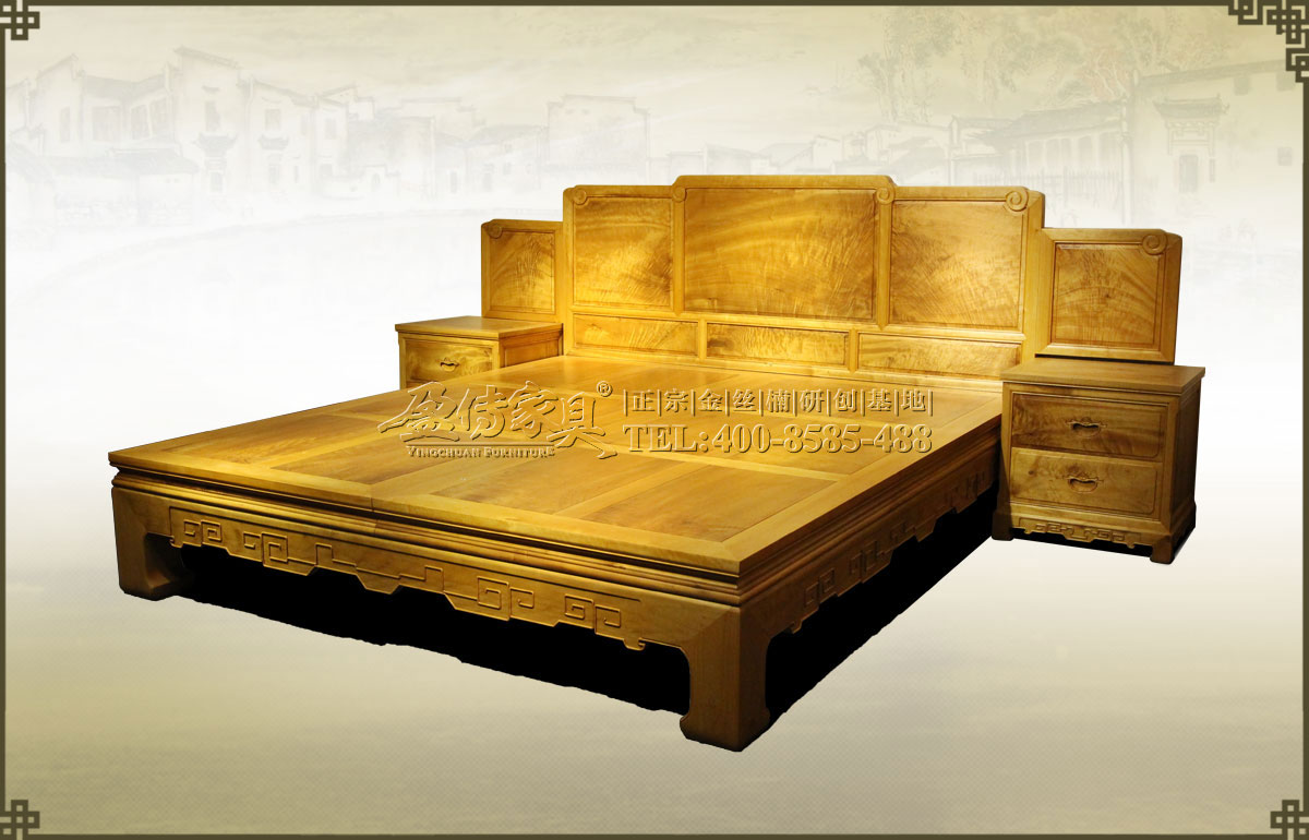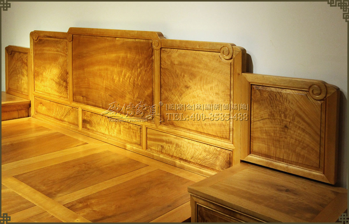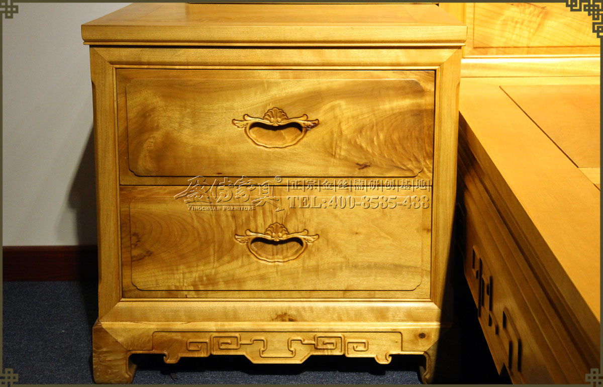 兩個床頭柜,拉手處雕飾蝙蝠圖案,象征福壽雙全,床面整潔平整,表面在燈光的照射下金光閃閃,金絲浮現,有一種至尊至貴的高雅氣息,床體下帶束腰,洼堂肚牙板與腿相連,直腿內翻馬蹄,做工十分講究。