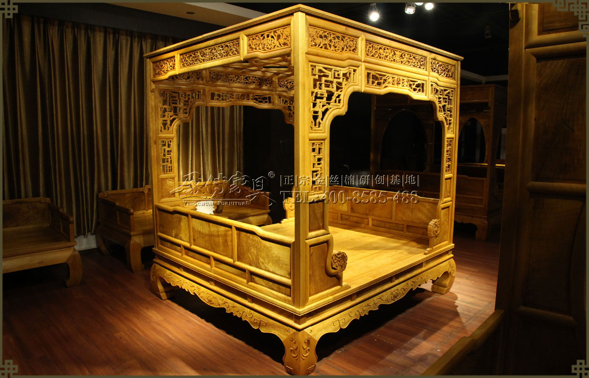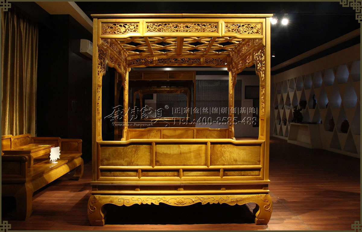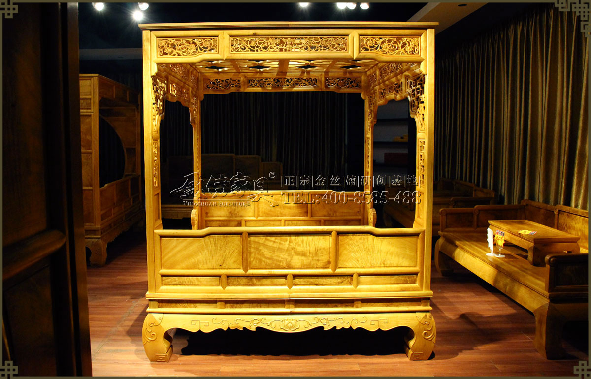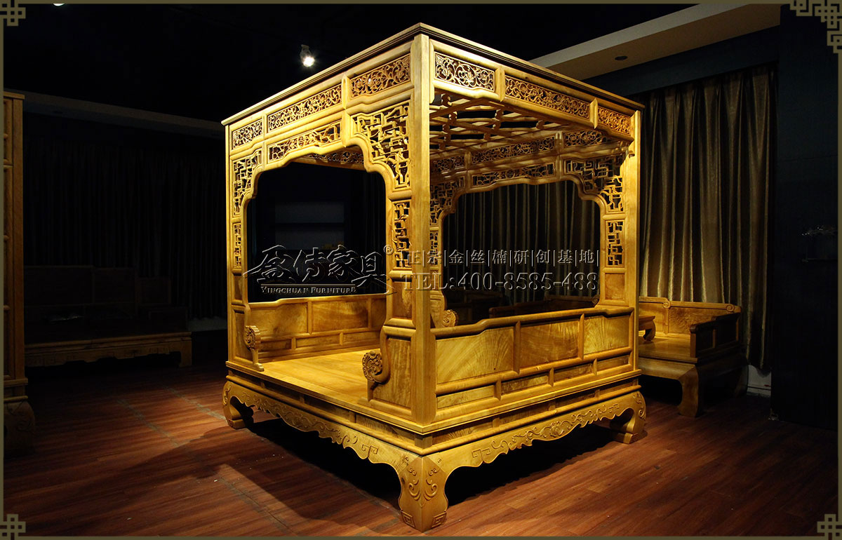 【名稱】:金絲楠藤蔓雕花架子床