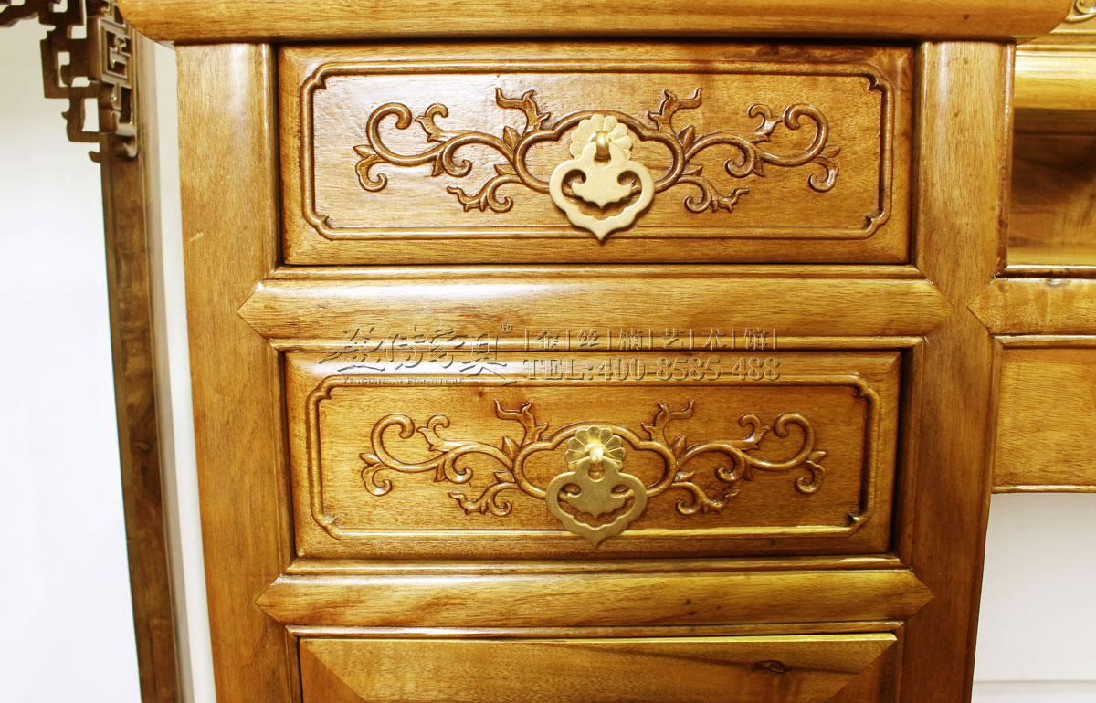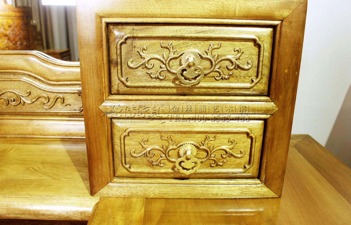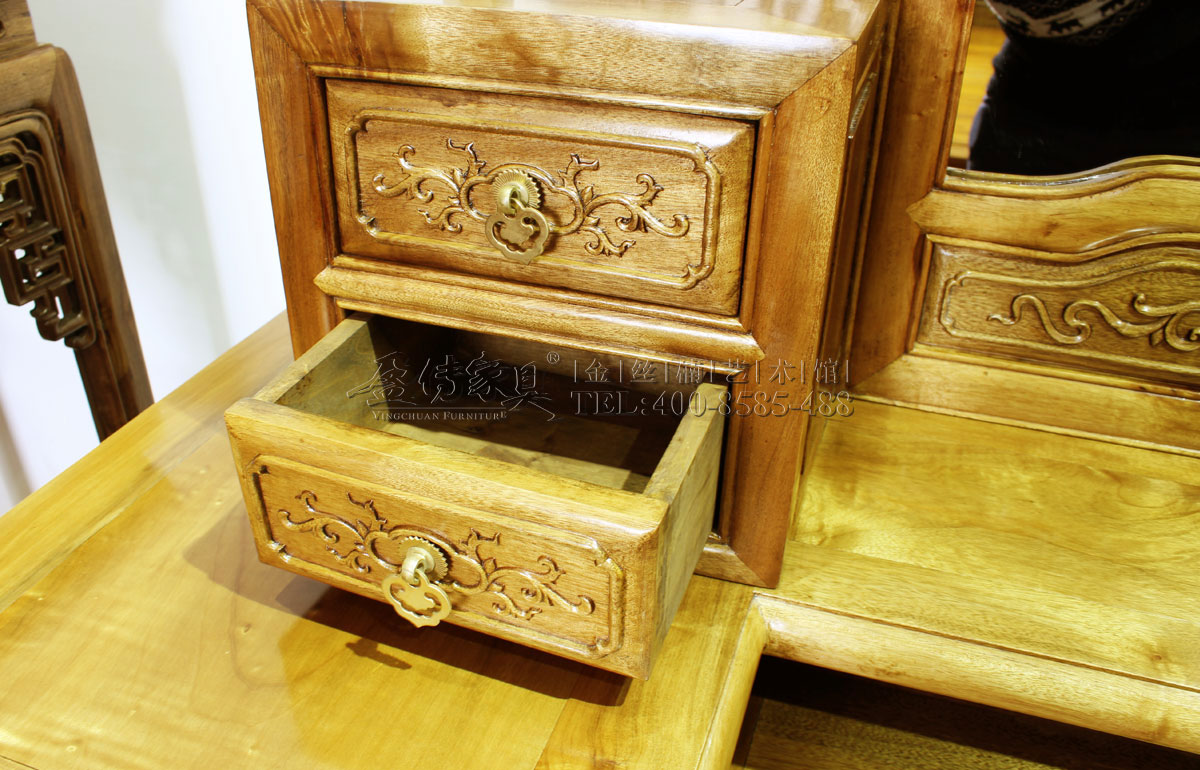 此梳妝柜設計考究、合理,能便于女子慢慢梳妝打扮,同時又能讓那些梳妝用具、化妝用品及首飾等,都能獲得妥帖的歸置。并且,這是名門大家閨秀的喜愛的式樣,用料大而不肥,雕刻多而不繁,造型華而不俗,欣賞美而不艷,有著獨特的氣質,像一位端正自持、優雅大方的淑女。