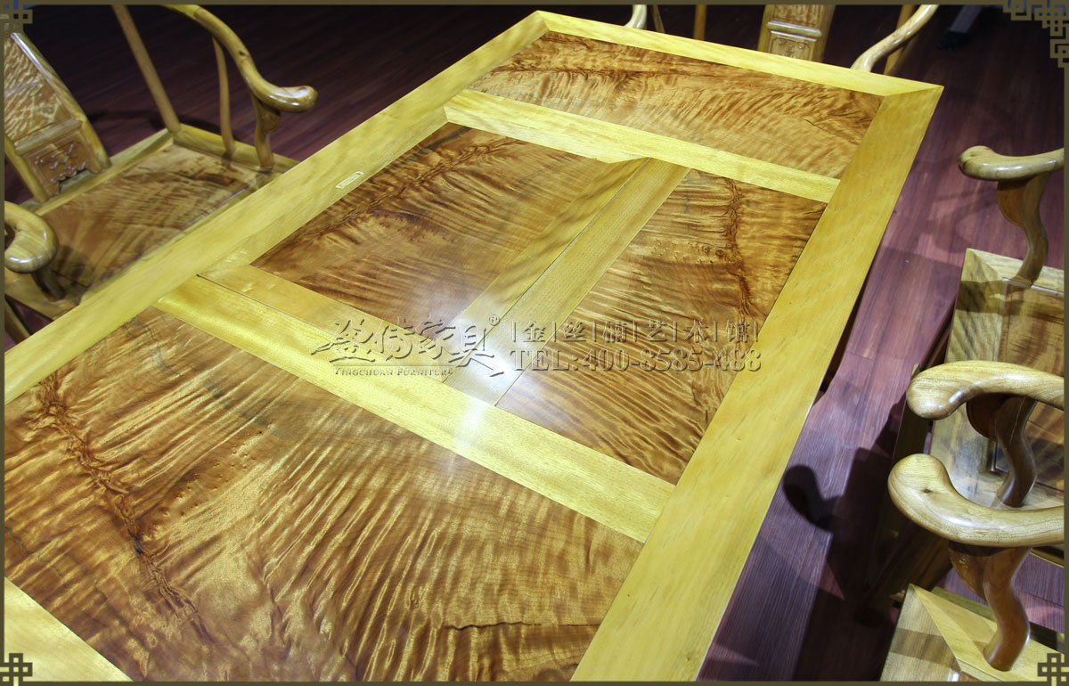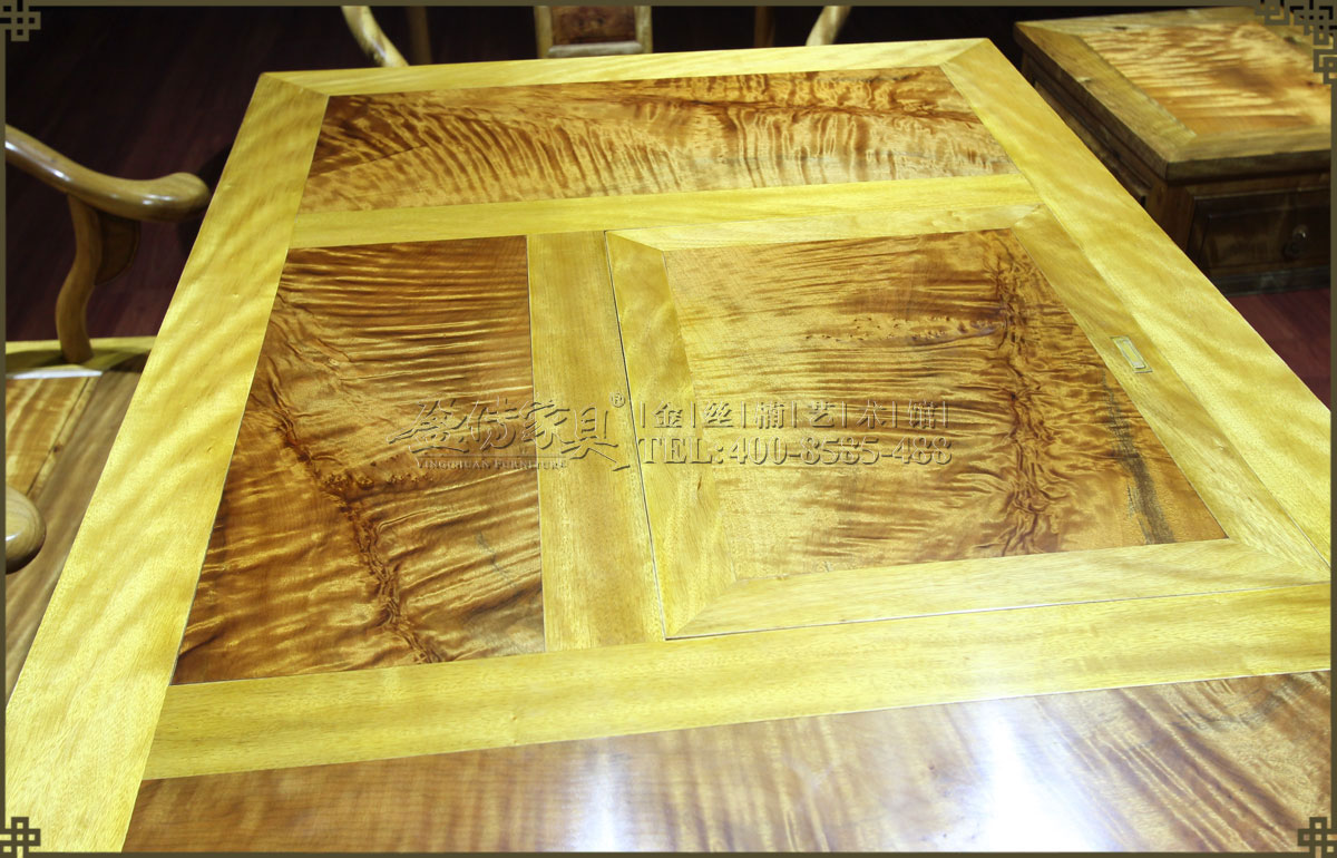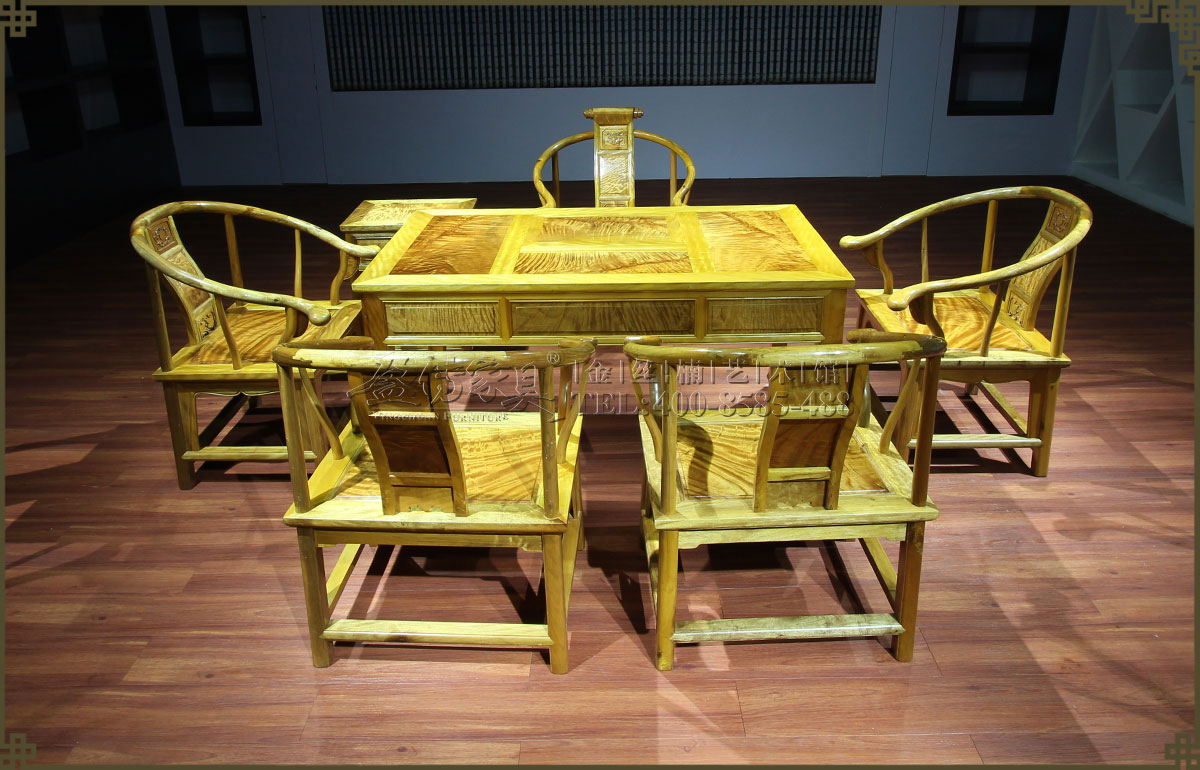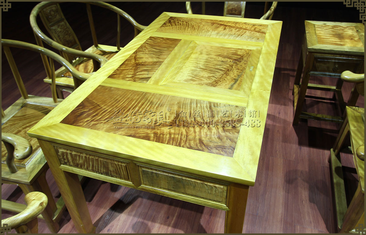 枯木老料金絲楠,紋路更老更顯,具有更高的收藏價值和欣賞價值。整個桌面和椅面都滿是水波紋,非常清晰和有立體感,富麗堂皇,金光閃閃,移步換景,每換一個角度看都是不同的感受,像水波、像霞光、像山巒,像綢緞……美得驚人。