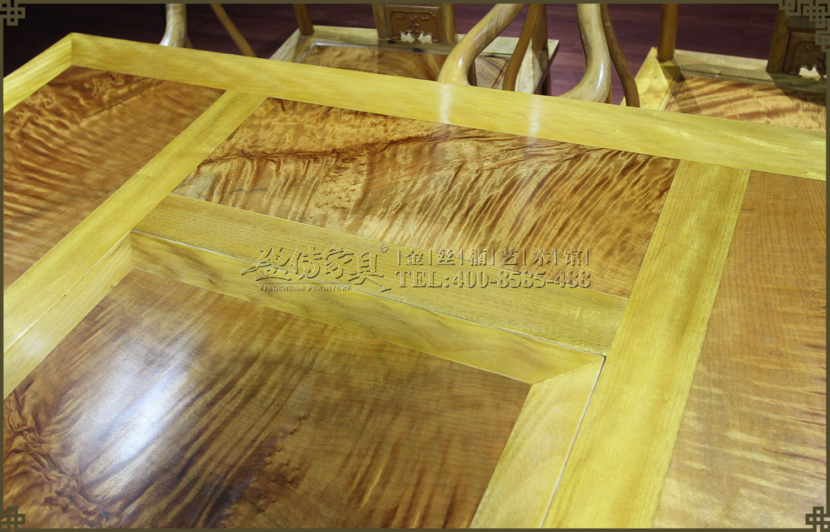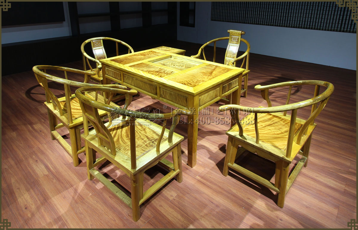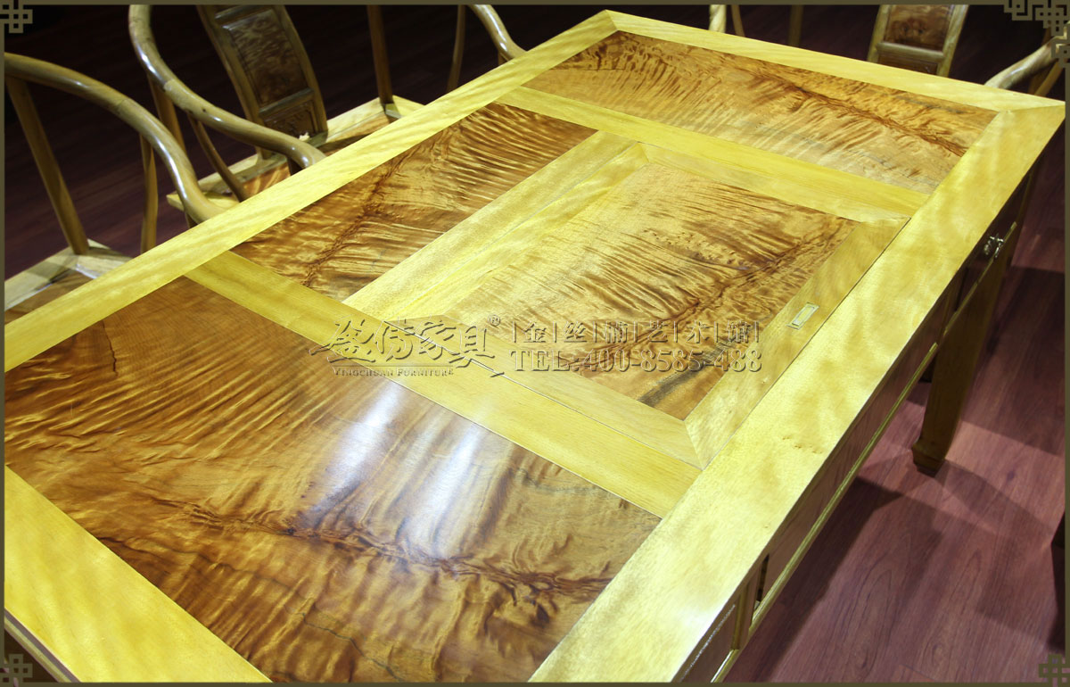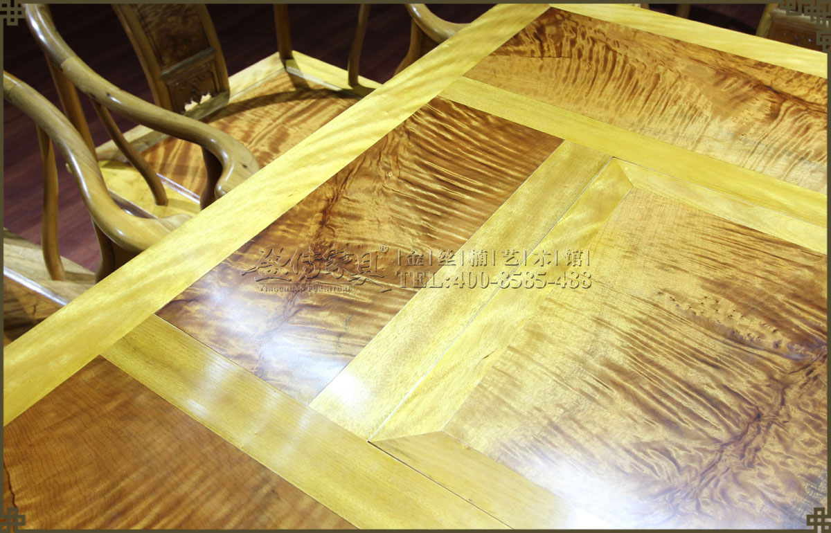 枯木老料金絲楠,紋路更老更顯,具有更高的收藏價值和欣賞價值。整個桌面和椅面都滿是水波紋,非常清晰和有立體感,富麗堂皇,金光閃閃,移步換景,每換一個角度看都是不同的感受,像水波、像霞光、像山巒,像綢緞……美得驚人。