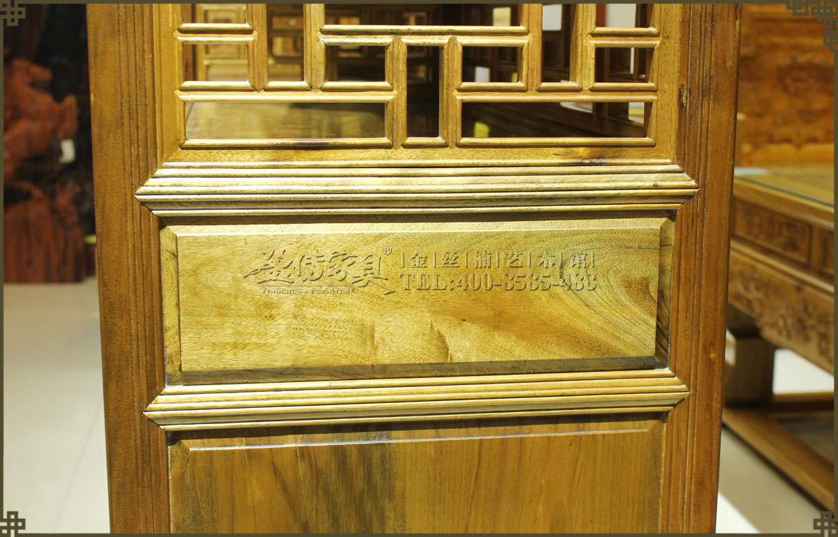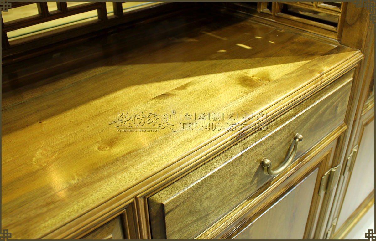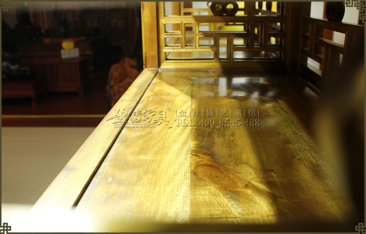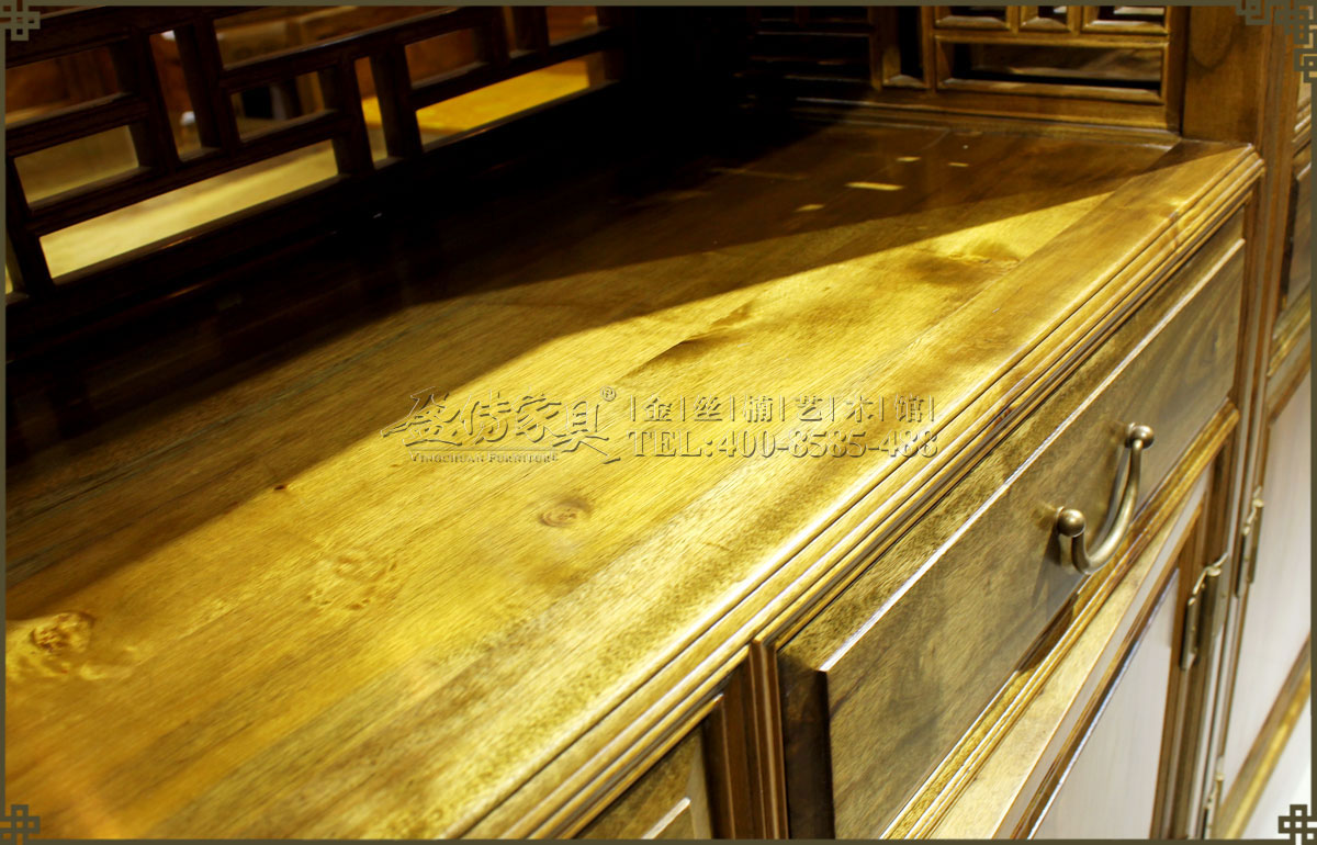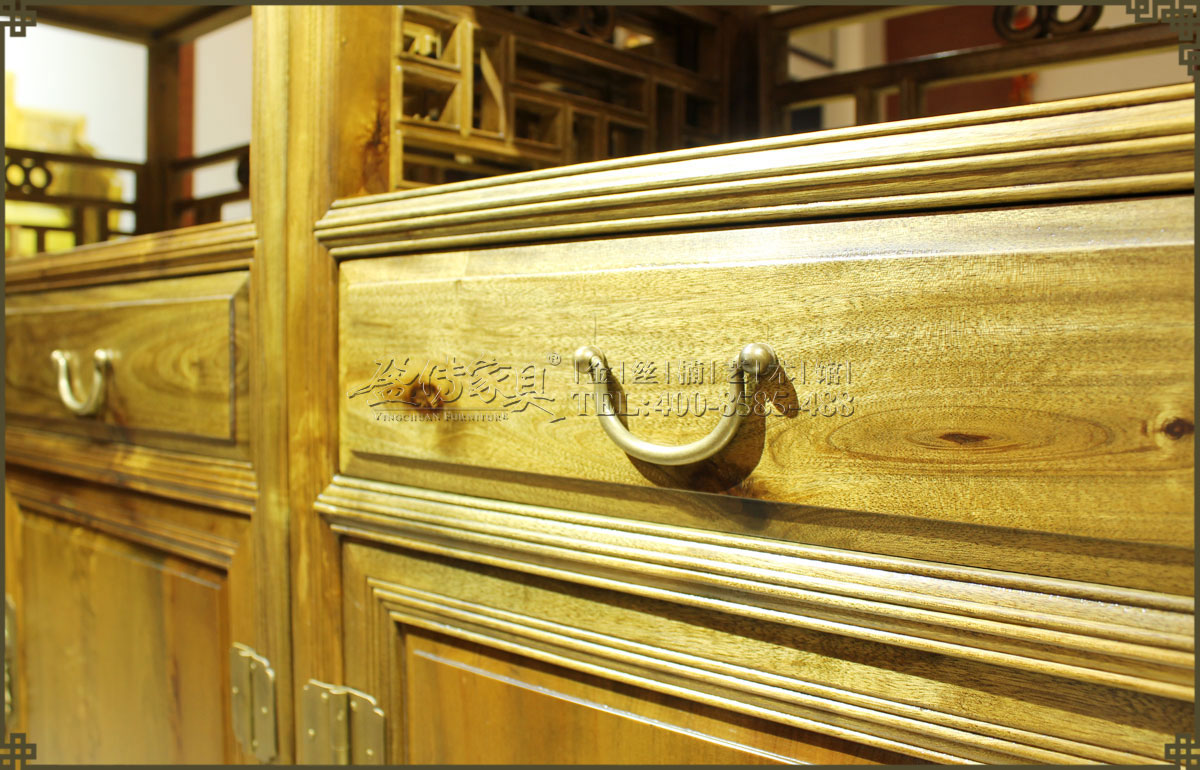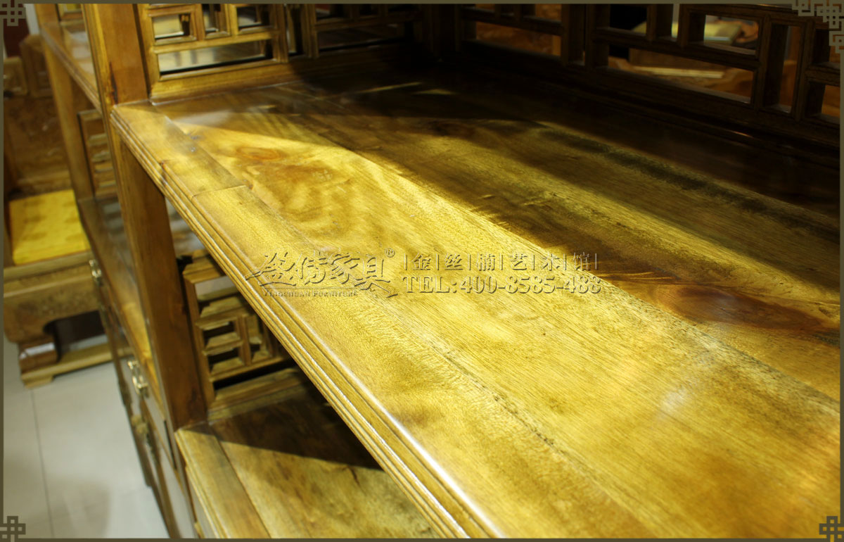 此金絲楠格架專為書房所制。上部分分三層,正面開敞,兩側及背面攢接幾何紋欞格,內置文物,可通風保燥,又可方便觀察,乃明清大家書房必制之器。中間有抽斗,下部分帶柜門,美觀又實用性強。