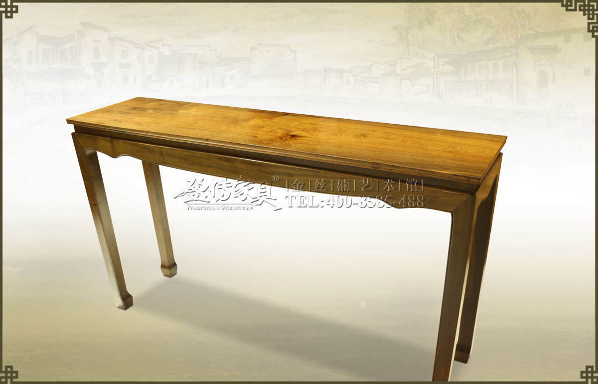 案面平直、無(wú)束腰,款式簡(jiǎn)練、經(jīng)典,優(yōu)美而牢固,秀挺古樸。如果擺在書(shū)房,會(huì)使書(shū)房增色。如果放置在廳堂正中,更會(huì)顯得雅致、莊重、大氣,對(duì)廳堂的規(guī)格和品位起到畫(huà)龍點(diǎn)睛的作用,令人叫絕。