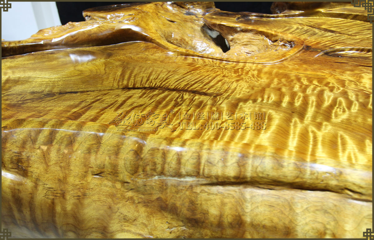 此茶臺結(jié)晶率高,金絲飽滿。紋路密集異常清晰,立體感特別強,層層疊疊,橫看成嶺側(cè)成峰,非常奇特,非常強。樹齡比普通金絲楠大,珍稀罕有,可遇而不可求,升值空間極大,無論觀賞、使用、收藏都是極品。
