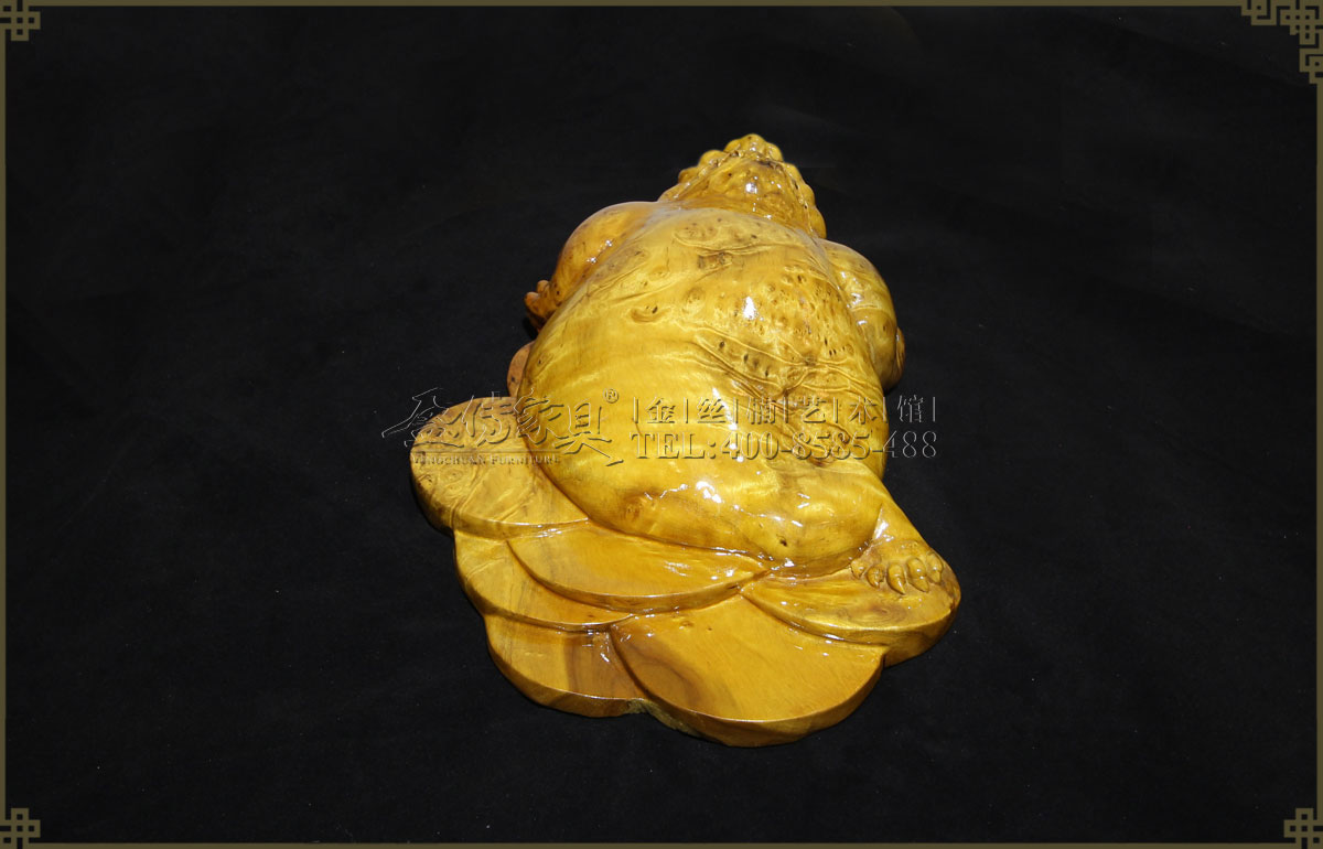 此金絲楠癭木三腳金蟾由罕見的金絲楠樹瘤雕刻而成,生成條件苛刻,稀少又難得,故為收藏之佳品。這個部位的木材紋理漂亮特殊,裝飾效果奇異,歷來很受人喜愛。其滿瘤花紋如蓮子靜若處子,如山水飄渺自然,如葡萄晶瑩剔透,意境無限,精美異常,屬上等紋理。