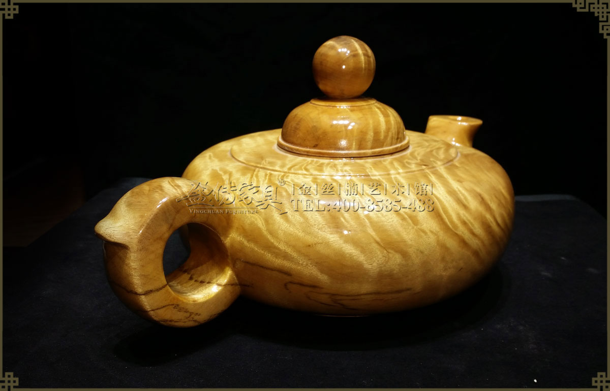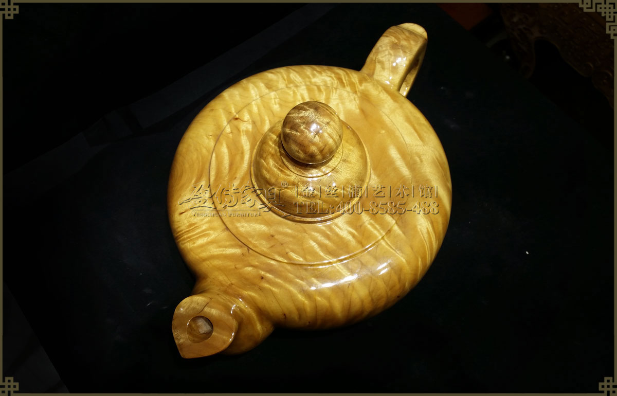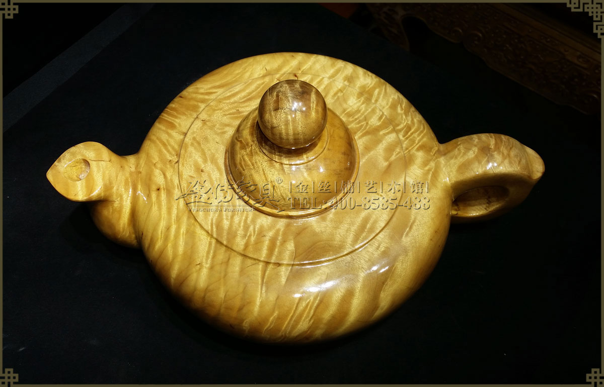 此金絲楠茶壺由工藝大師精心手工雕刻,形態優美,線條流暢,手感細膩圓潤,金絲褶褶生輝,淡淡的水波紋彷如泛起漣漪的平靜湖面,讓觀賞的人內心平和。整體高雅脫俗,韻味留長,散發著中國文化古典之美,體現主人極渾厚的文化內涵和極高雅興的收藏品味。