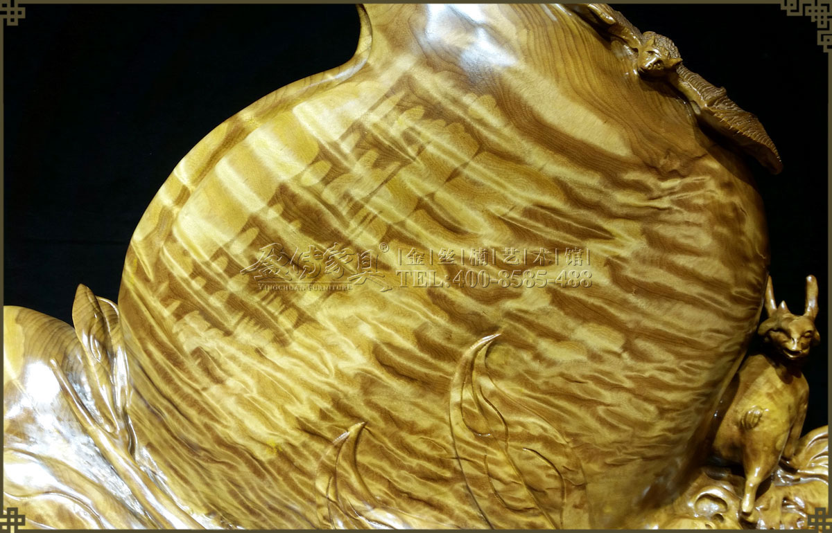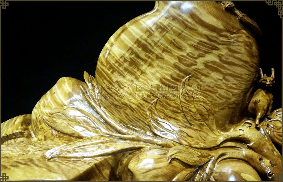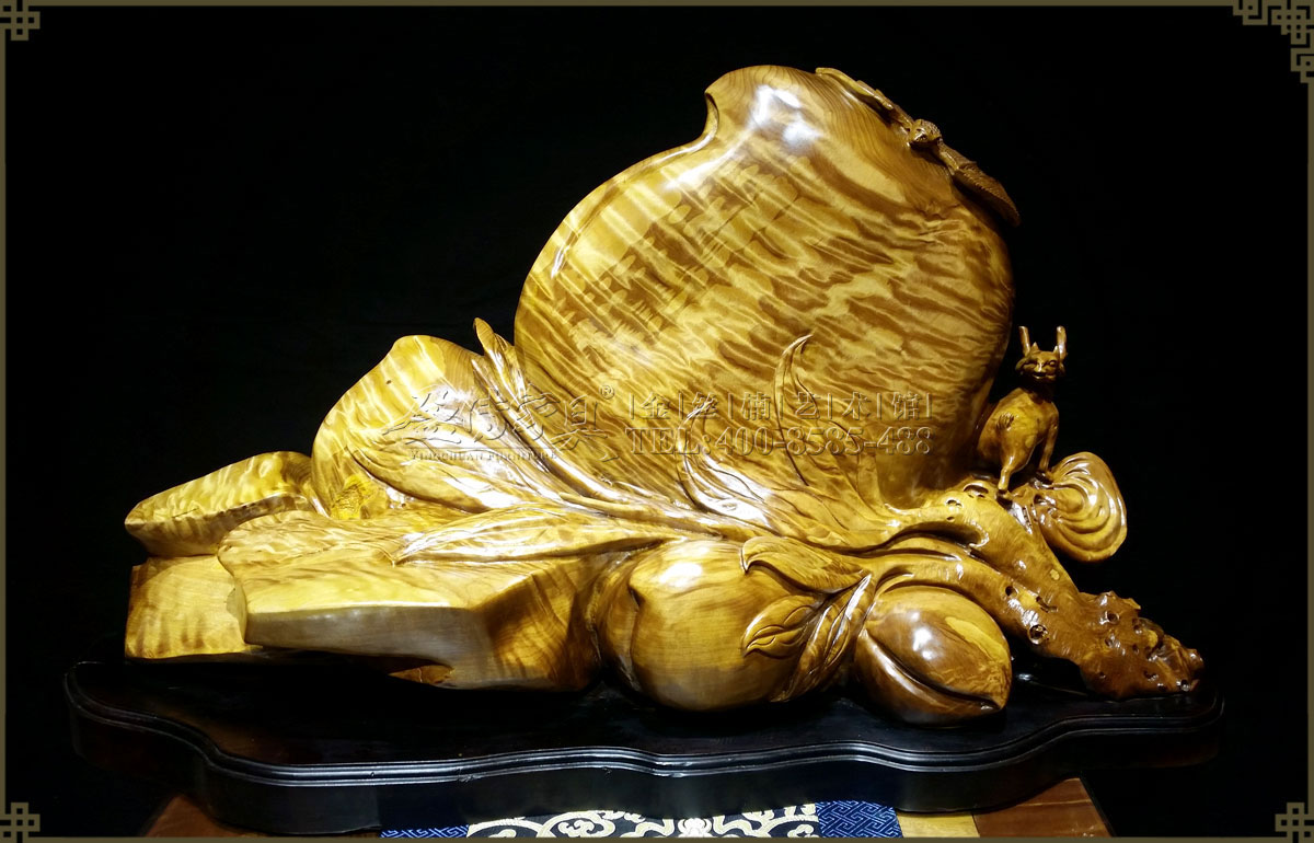 自古以來,壽桃是祝壽文化中必不可少的元素。蝙蝠的“蝠”諧音“福”,鹿諧音“祿”,桃、蝙蝠和鹿的組合寓意“福祿壽皆存”。 而且,此金絲楠壽桃藝術擺件極為漂亮,枝葉、果實疏密相間、錯落有致,造型厚重結實,形態飽滿大氣,表現出旺盛的生命力。層次分明的水波紋有很強的立體感,清晰獨特,不同的光線下有著千變萬化的光影效果,魅力四射。光滑柔潤的手感,讓人愛不釋手,是送親人、送老前輩、送老領導的最佳禮物.