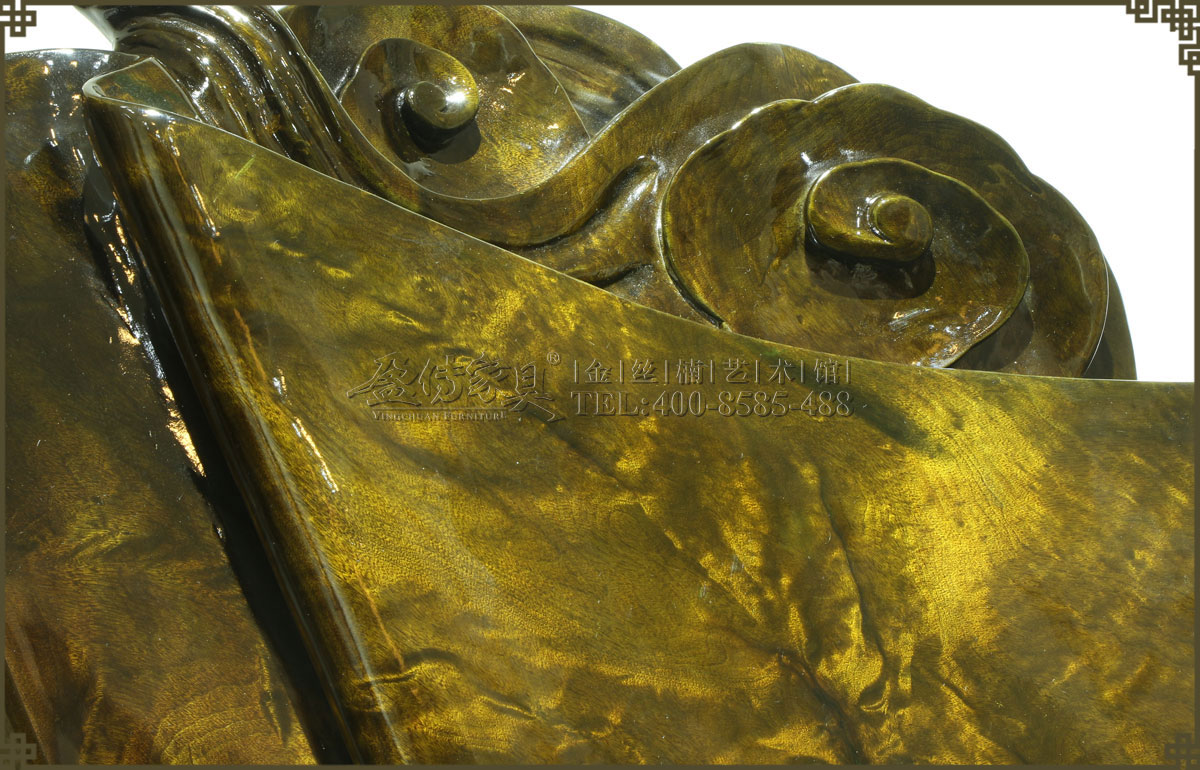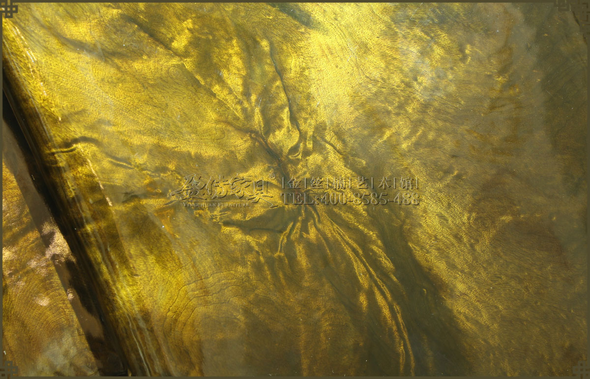 此金絲楠陰沉木手感細(xì)膩,光照下質(zhì)地晶瑩,金絲成色很高,紋路眩美,像霞光、像波瀾……有步移景換的奇幻效果,讓人欲罷不能。