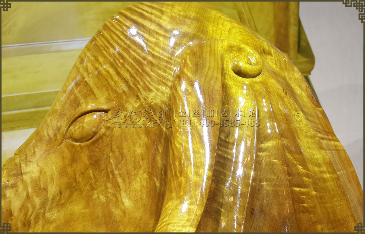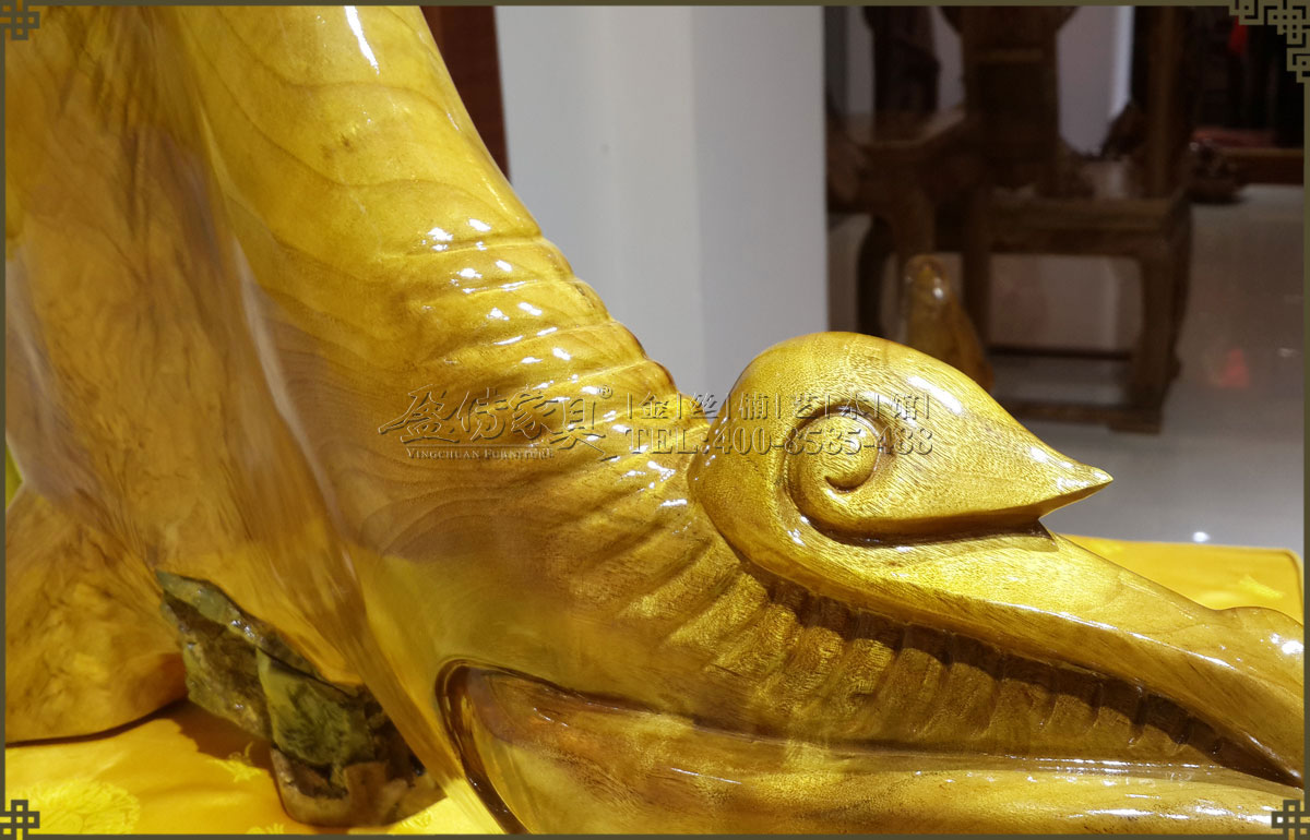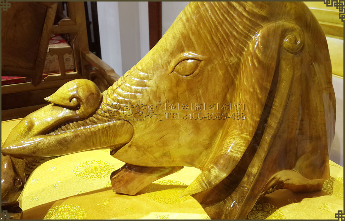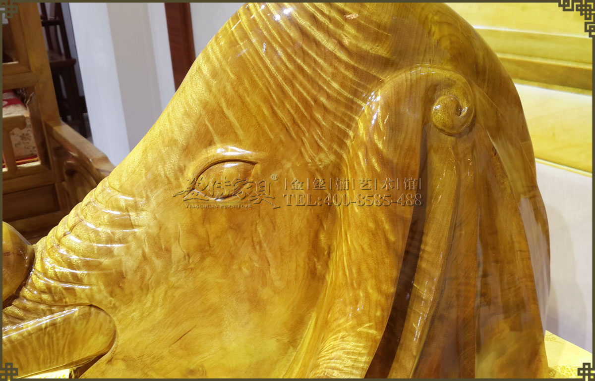 此金絲楠象為人工精雕細刻,精致考究,線條流暢,栩栩如生。用料精細,手感溫潤。水波紋清晰漂亮,優美奇特,攝人心魂。背面有“根抱石”的自然現象,奇特別致。