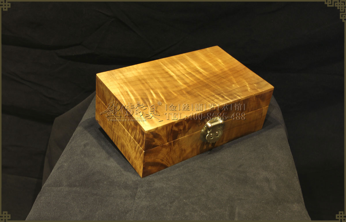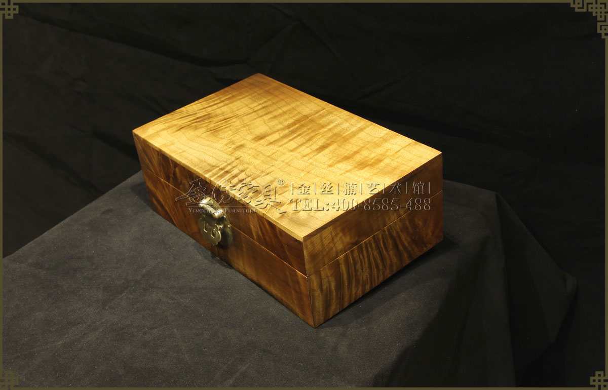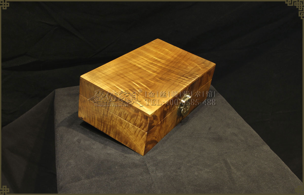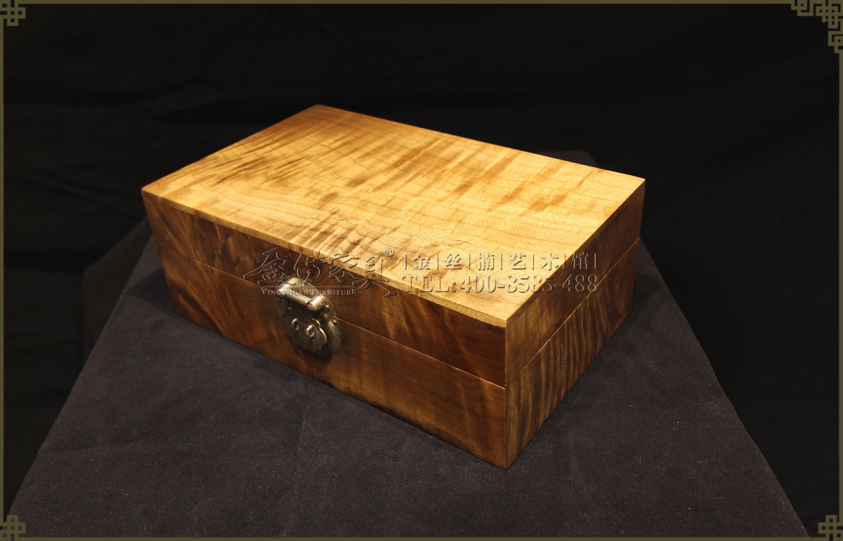 此金絲楠首飾盒散發閃閃金光,紋路獨特,絢麗華美,色澤漂亮。設計以簡潔大方取勝,以別致典雅見長,清秀細膩,低調奢華。散發清幽的木香之氣,令人心曠神怡。珍貴的首飾,重要的物件,就應該安放在如此精美的收納盒之中。