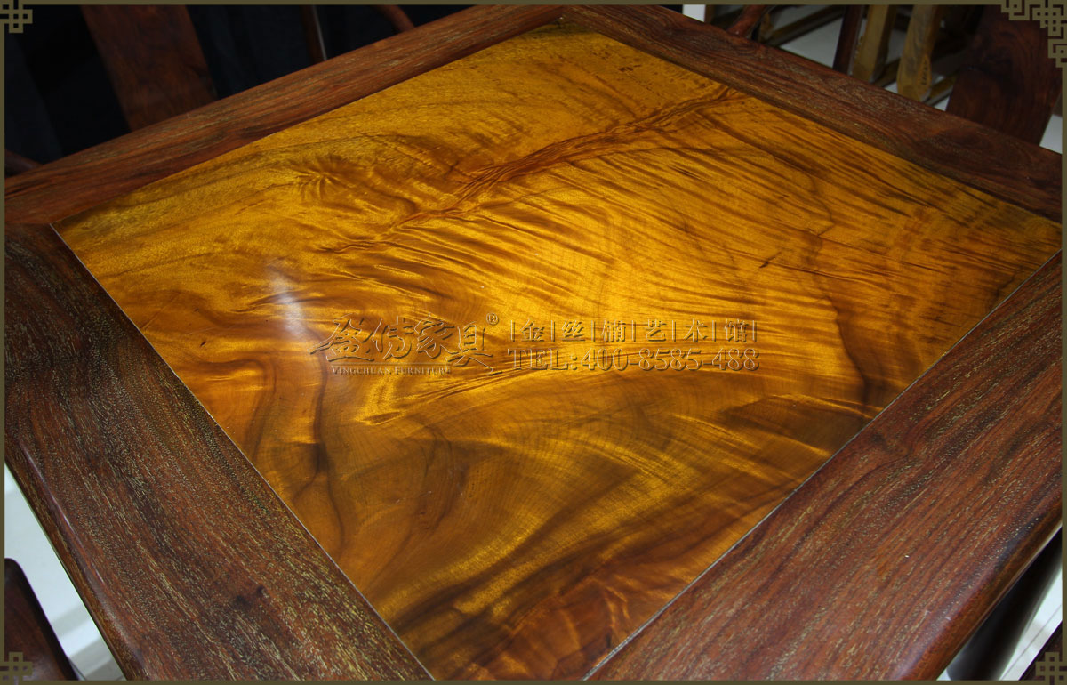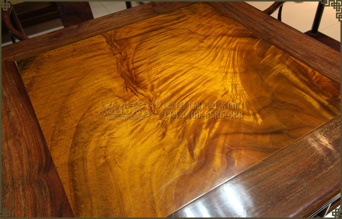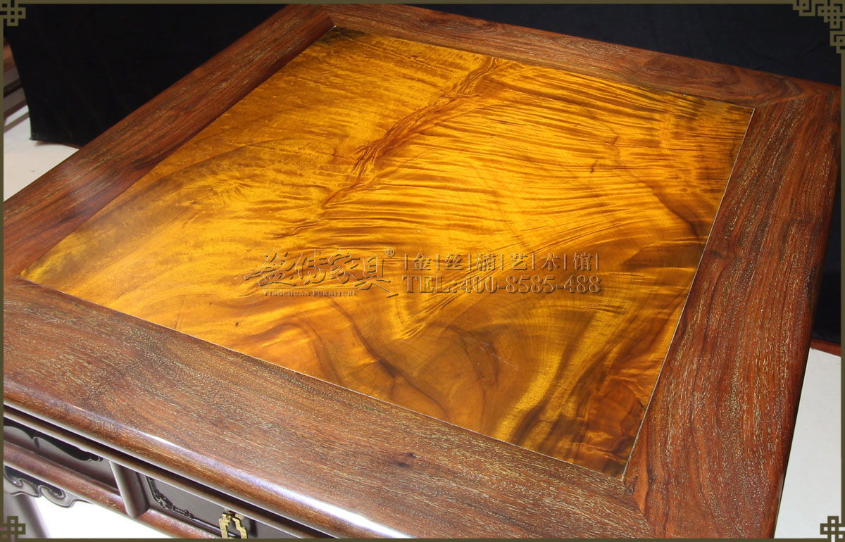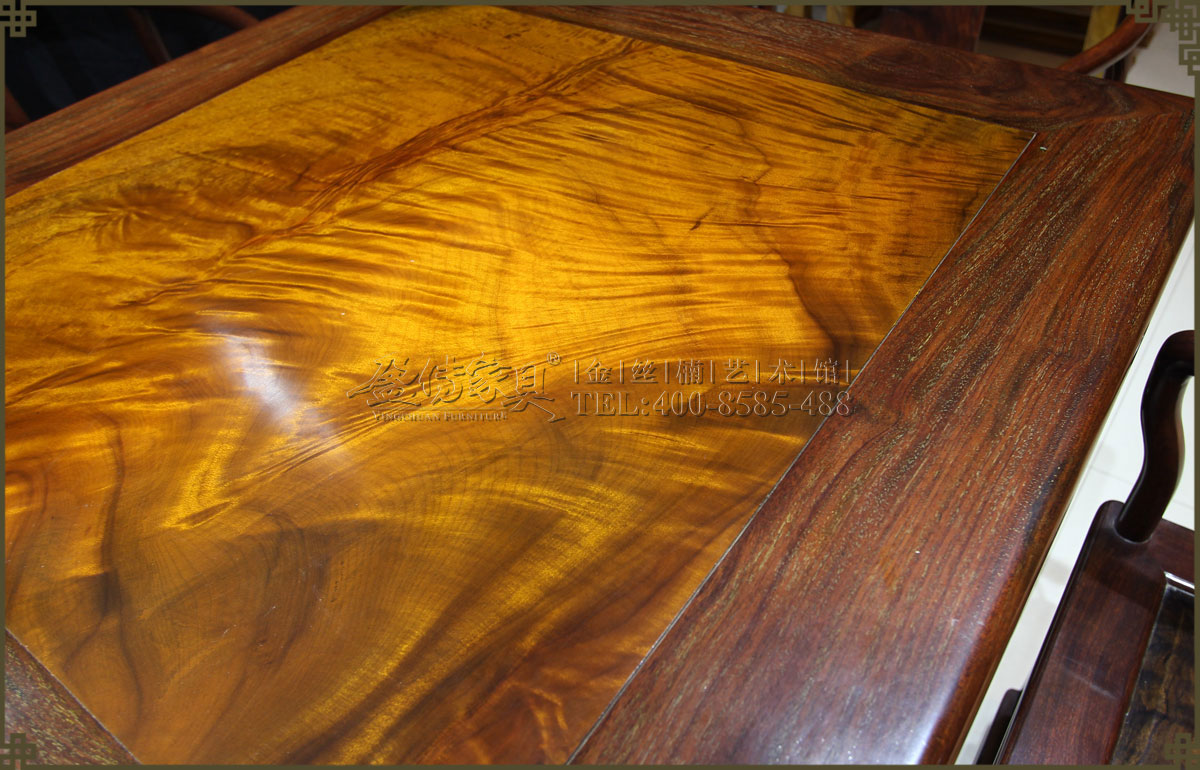 此套茶桌采用周身紅椿加金絲楠陰沉木面板制作而成,是鳳毛麟角的極佳品,可遇而不可求。紅椿古典優(yōu)雅,紋理美觀大方,給整個作品增加了獨特、靜雅的氣韻。陰沉金絲楠面板紋理瑰麗豪華,豐富密集,立體感強,橫看成嶺側成峰,像行云流水、像漫天霞光、像鳳凰羽毛、像水波漣漪,令人目不暇接,驚嘆不已。具有極高的收藏價值和欣賞價值,是金絲楠家具中不可多得的精品。