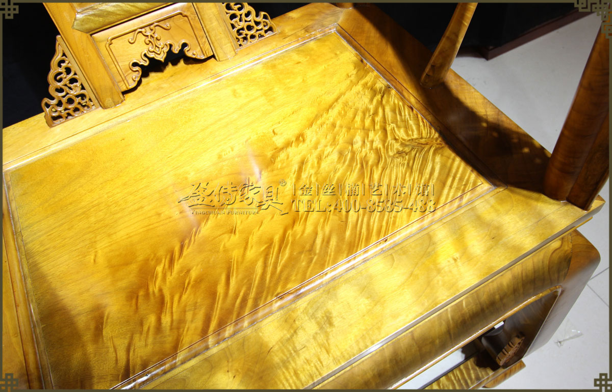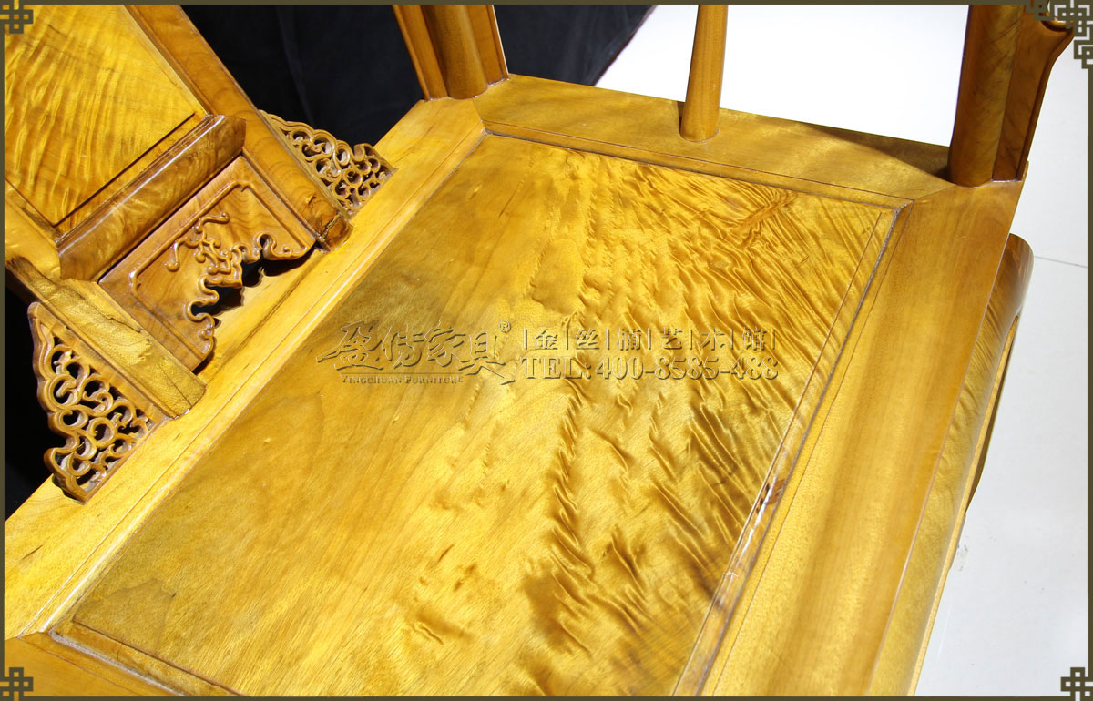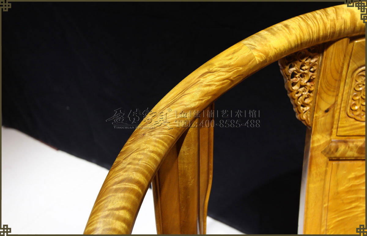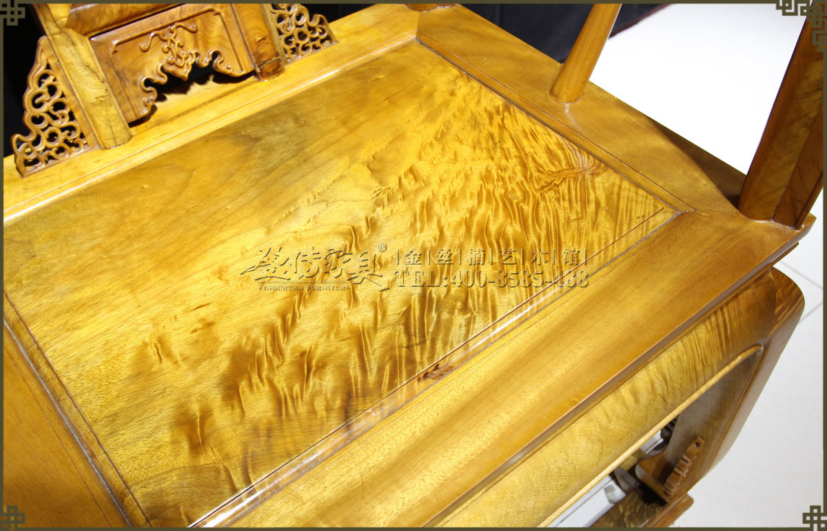 此金絲楠皇宮椅3件套整體大氣大派,高雅華貴。色澤極好,極品水波紋清晰可見,美侖美奐,變化無窮。選料精,做工細,手感極其細膩,撫之猶如嬰兒皮膚。椅背和扶手采用了高難度雕飾,工藝繁瑣,精美漂亮,更添魅力。整體含蓄而不深藏,華麗而不刺眼,越用越有味道,具有很高的藝術欣賞價值和收藏價值。