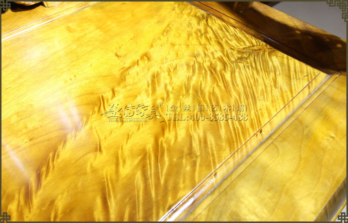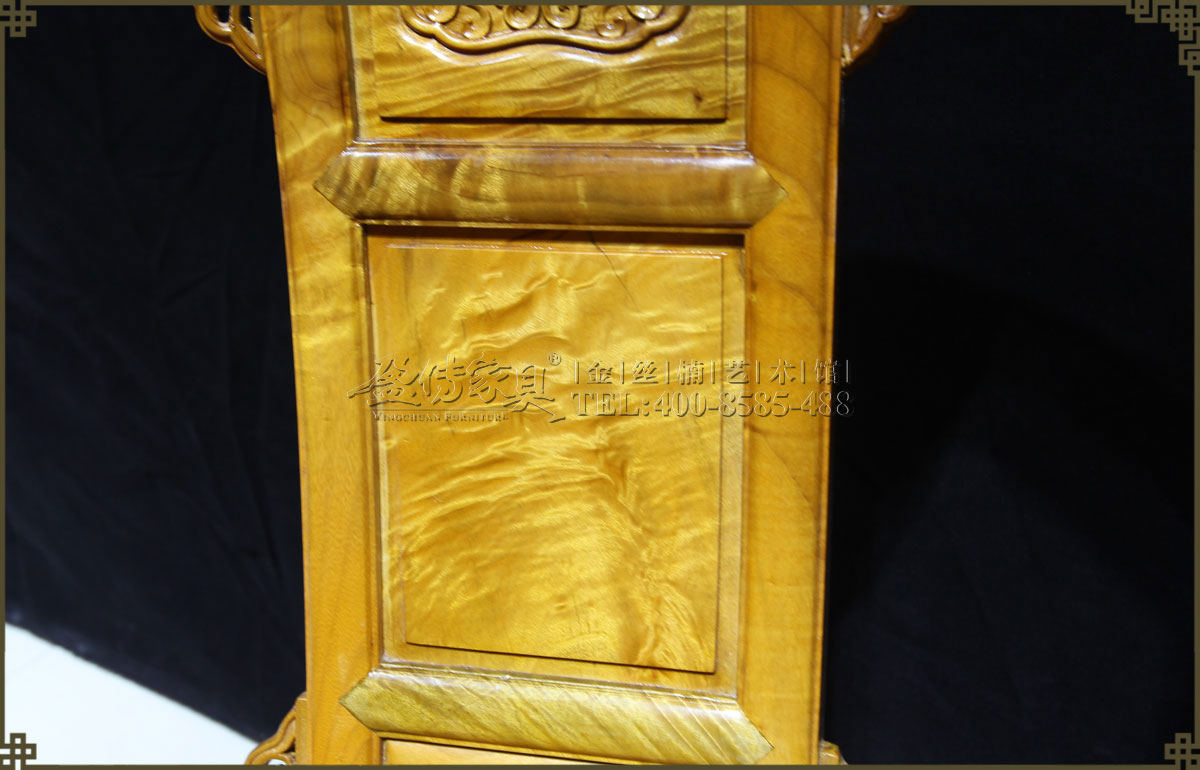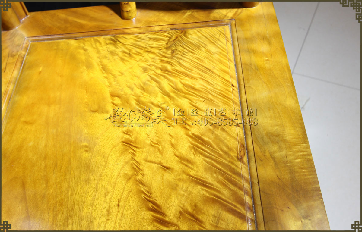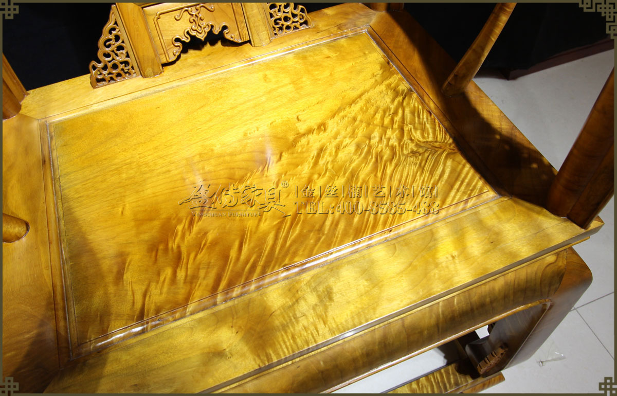 此金絲楠皇宮椅3件套整體大氣大派,高雅華貴。色澤極好,極品水波紋清晰可見,美侖美奐,變化無窮。選料精,做工細,手感極其細膩,撫之猶如嬰兒皮膚。椅背和扶手采用了高難度雕飾,工藝繁瑣,精美漂亮,更添魅力。整體含蓄而不深藏,華麗而不刺眼,越用越有味道,具有很高的藝術欣賞價值和收藏價值。