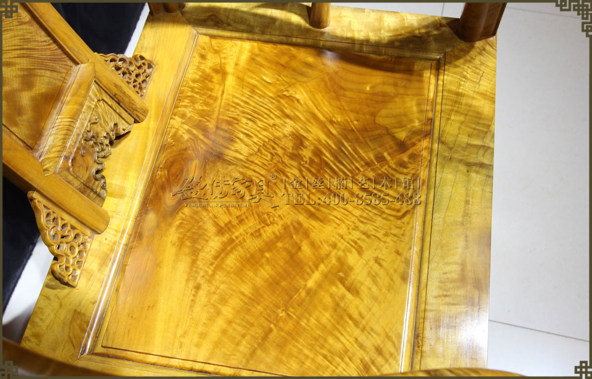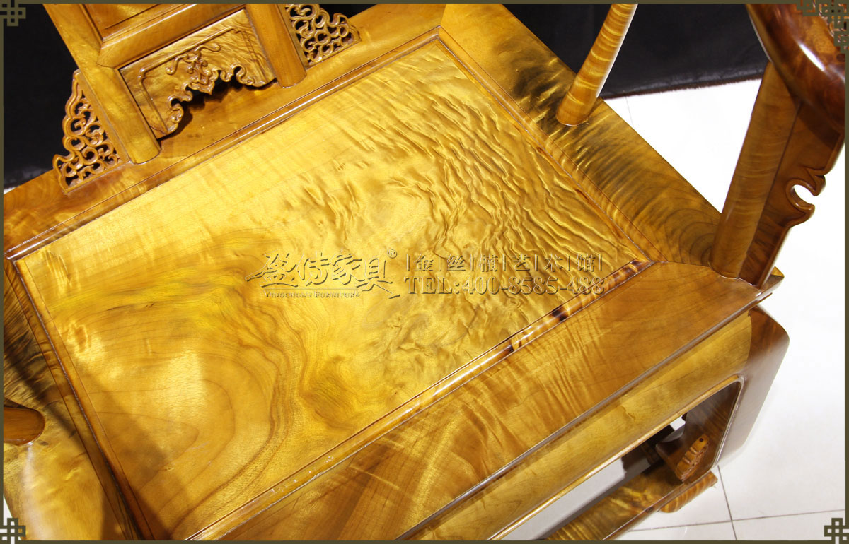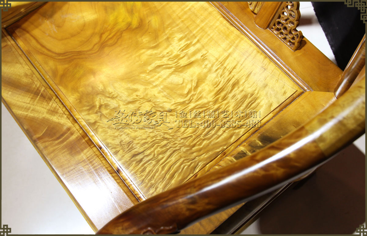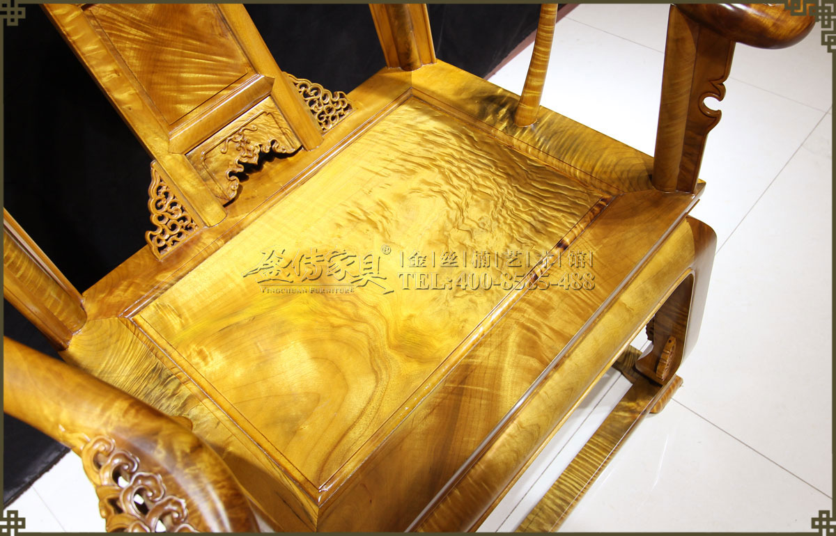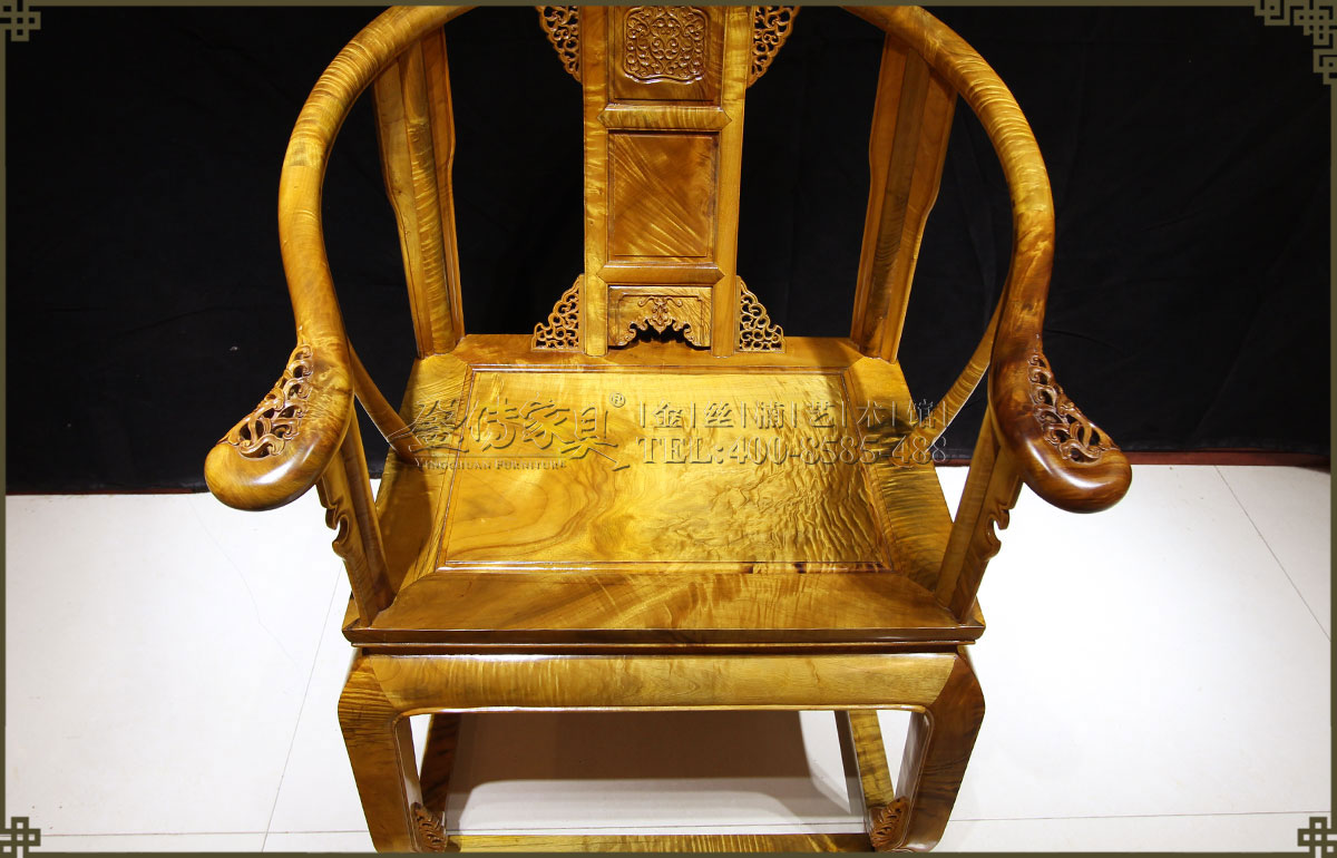介紹:此皇宮椅選料精,采用上好的金絲楠,金絲成色高,光照下金黃奪目,璀璨眩美,紋理移步換景,如行云流水,又像波濤……做工考究精細,有束腰帶拖泥,靠背和扶手符合人體工程學,線條流暢,不失明式家具之風格。雕飾精美繁多,但不顯得繁瑣,實乃古典家具中的精品。