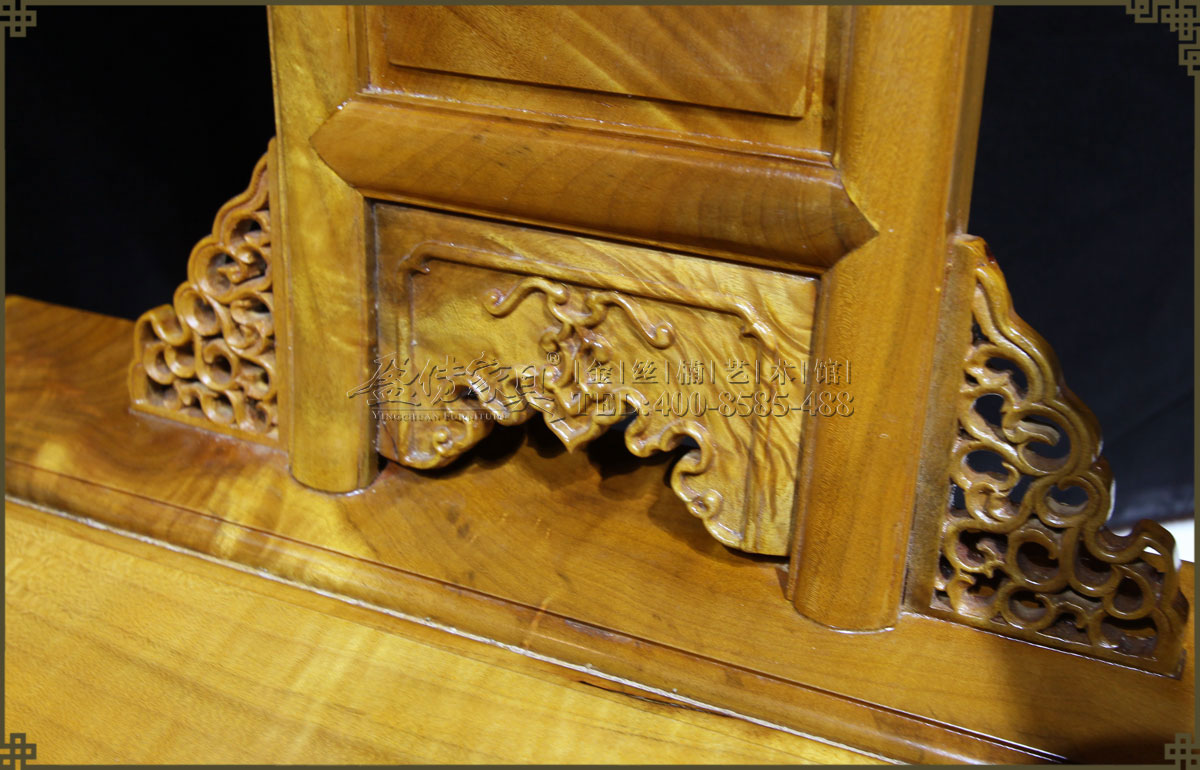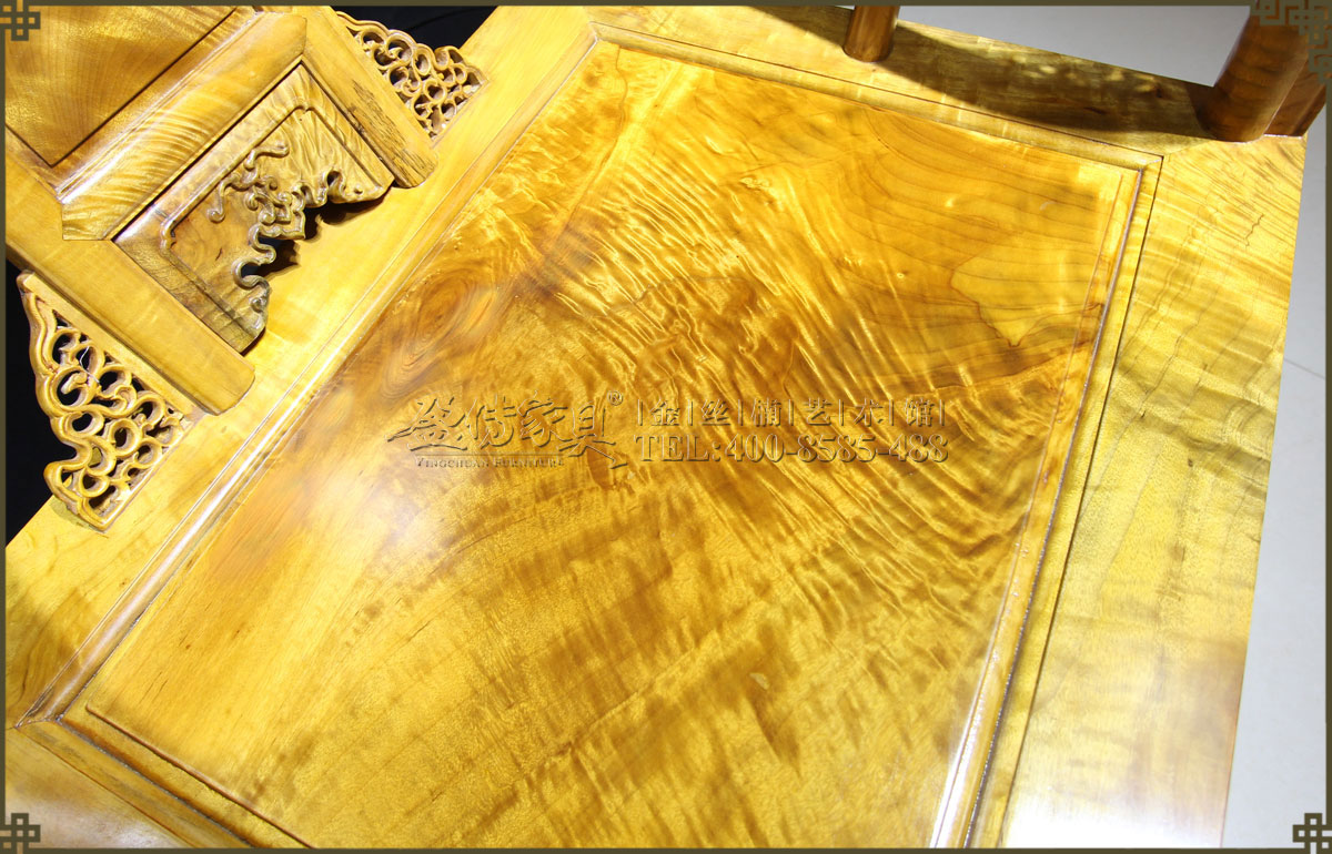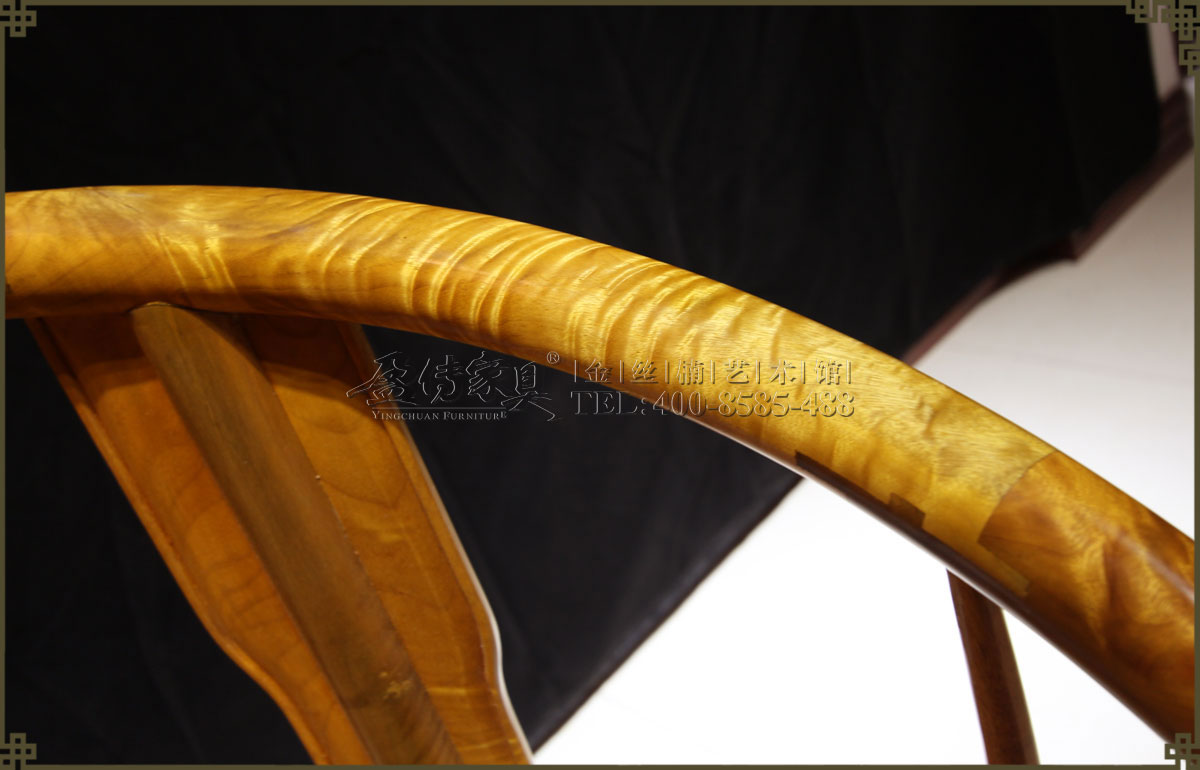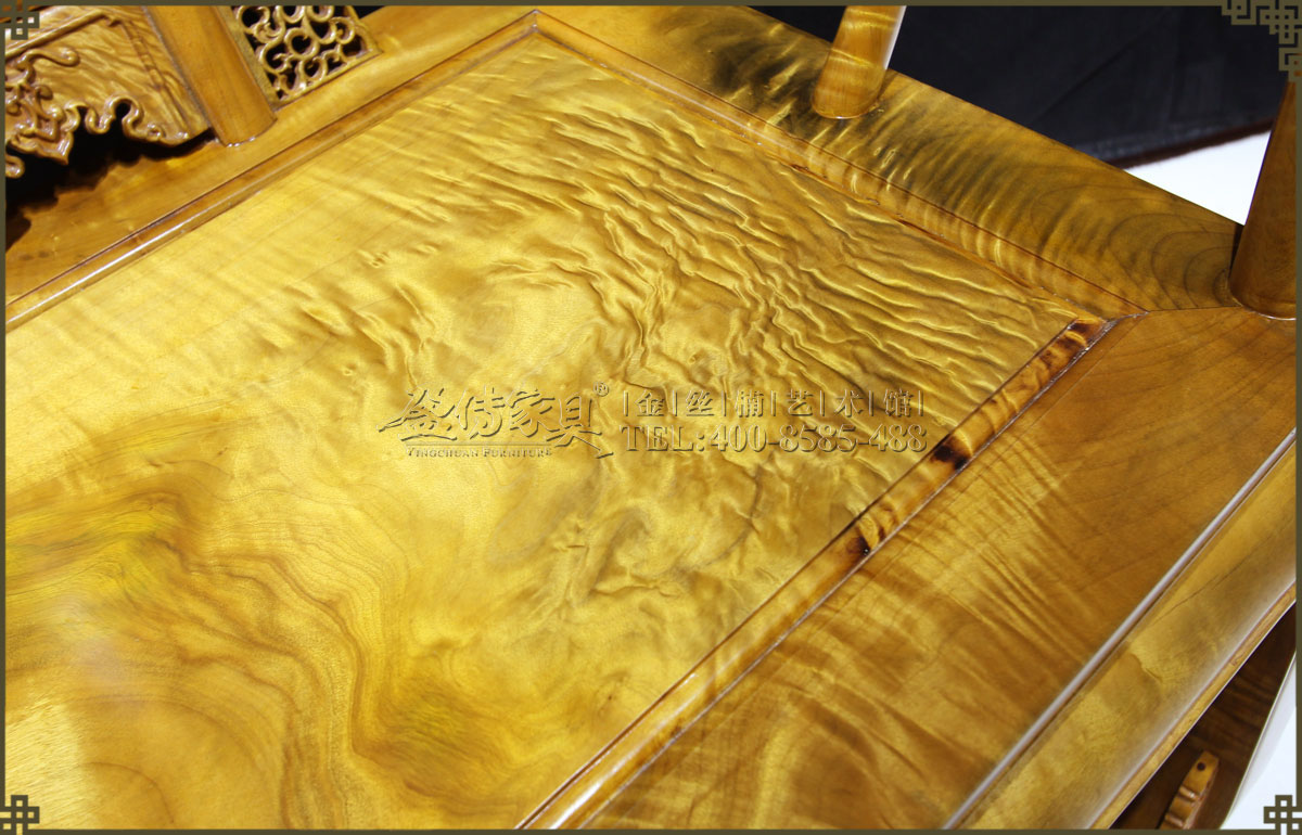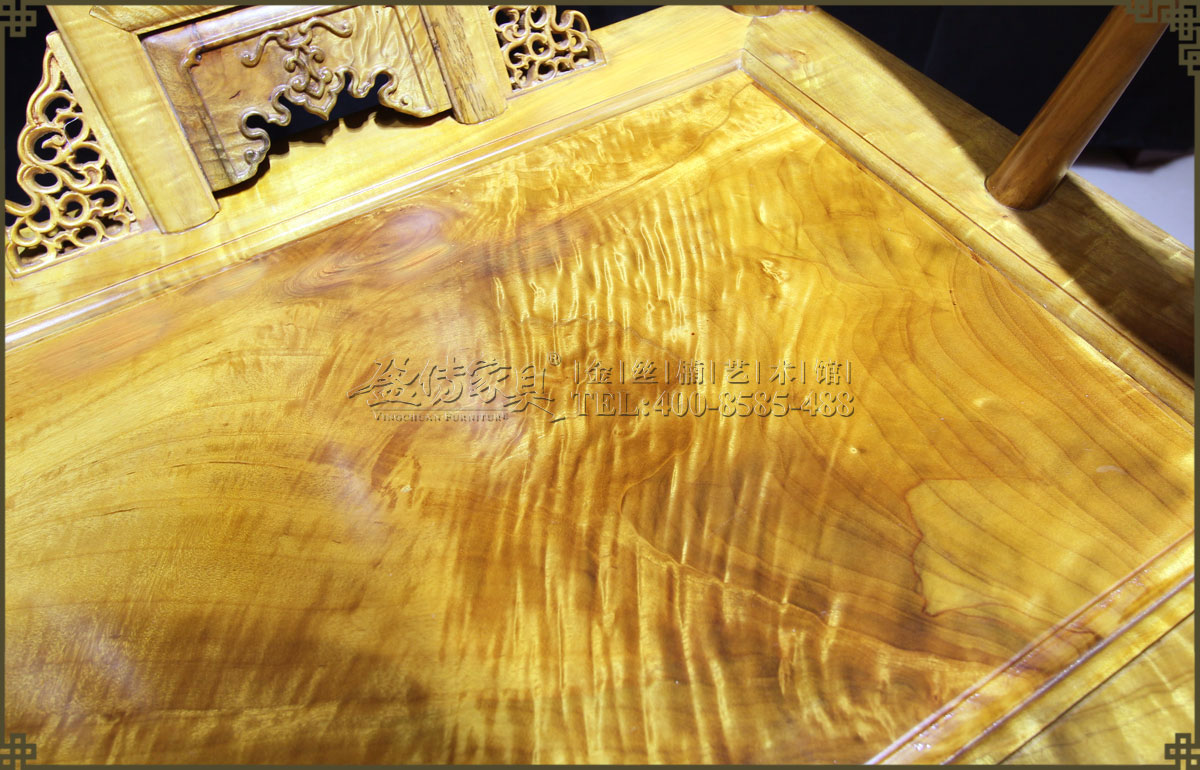 介紹:此皇宮椅選料精,采用上好的金絲楠,金絲成色高,光照下金黃奪目,璀璨眩美,紋理移步換景,如行云流水,又像波濤……做工考究精細,有束腰帶拖泥,靠背和扶手符合人體工程學,線條流暢,不失明式家具之風格。雕飾精美繁多,但不顯得繁瑣,實乃古典家具中的精品。