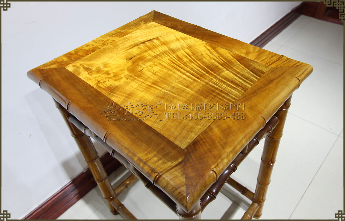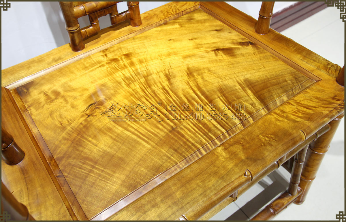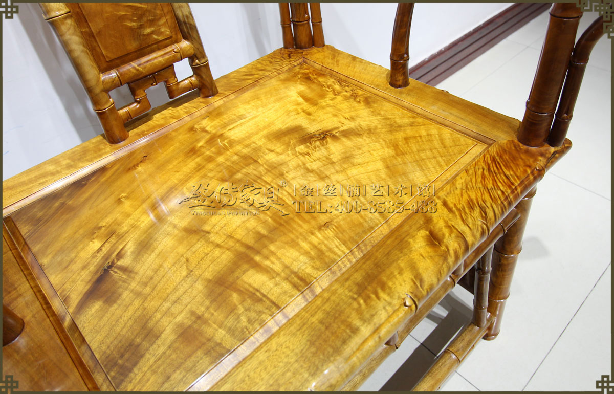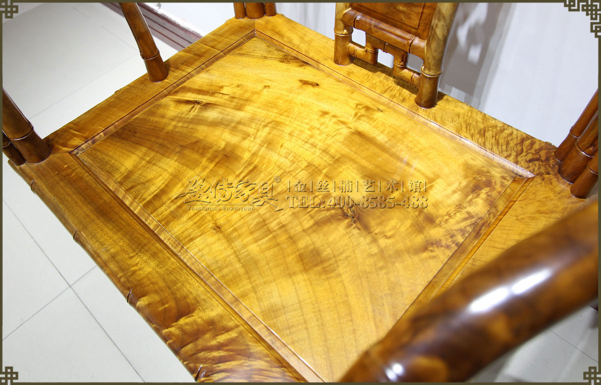 此金絲楠圈椅選材精美,使用上等金絲楠,金絲飽滿,水波紋尤其豐富密集,清晰充滿層次感和立體感,形成一種夢幻般的美。
