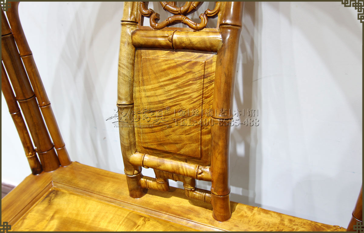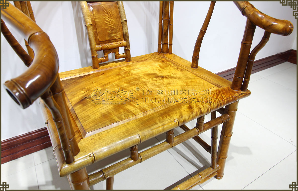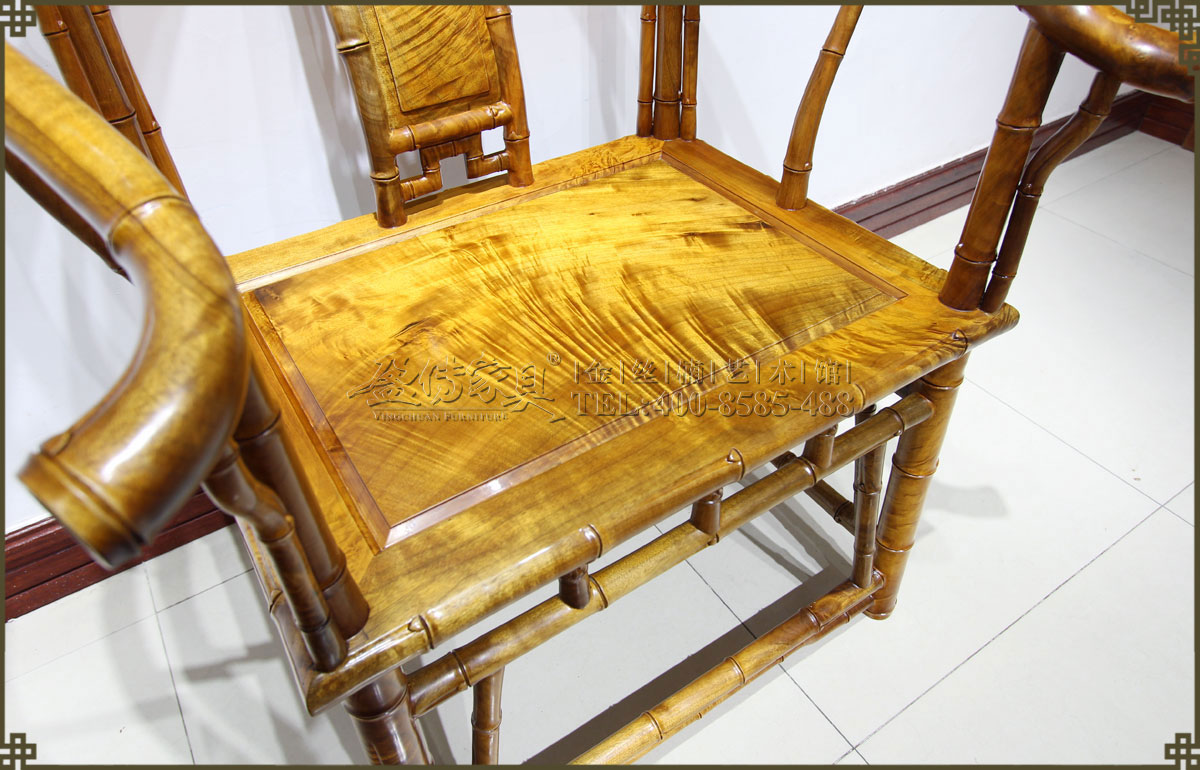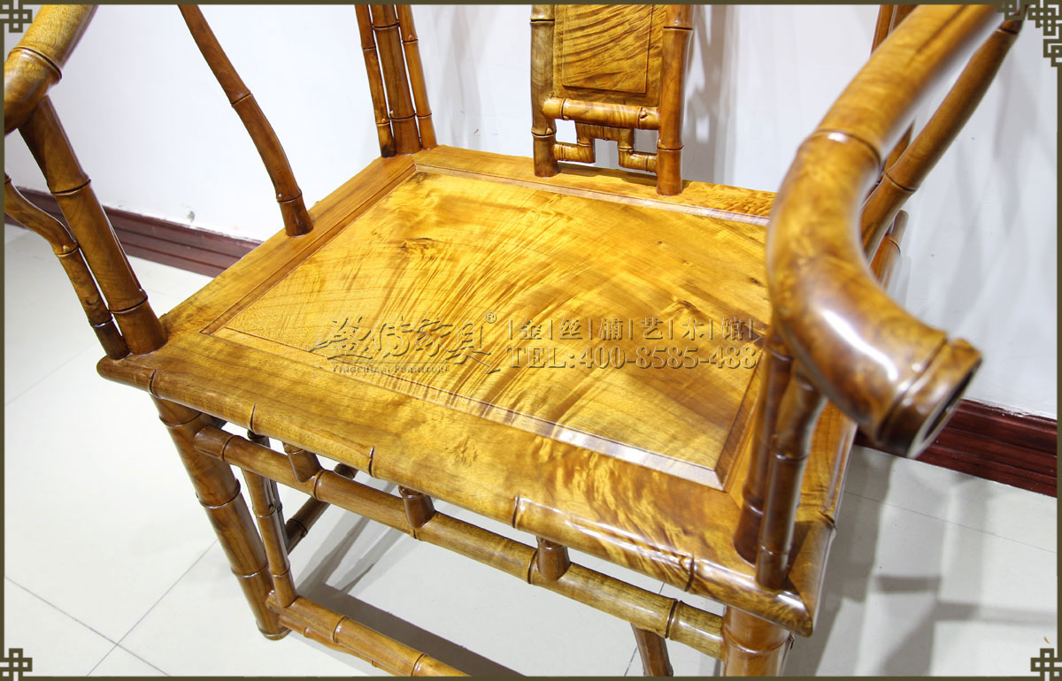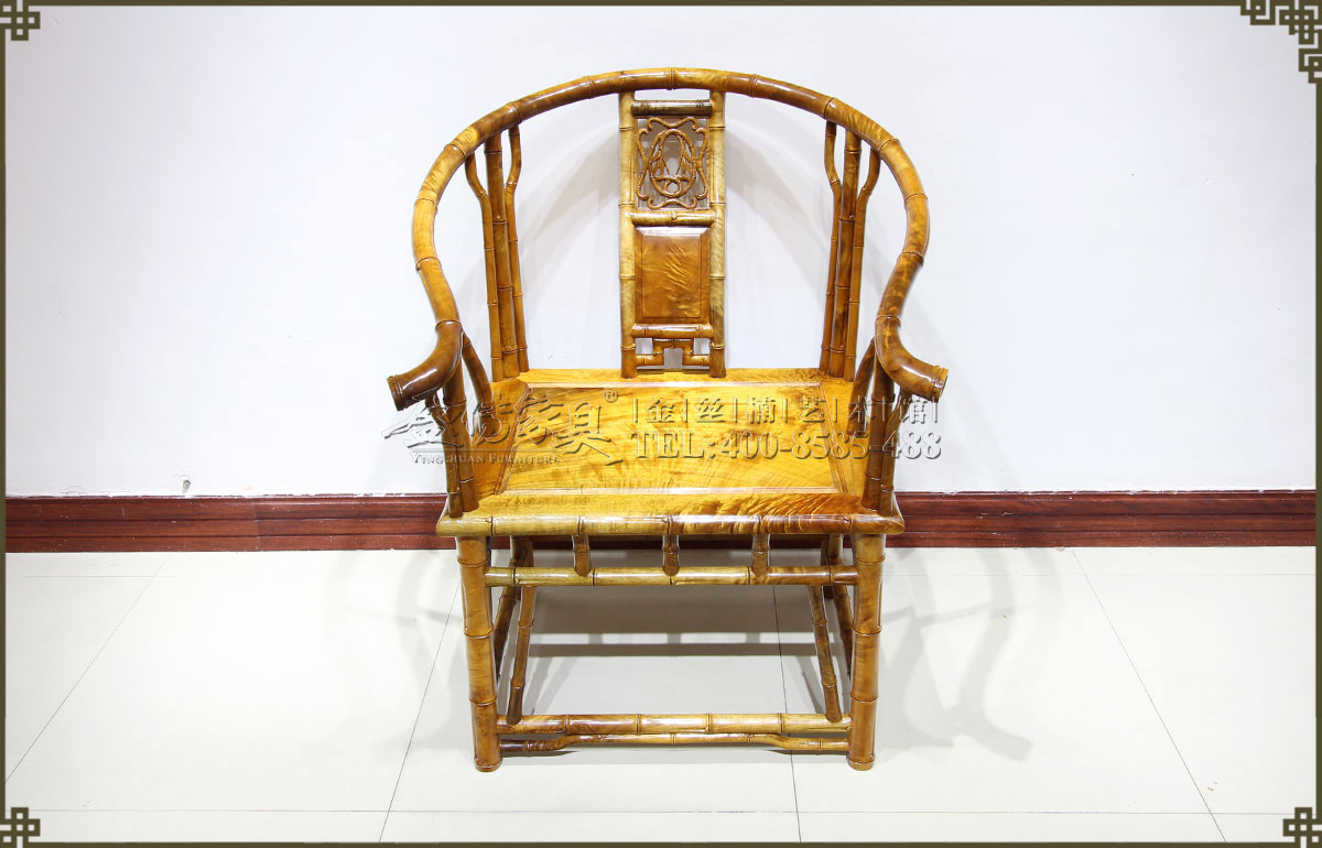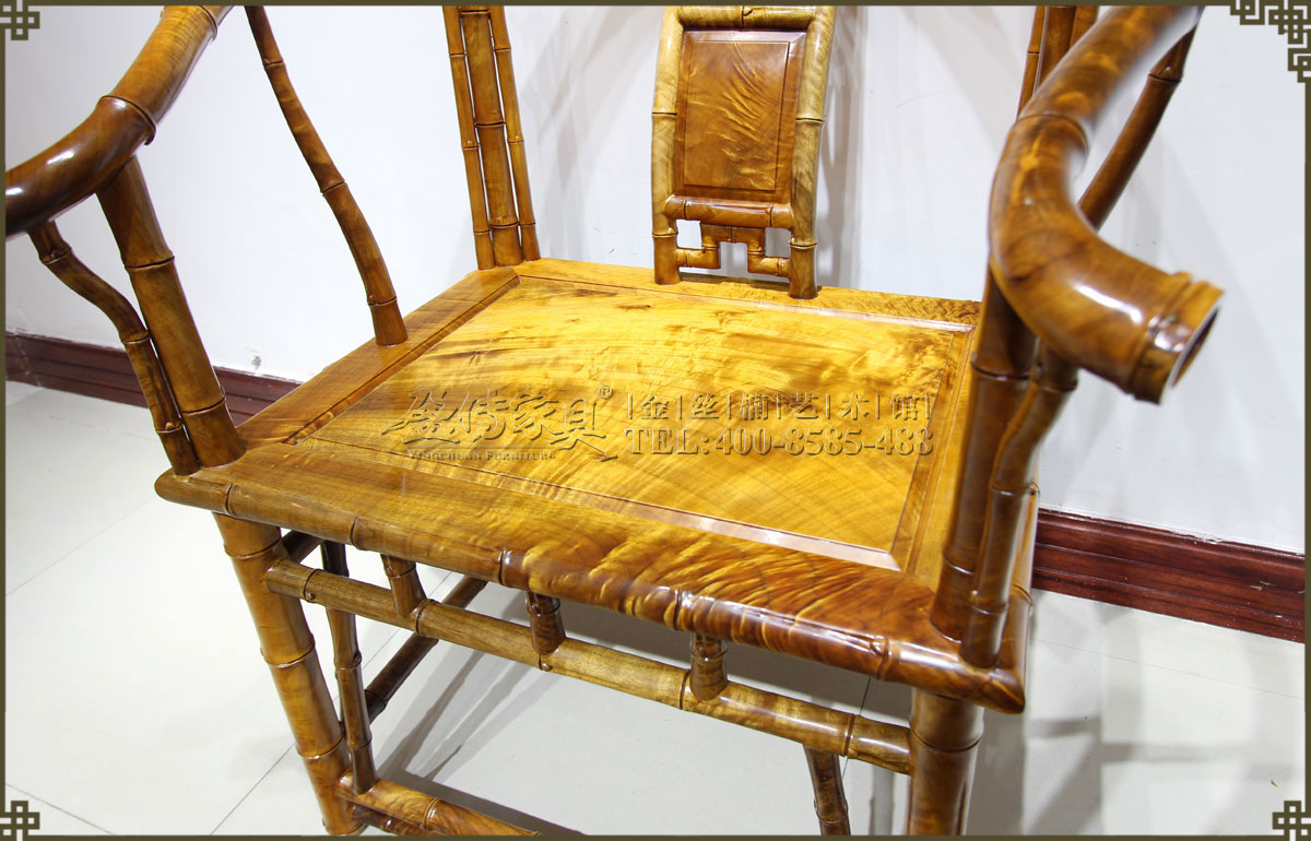 匠心獨運,做工非常細致,榫卯嚴密,全身雕竹節,竹節圓潤協調,皆下短上長,層次有致,尤其是扶手盡端,按竹管截口雕制,維妙維肖,充滿生氣。造型獨特,剛柔相濟,高潔清雅,有著極高的收藏價值和欣賞價值,深受文人雅士青睞。