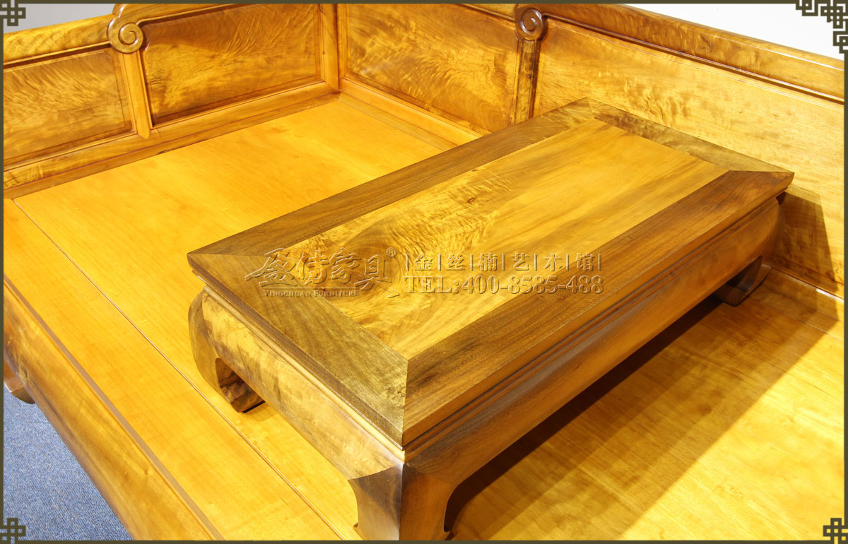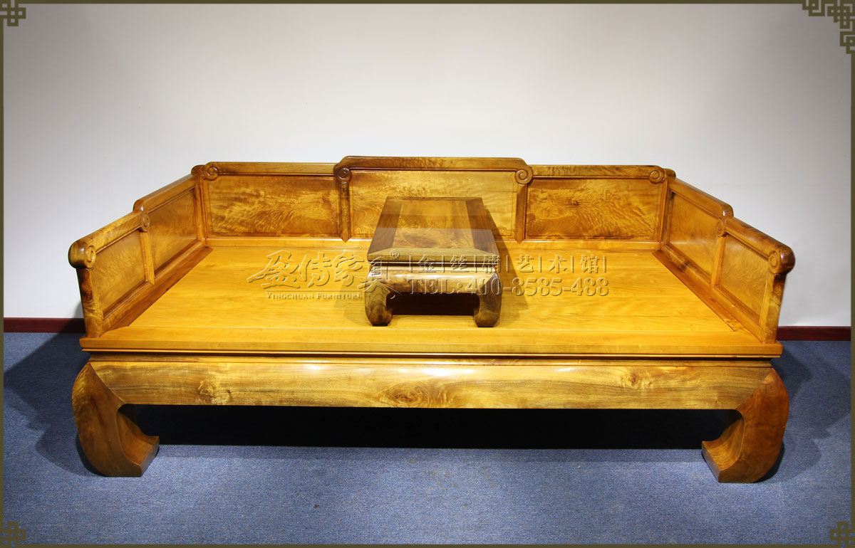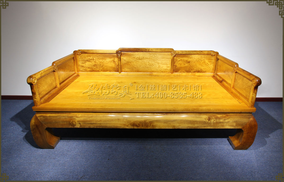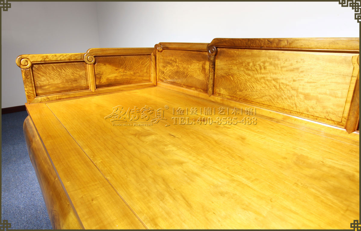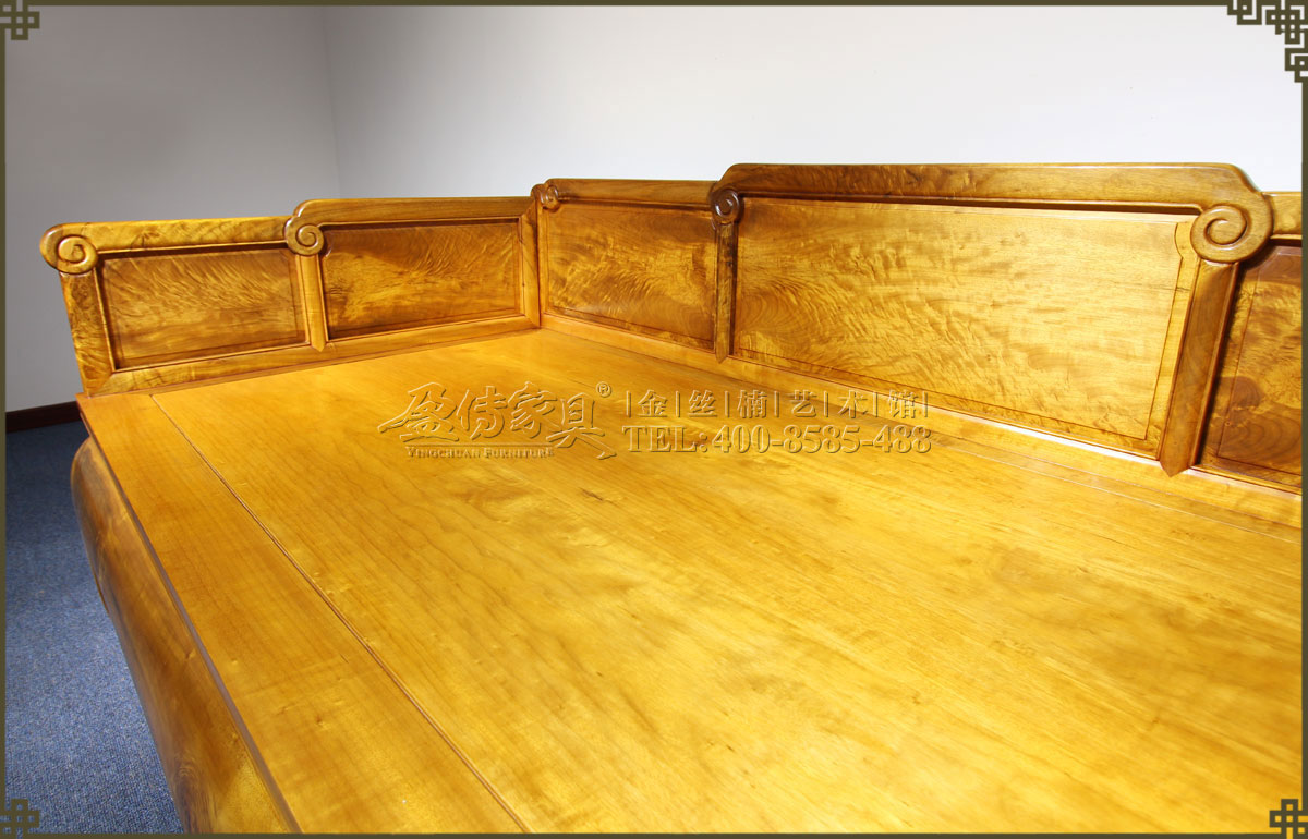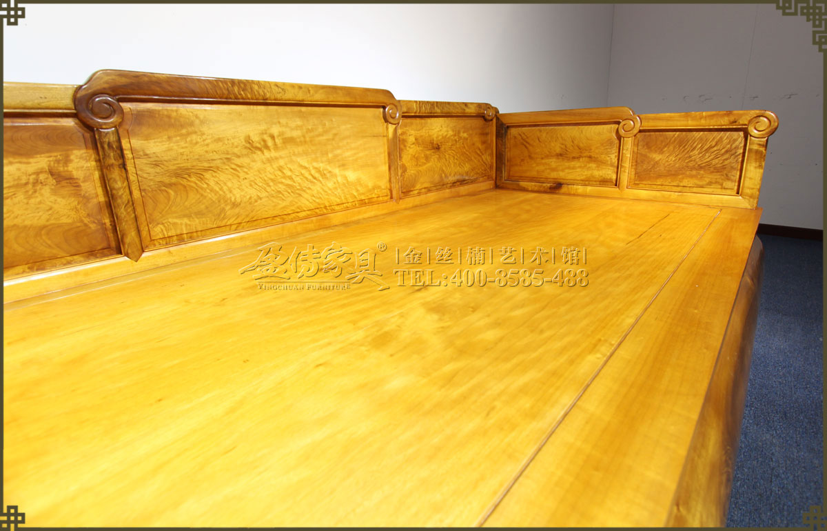 床圍采用七圍式,配置小炕幾,下設(shè)打洼束腰,鼓腿彭牙,內(nèi)翻馬蹄足,腿足用料碩大,沉雄厚實(shí),抓地極穩(wěn)。整體造型穩(wěn)重大氣,渾厚大方,威嚴(yán)端莊,具有極高的收藏價(jià)值。