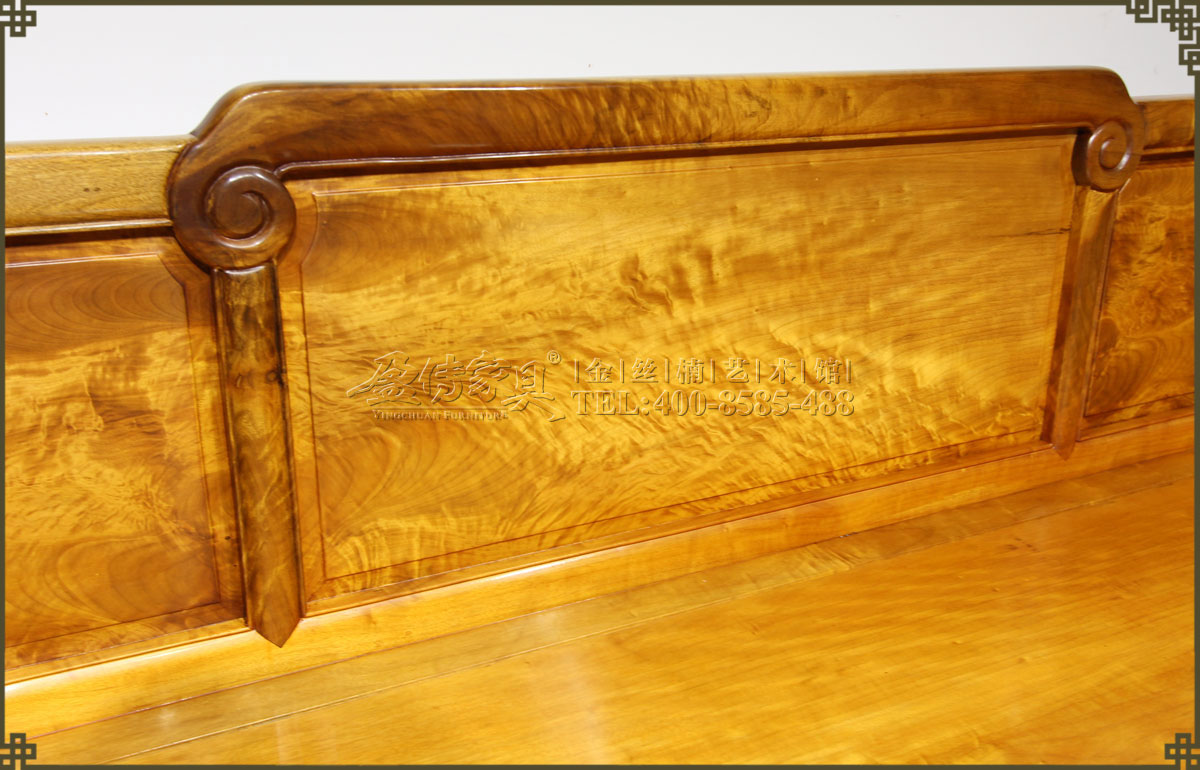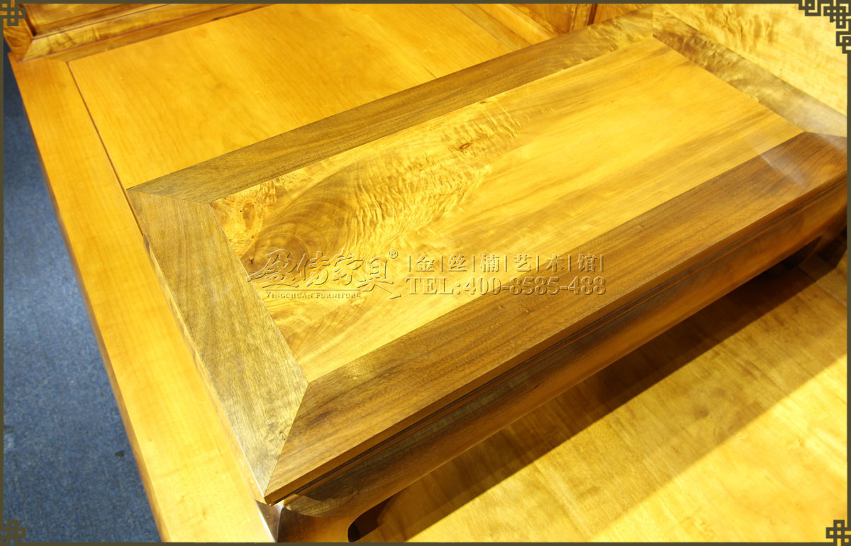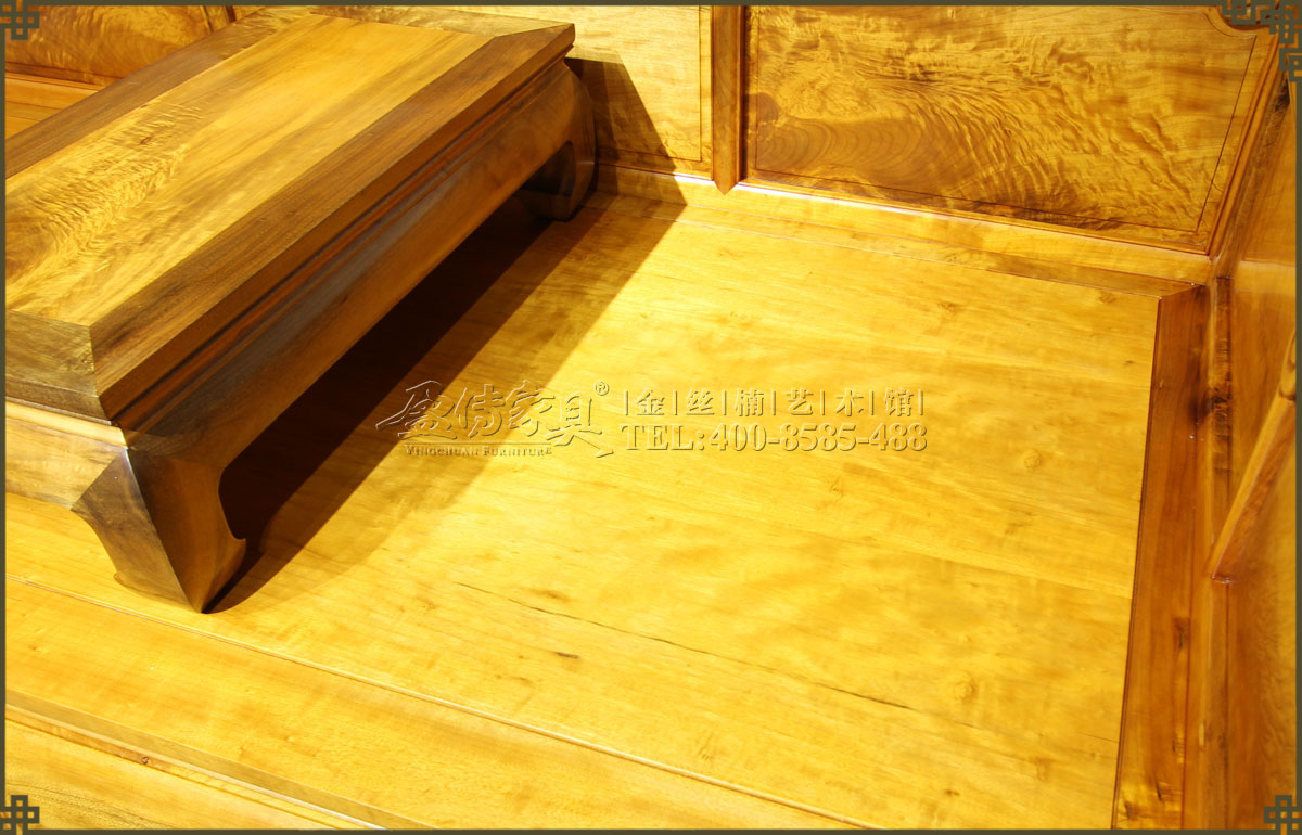 此金絲楠羅漢床最?yuàn)Z目的是七塊圍板都有非常漂亮的水波紋,密集而有立體感,清晰而有層次感,移步換景,各個(gè)角度看都令人震撼,猶如一幅幅天然的藝術(shù)畫,美到極致。更驚奇的是炕幾的面板的天然水波紋形成一條“金龍魚”的圖案,栩栩如生,活靈活現(xiàn),獨(dú)一無二,預(yù)兆著“如意吉祥”,是非常難得的金絲楠精品。